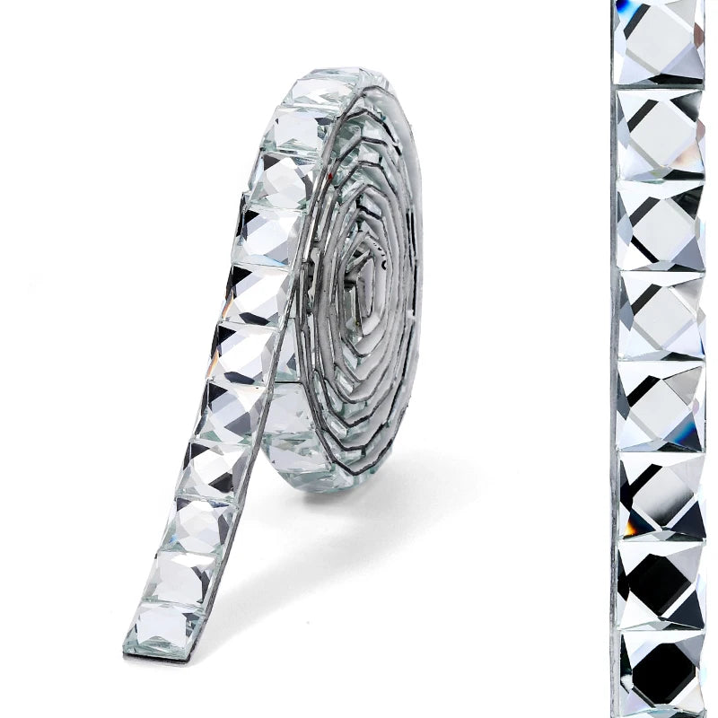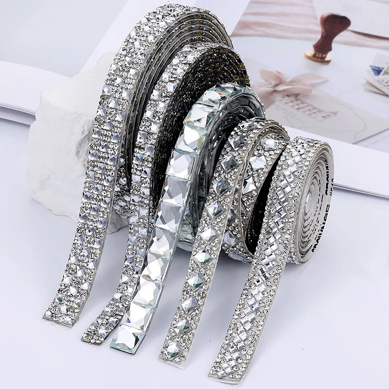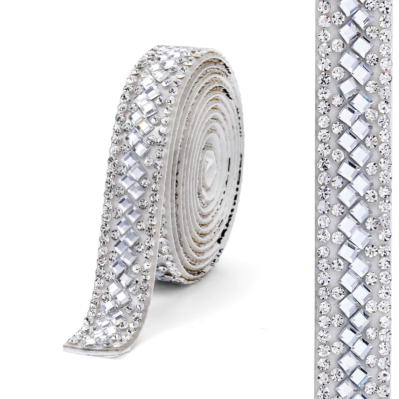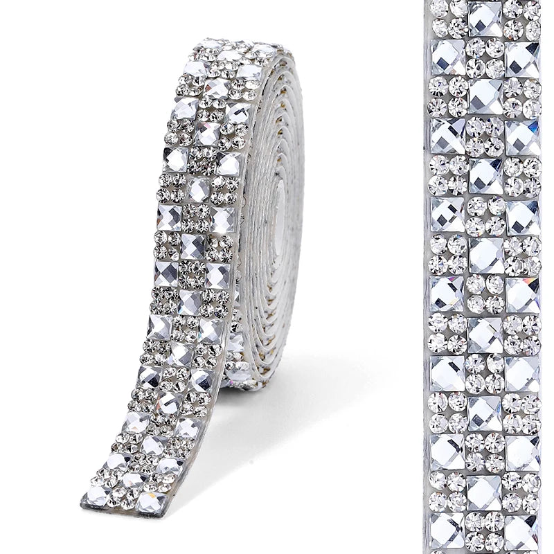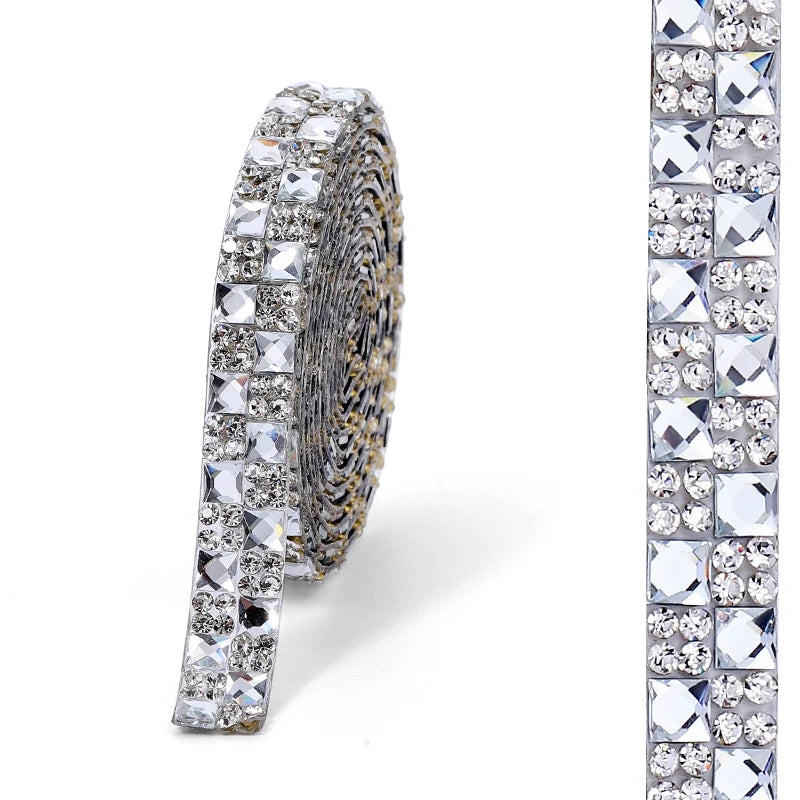 Olika strass tejp med fyrkantiga strass plattor varvat med små strass stenar silverfärgade . Läcker strasstejp med färdig klistrad baksida som du kan fästa på alla material att göra om skor väskor, ljus lyktor , vas lådor etc.
