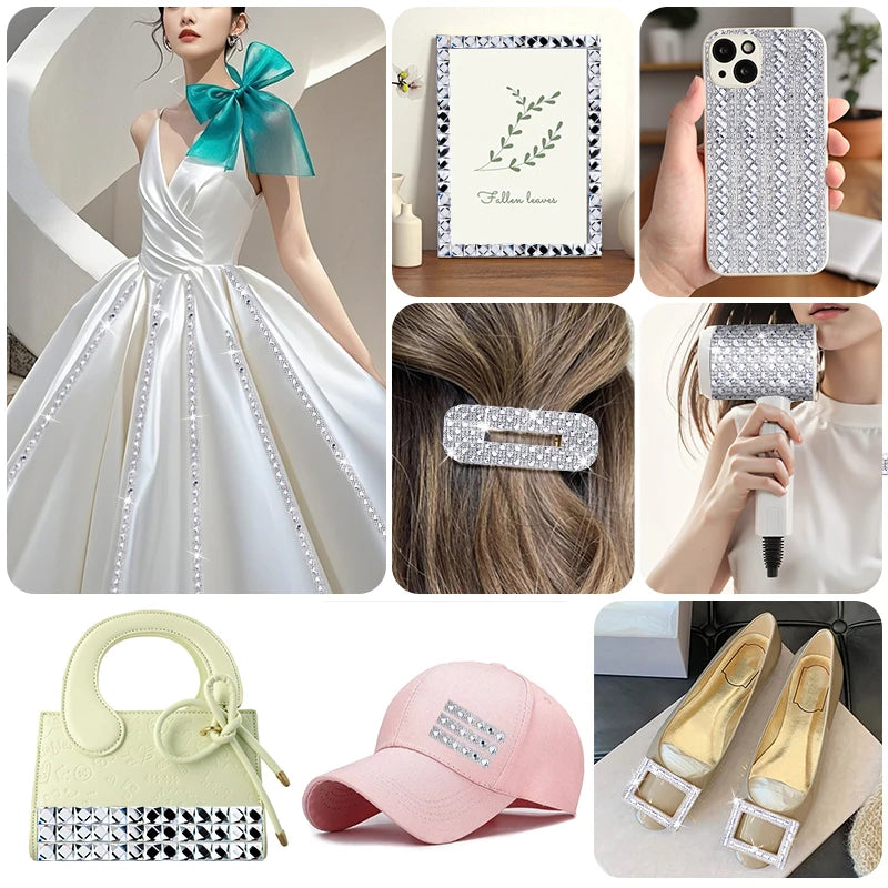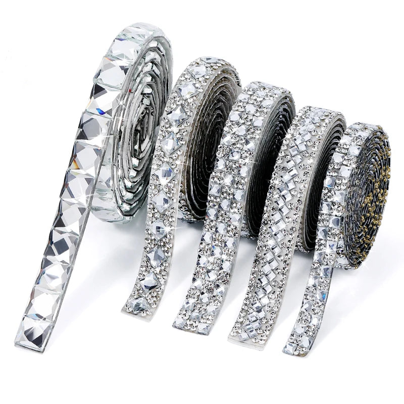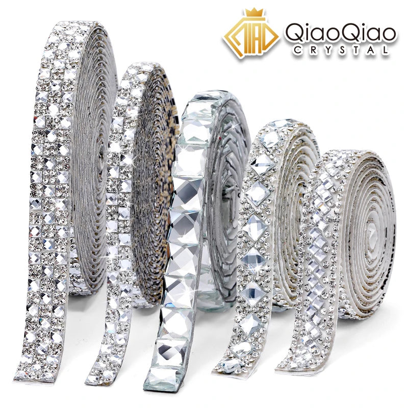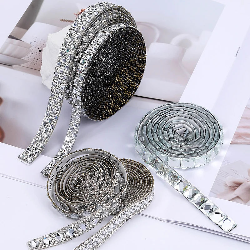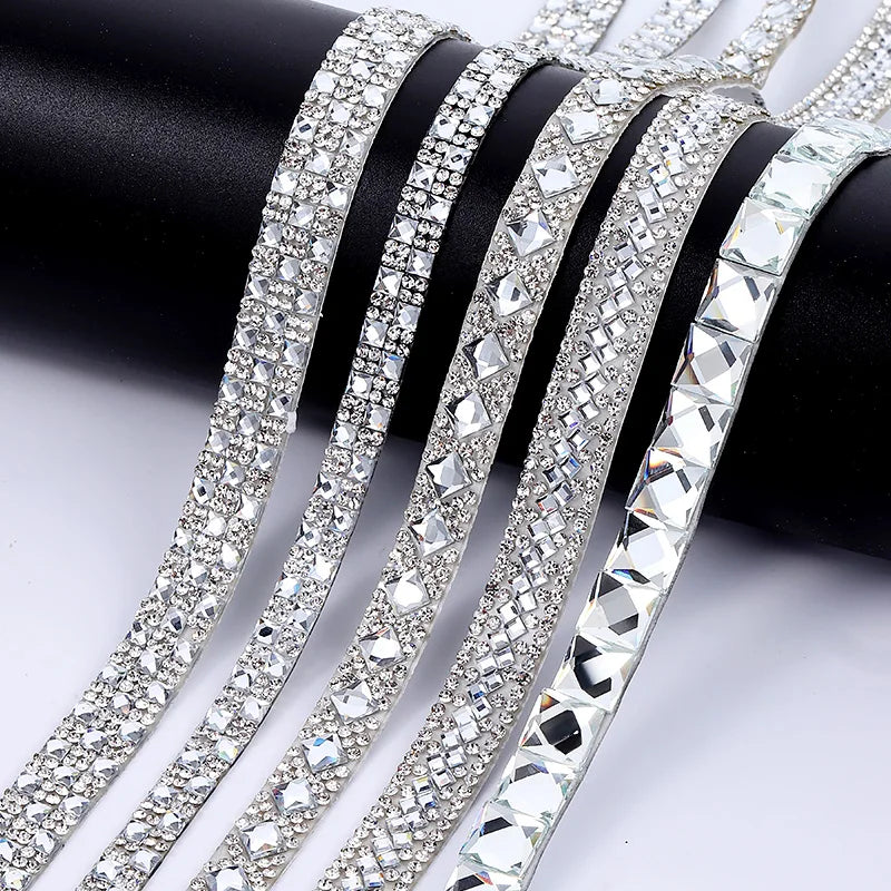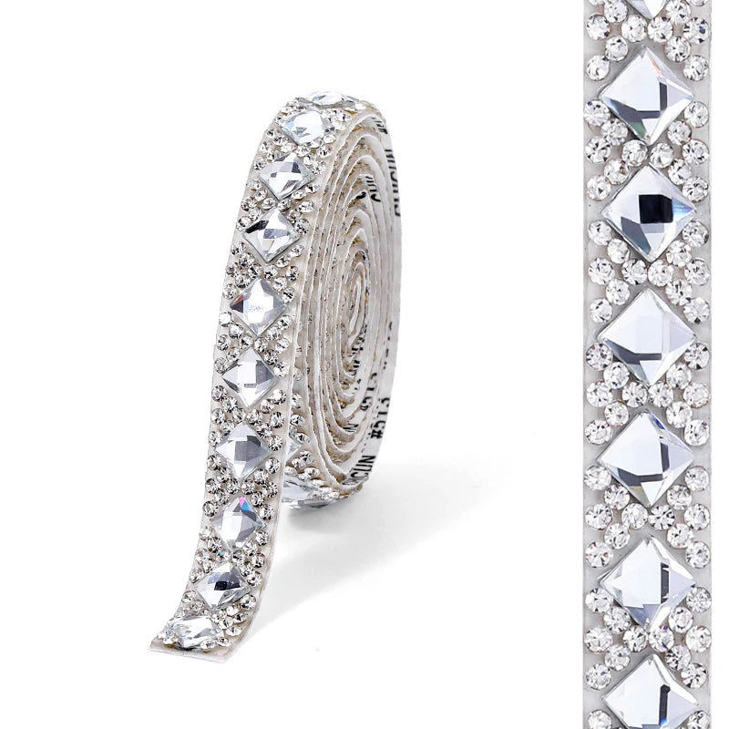 Olika strass tejp med fyrkantiga strass plattor varvat med små strass stenar silverfärgade . Läcker strasstejp med färdig klistrad baksida som du kan fästa på alla material att göra om skor väskor, ljus lyktor , vas lådor etc.