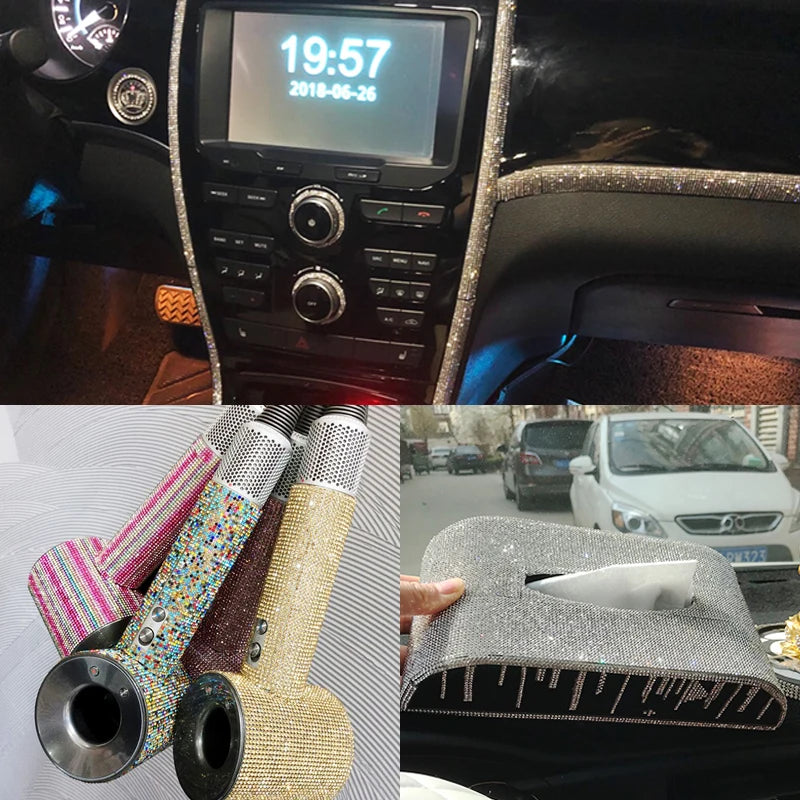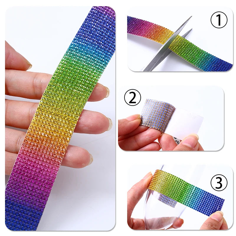 strass tejpen har trekantiga små strass stenar gjorda av resin, de är lätt att klippa med sax och du kan fästa dit tejpen på alla material.