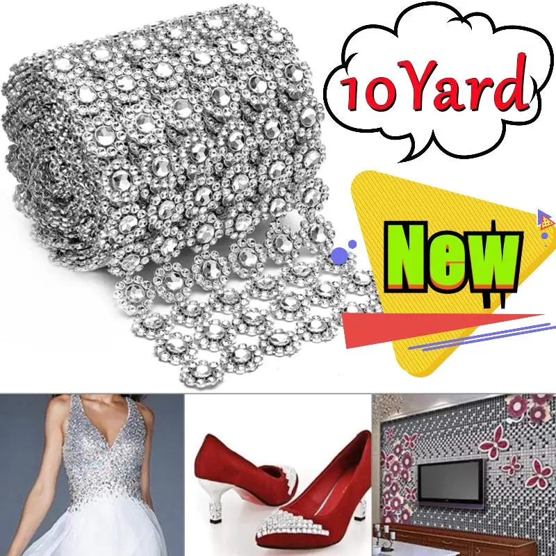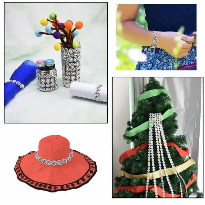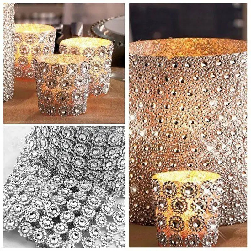 Rhinestone ribbon with large round rhinestones in silver. The ribbon is 10cm wide and can be chosen at 4.1M or 2.7M. You need to use glue to attach the ribbon. They are easy to cut both in width and length.