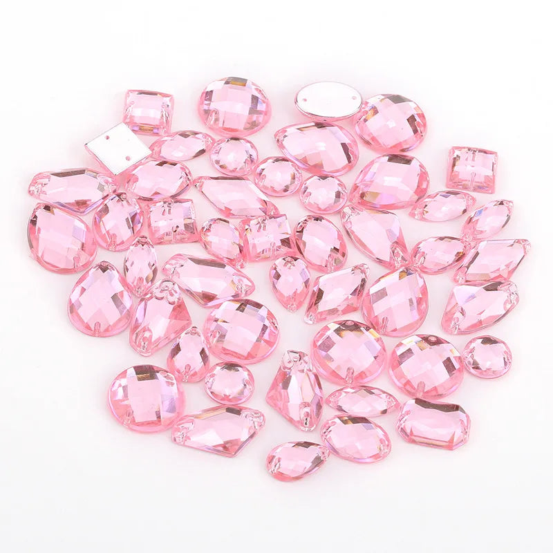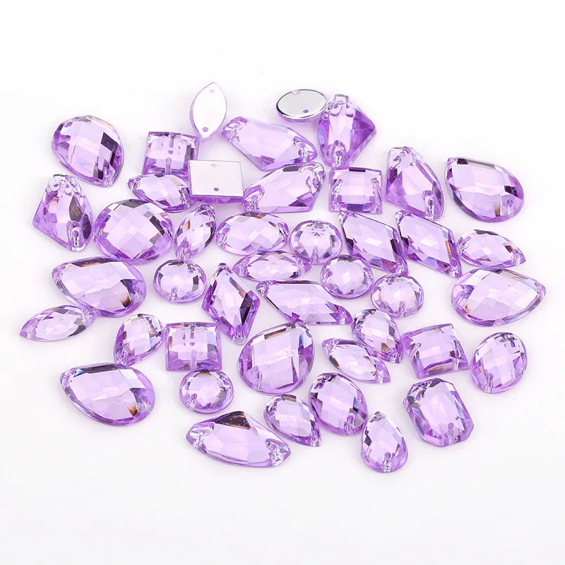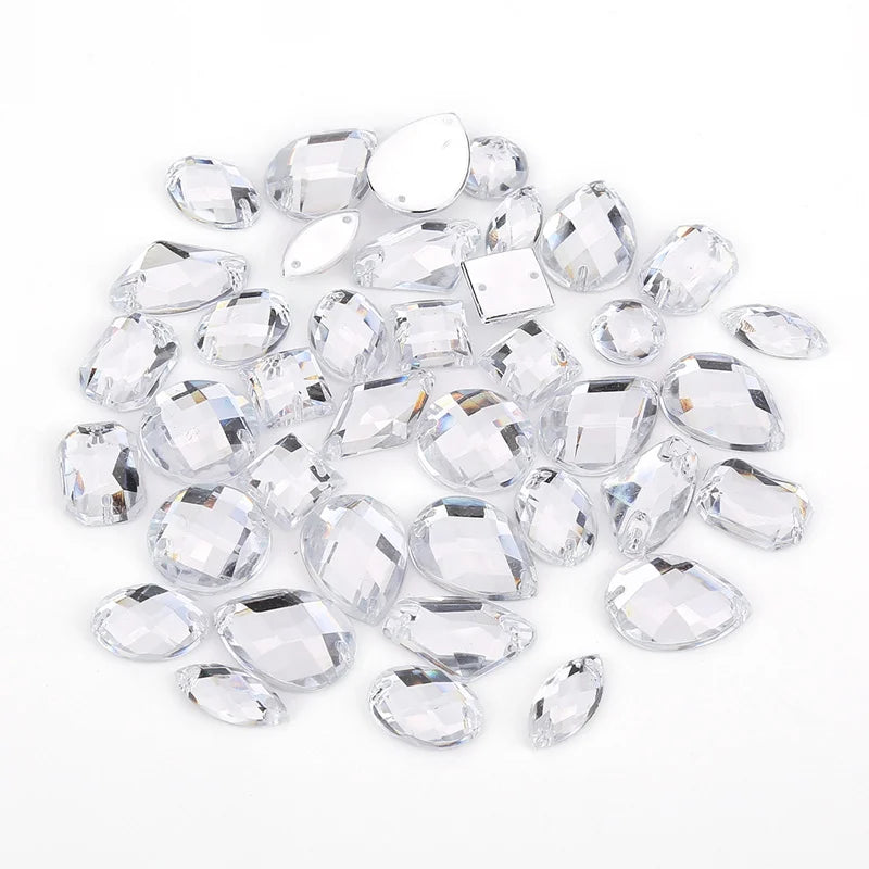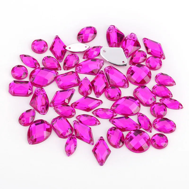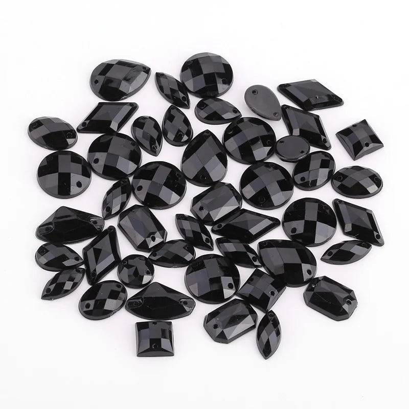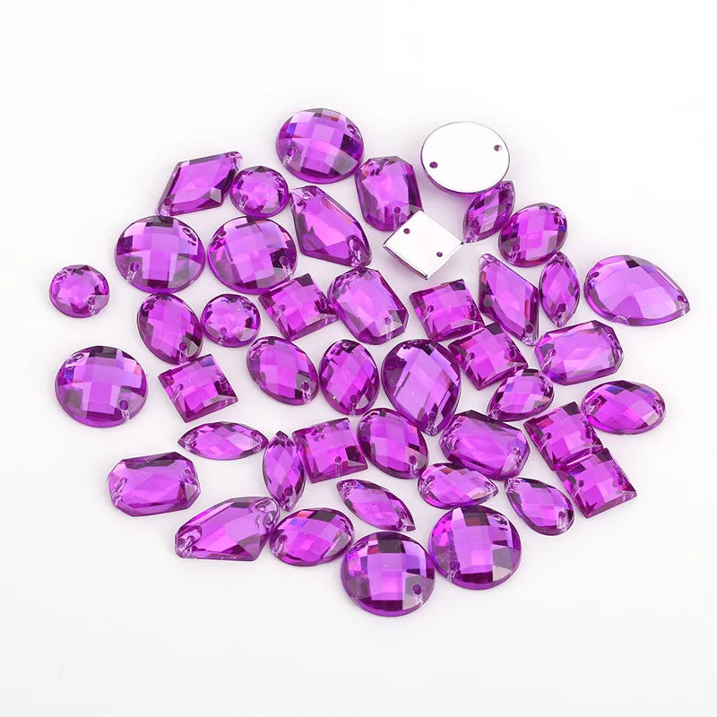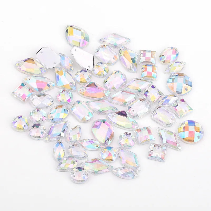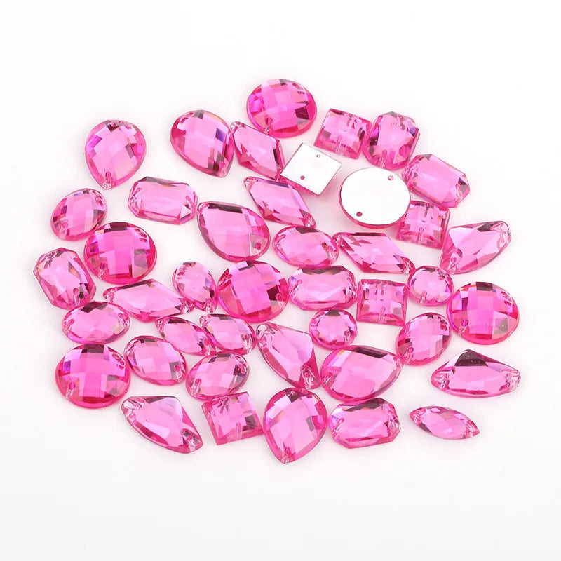 100 rhinestones in different shapes and sizes that you sew onto fabric to attach the stones. The rhinestones have holes at the top and bottom and are between 10-18mm in size. There are 24 different colors to choose from.