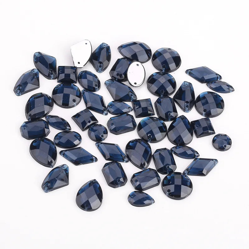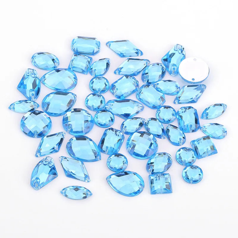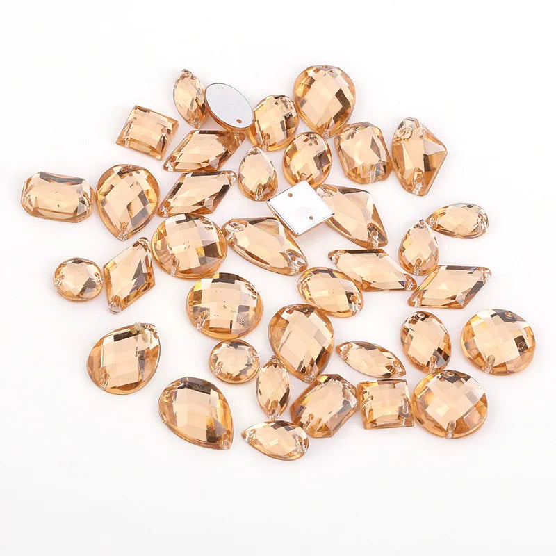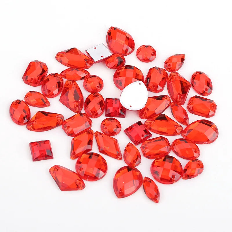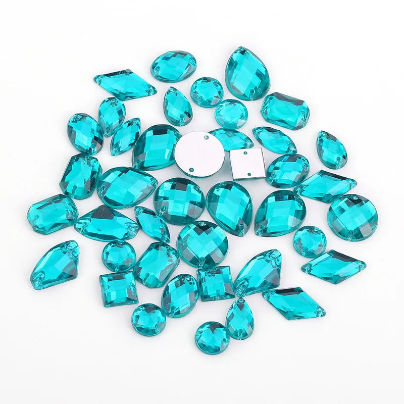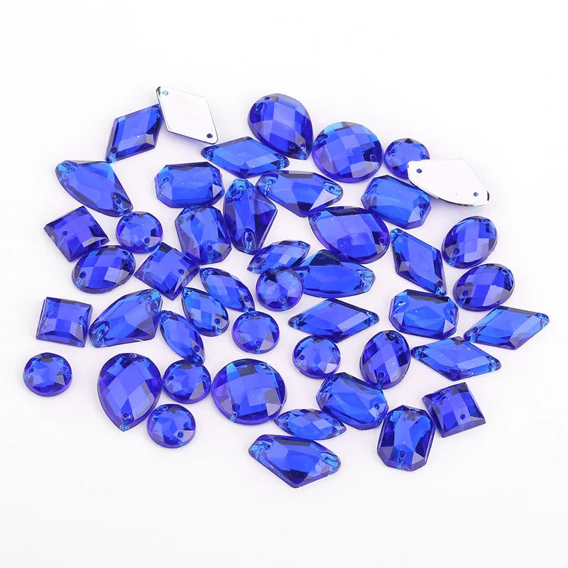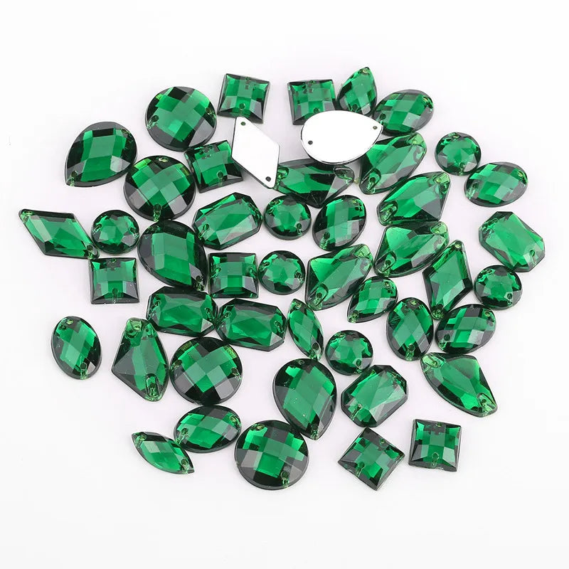 100 rhinestones in different shapes and sizes that you sew onto fabric to attach the stones. The rhinestones have holes at the top and bottom and are between 10-18mm in size. There are 24 different colors to choose from.