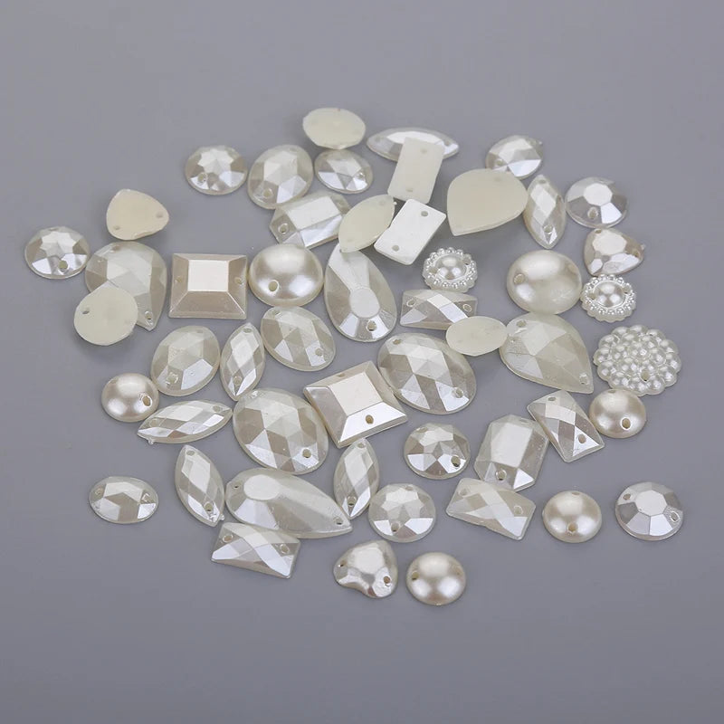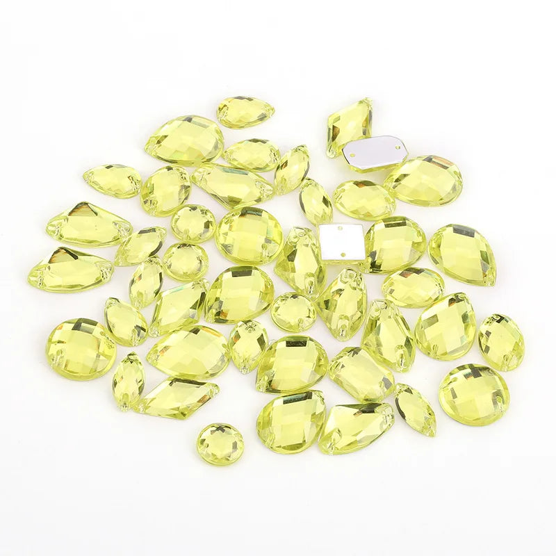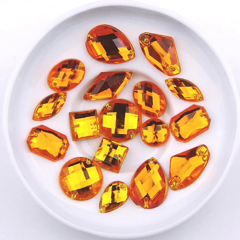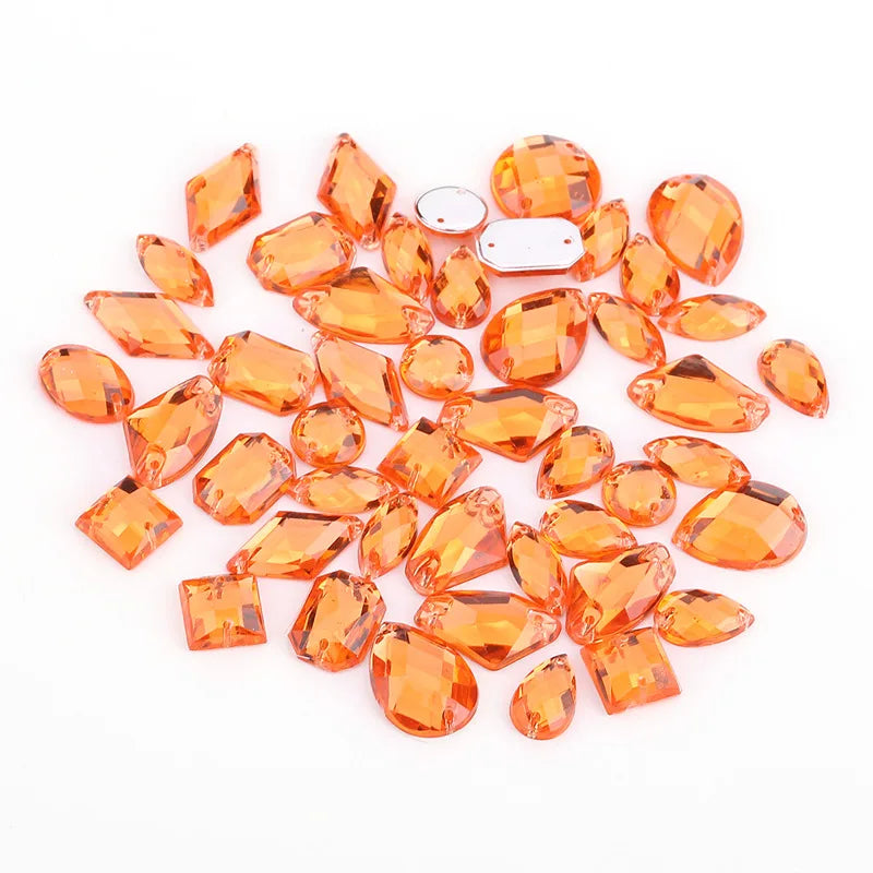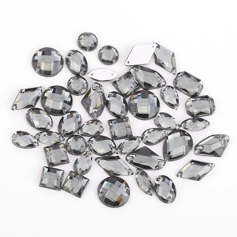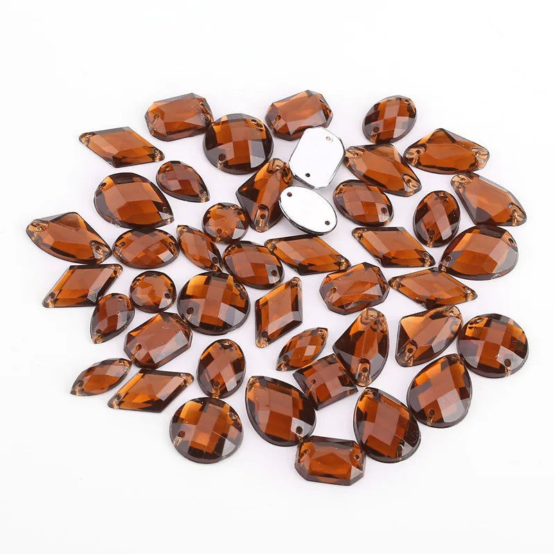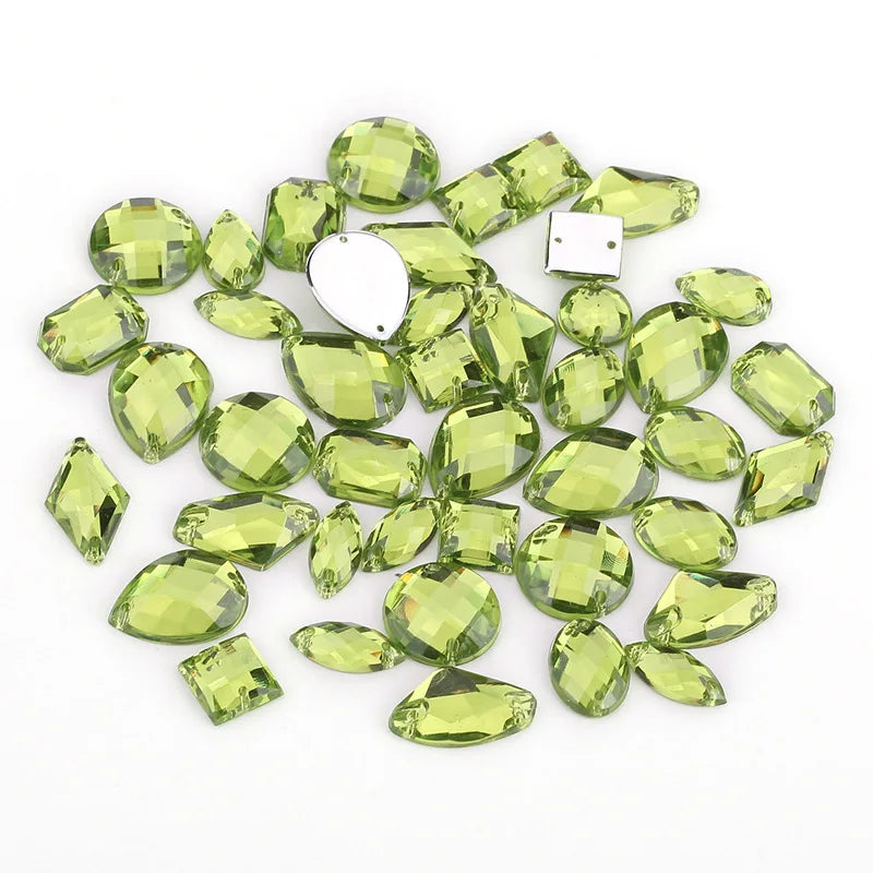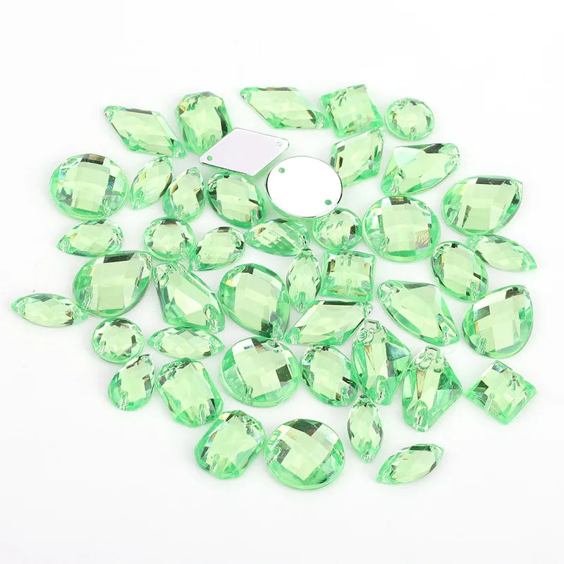 100 rhinestones in different shapes and sizes that you sew onto fabric to attach the stones. The rhinestones have holes at the top and bottom and are between 10-18mm in size. There are 24 different colors to choose from.