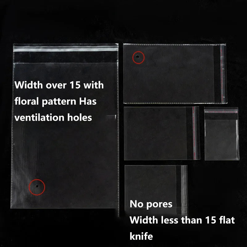 Packaging with cellophane bags in different sizes that are transparent and have a pre-glued edge at the top. Bags to store things in, shipping bags for smaller items.