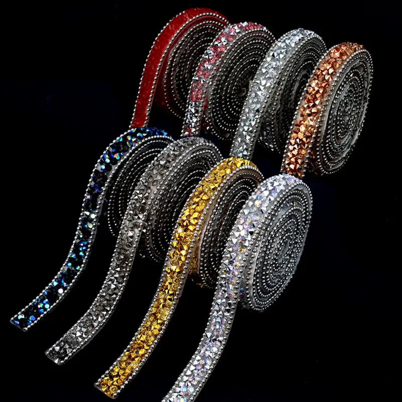 Strasstejp i färgens Röd Silver Guld Svart Roseguld Roseröd Grå som är 1 cm bred och kommer på 9M långt.
