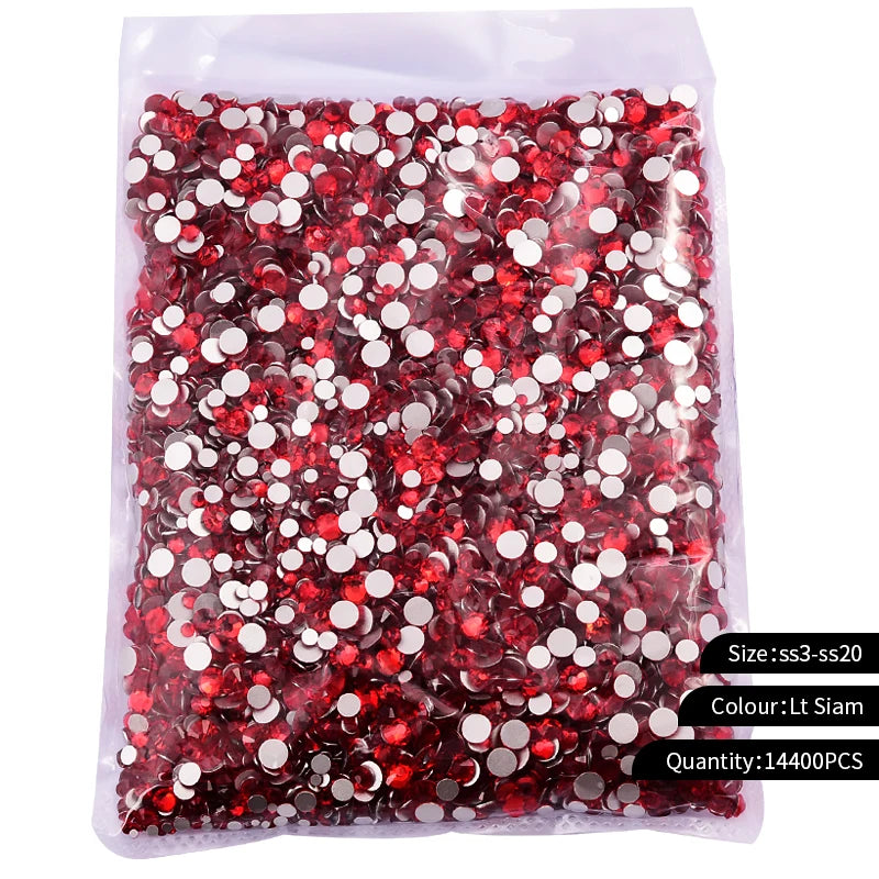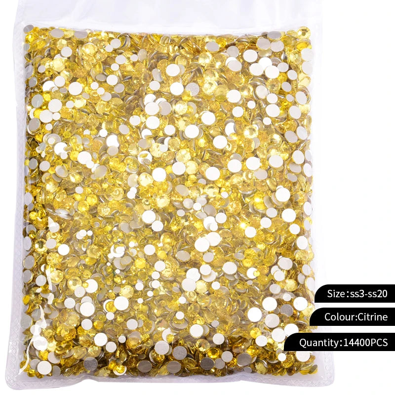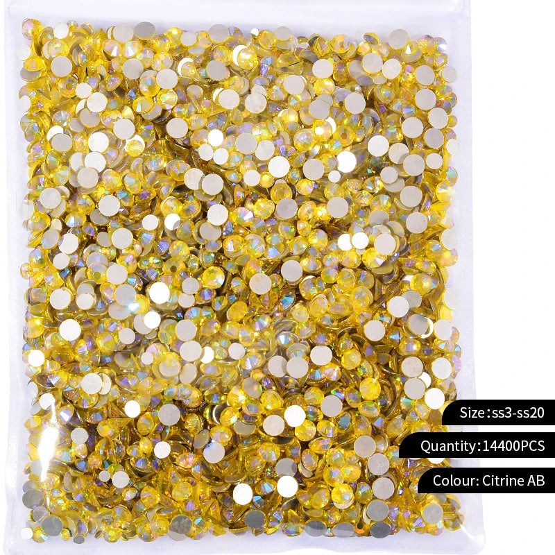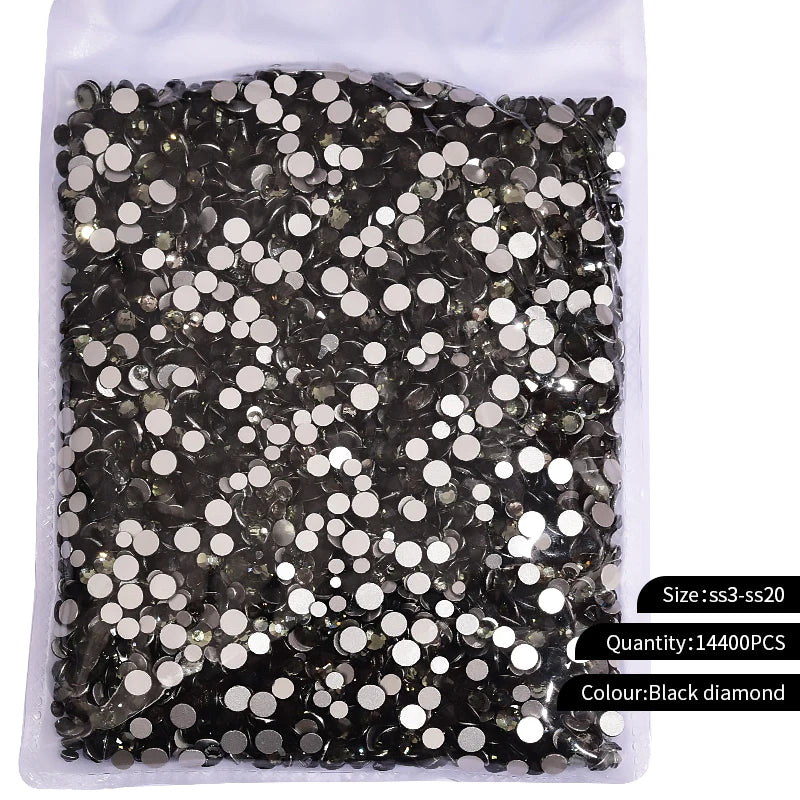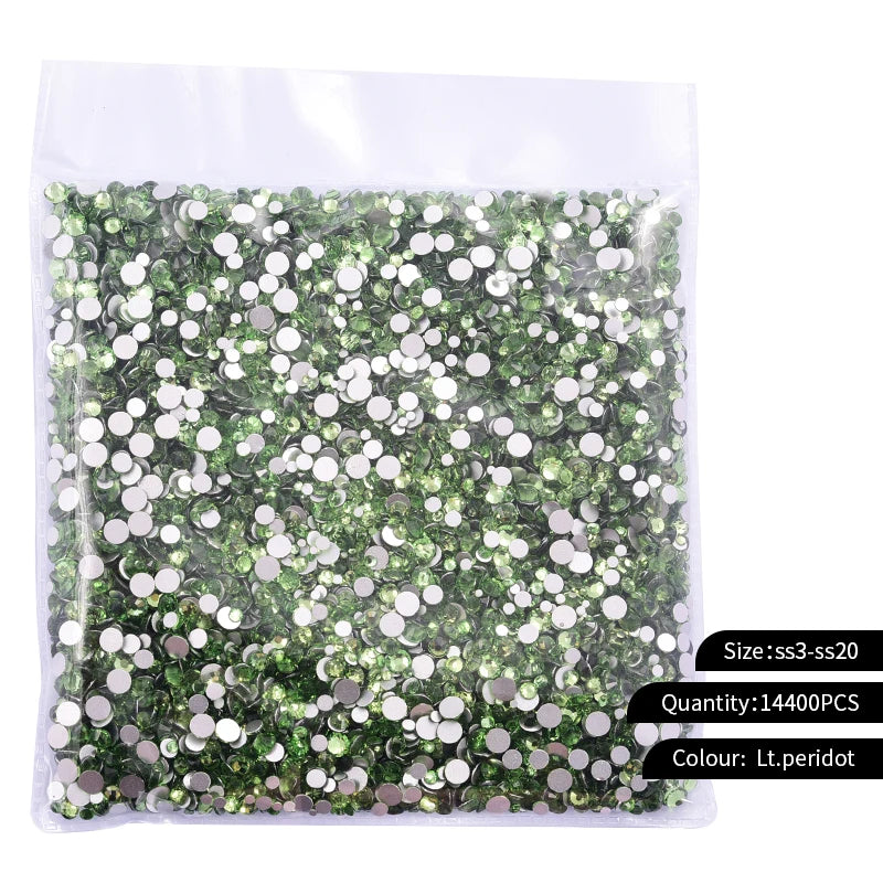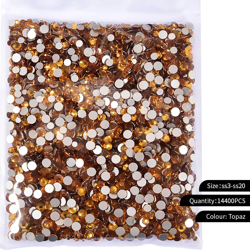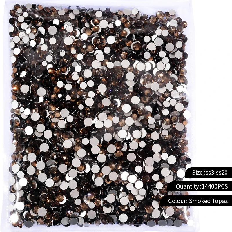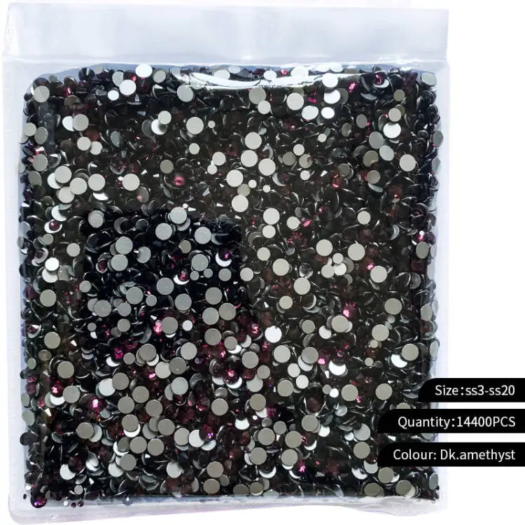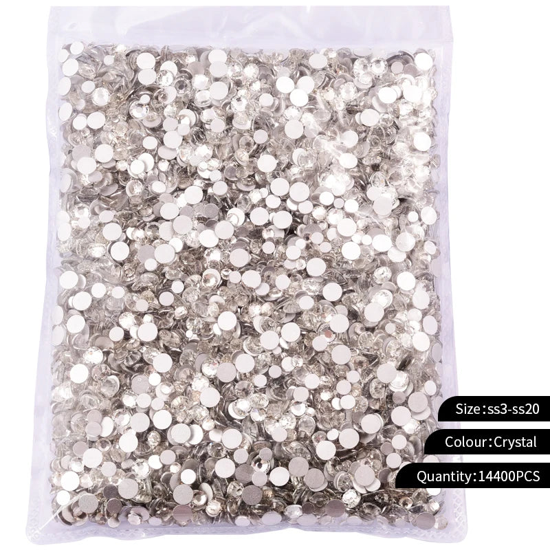 Storpack med strass stenar som har platt baksida och facetterad framsida där varje förpackning har 14400st stenar.