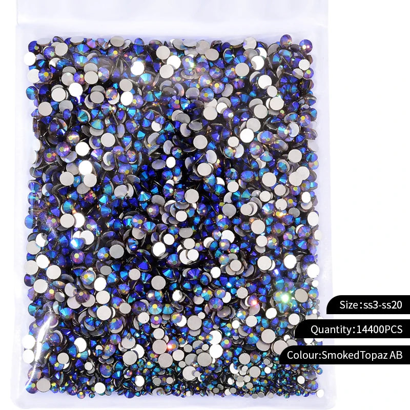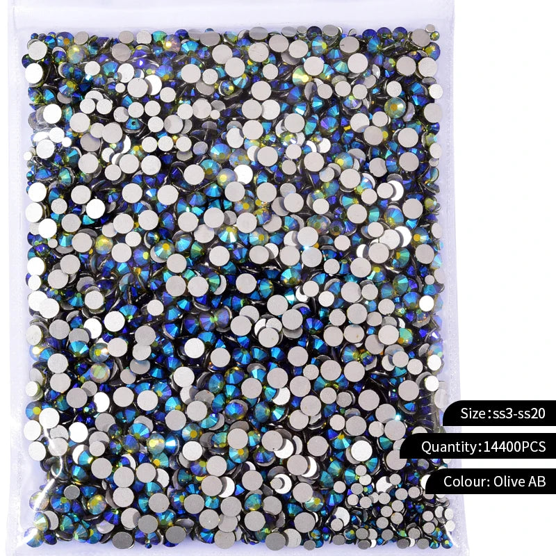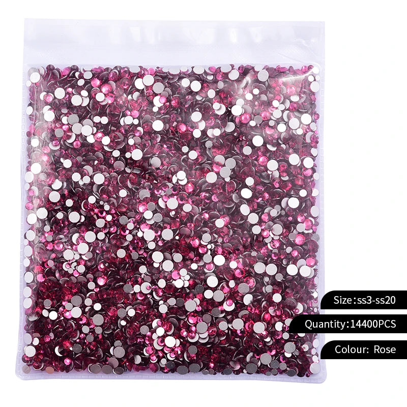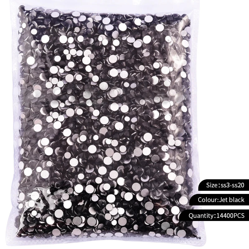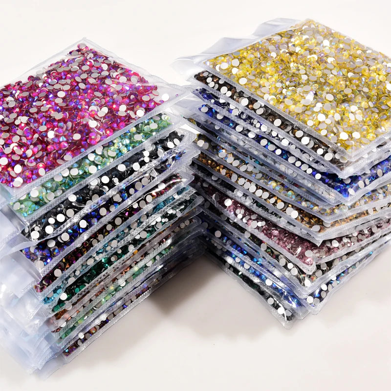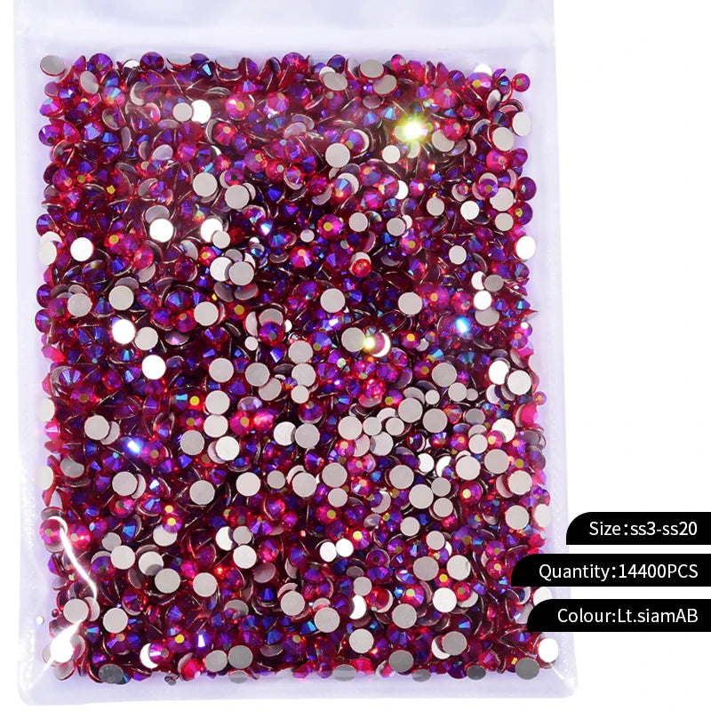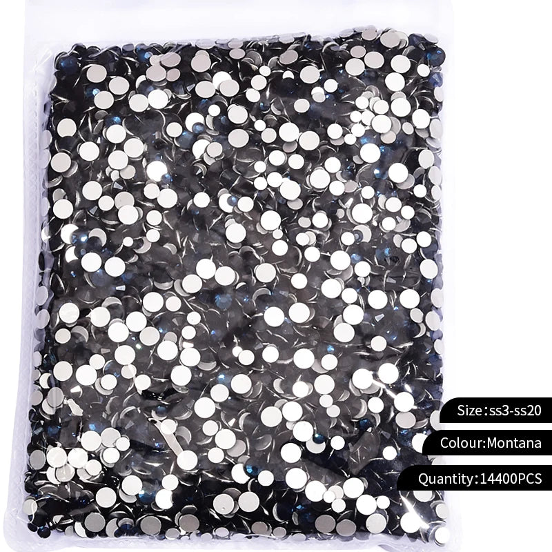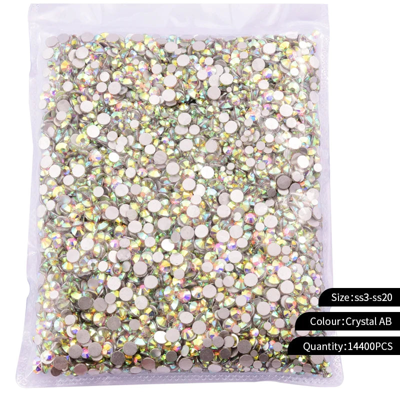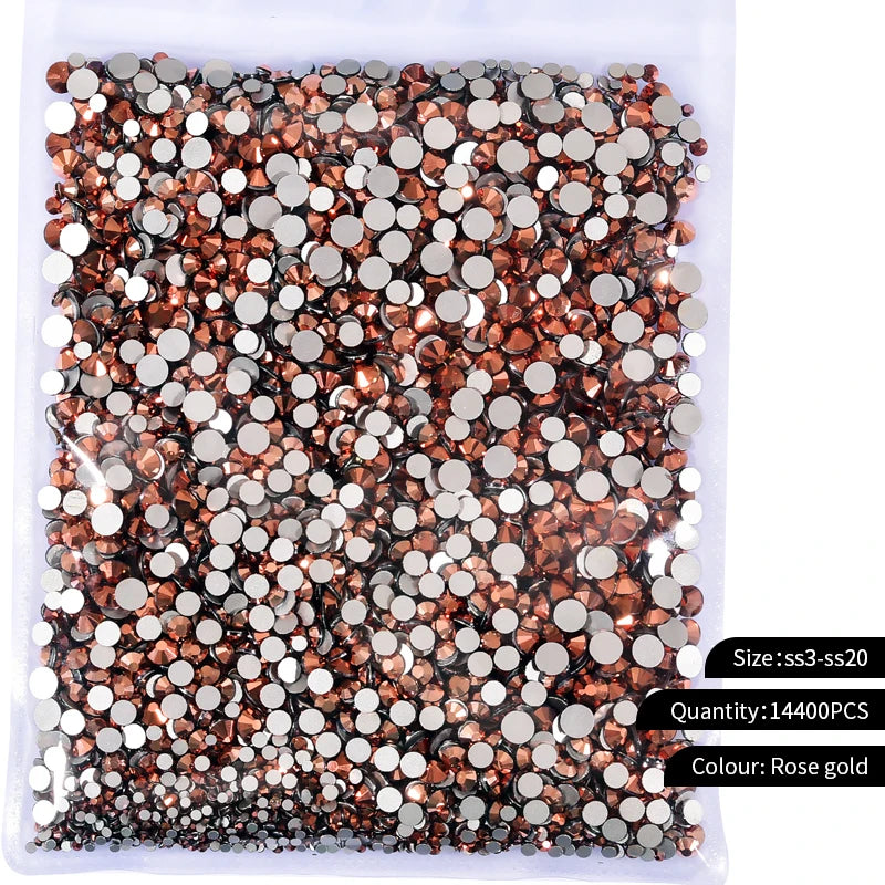 Storpack med strass stenar som har platt baksida och facetterad framsida där varje förpackning har 14400st stenar.