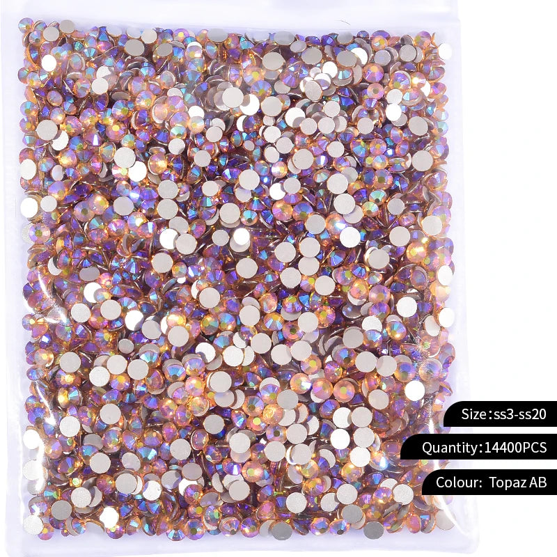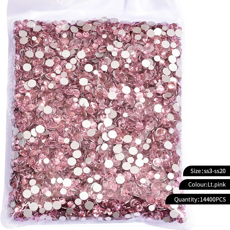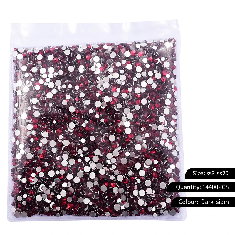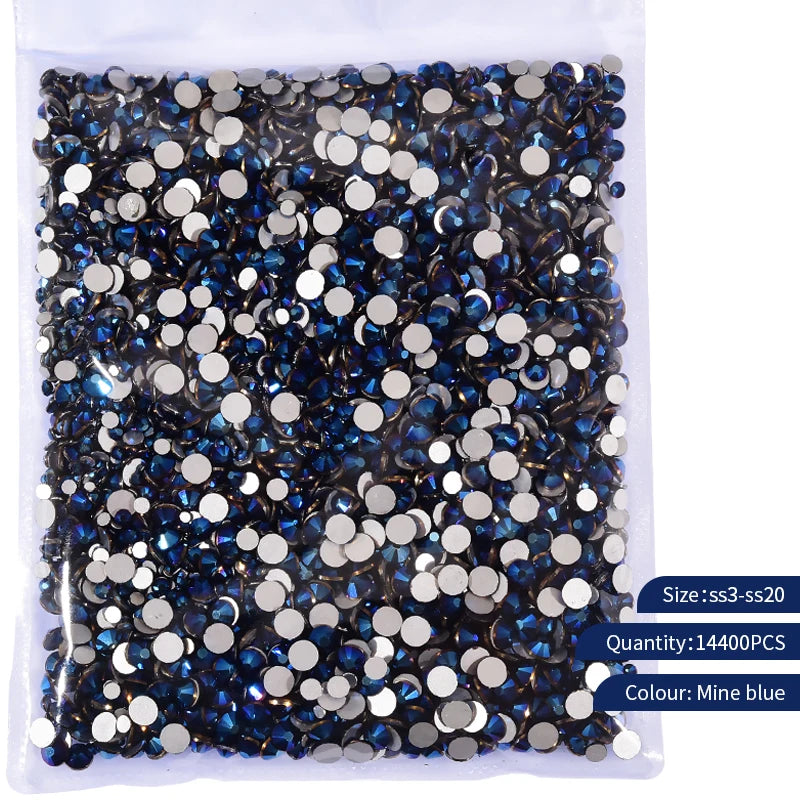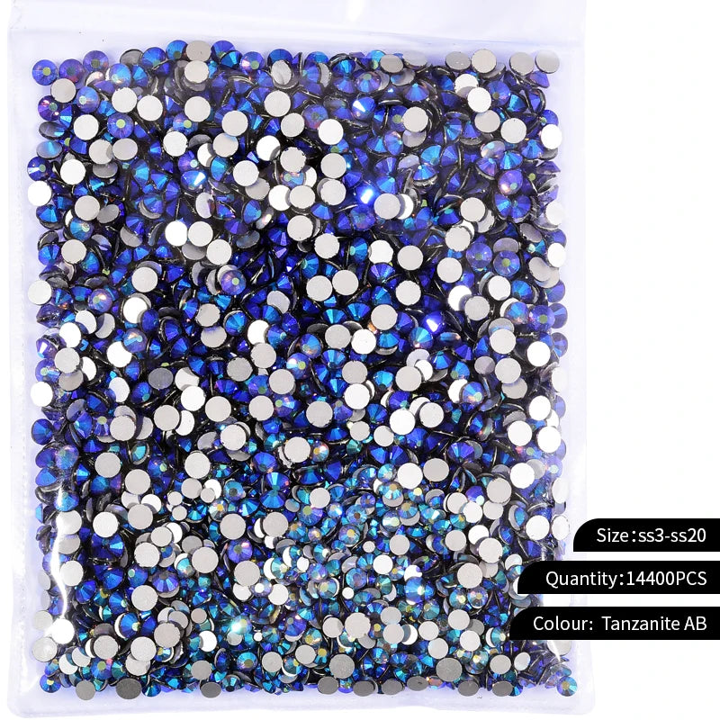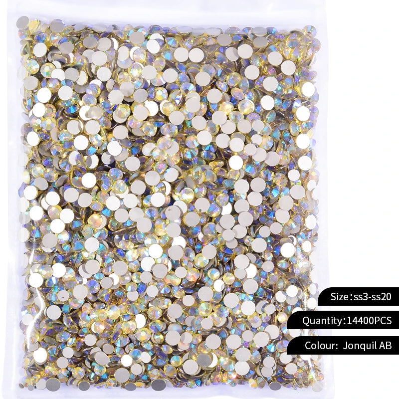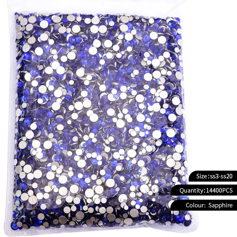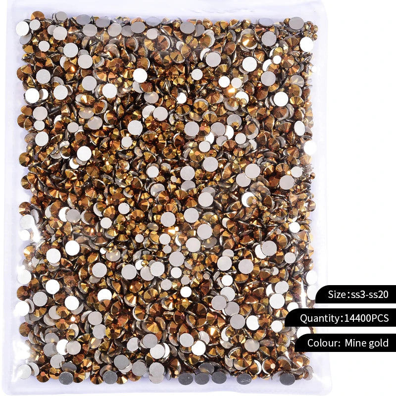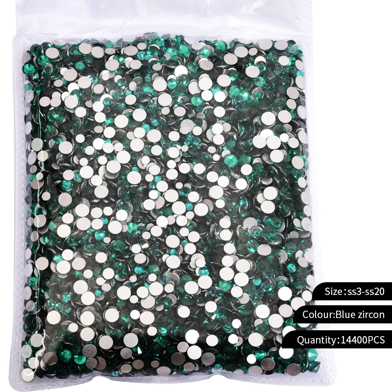 Storpack med strass stenar som har platt baksida och facetterad framsida där varje förpackning har 14400st stenar.
