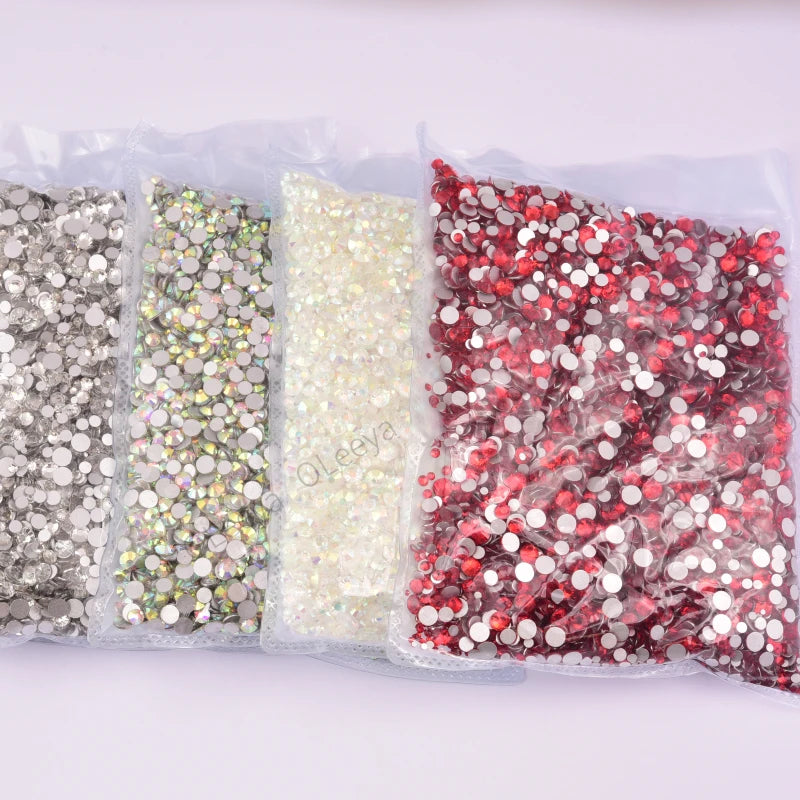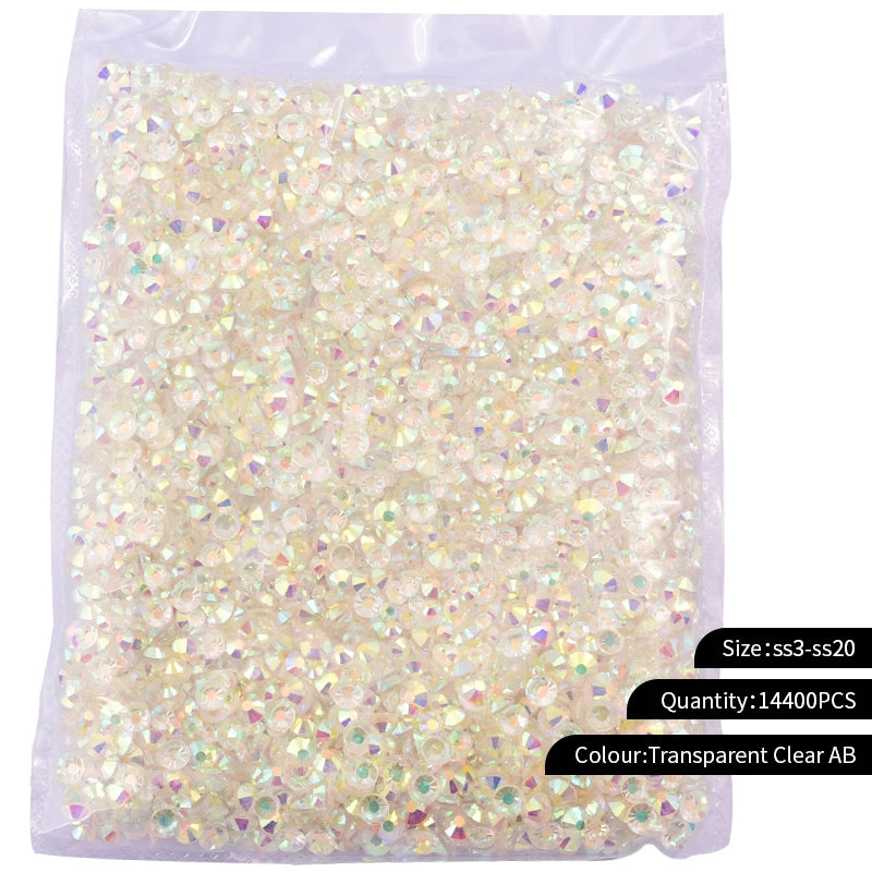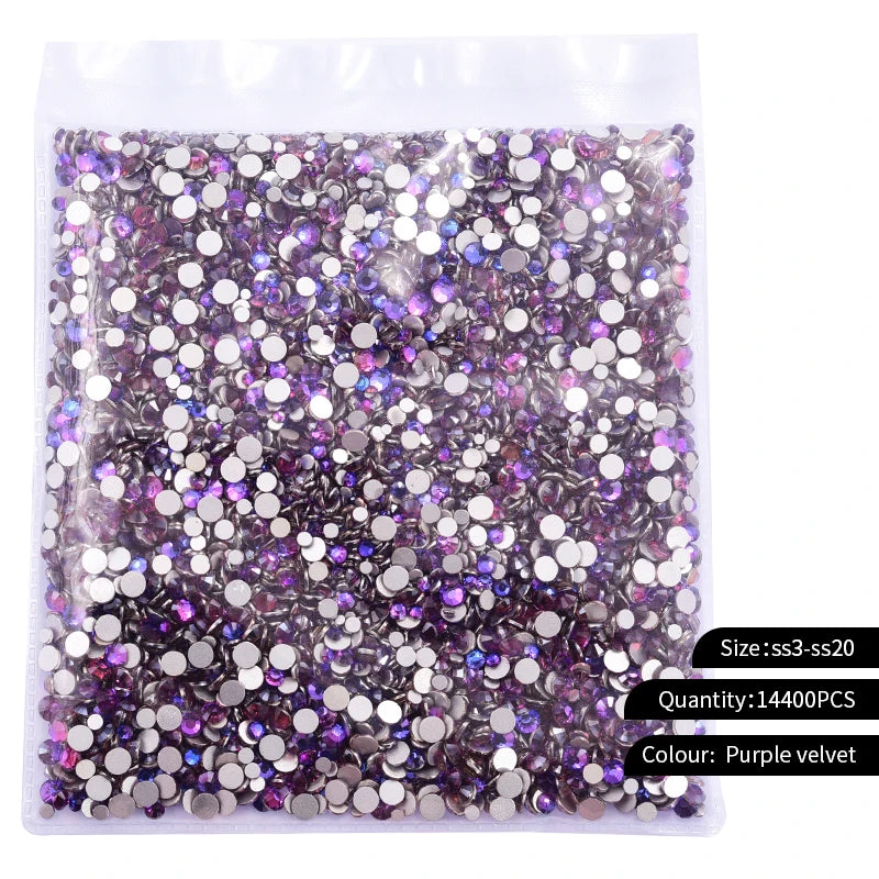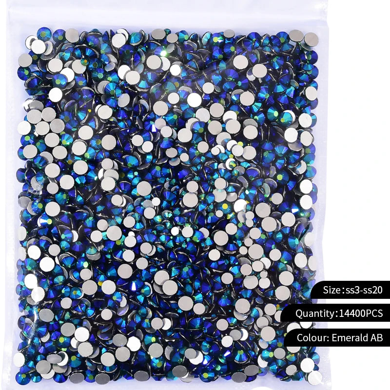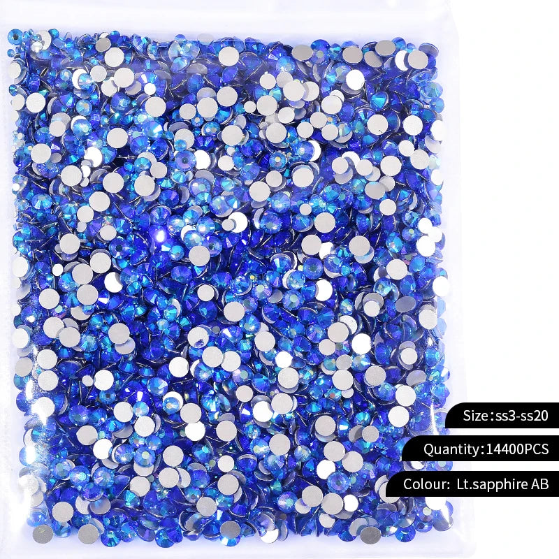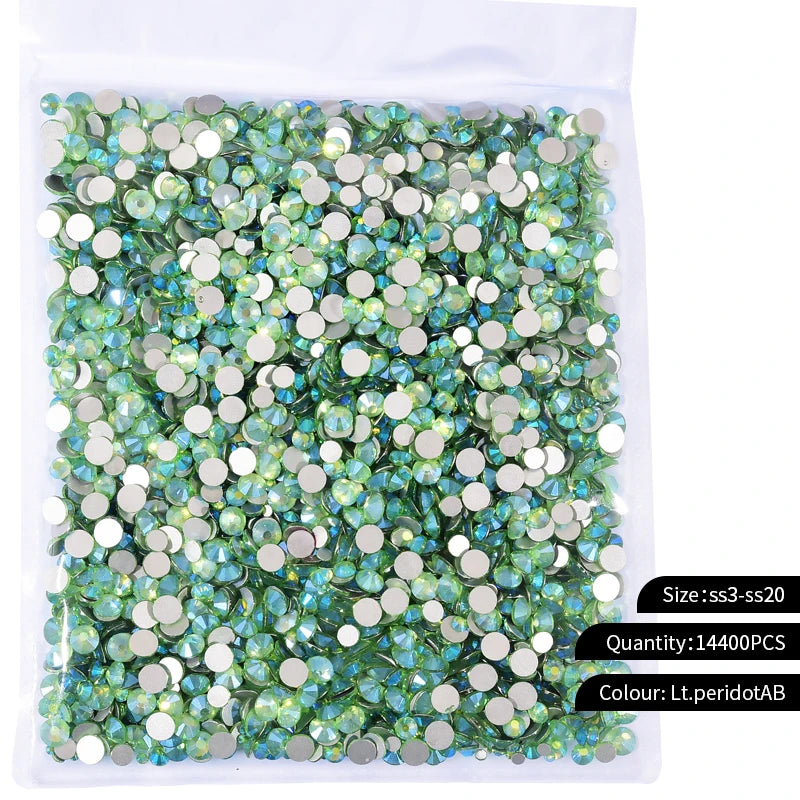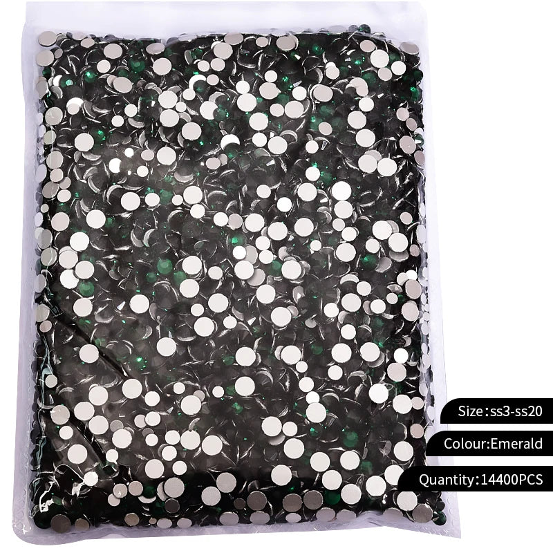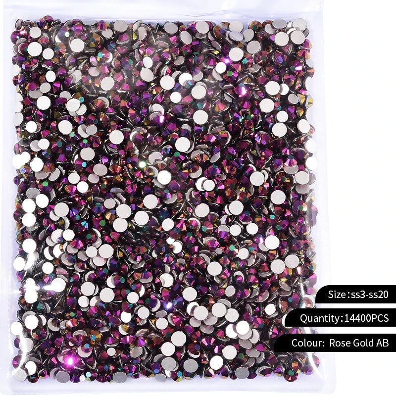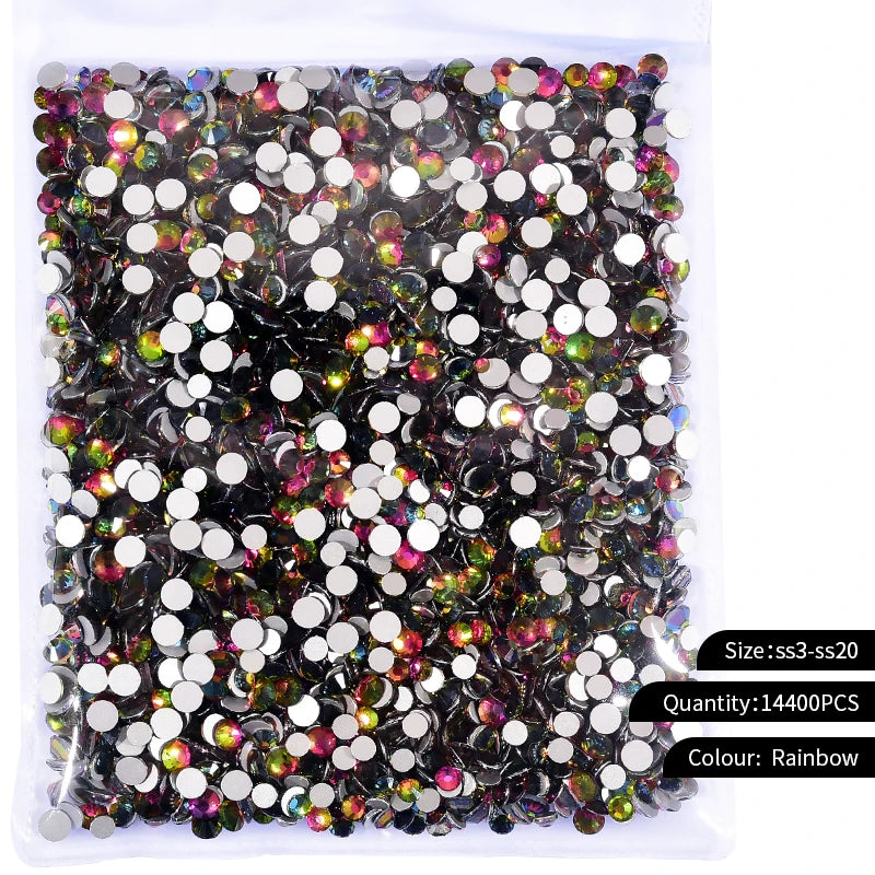 Storpack med strass stenar som har platt baksida och facetterad framsida där varje förpackning har 14400st stenar.