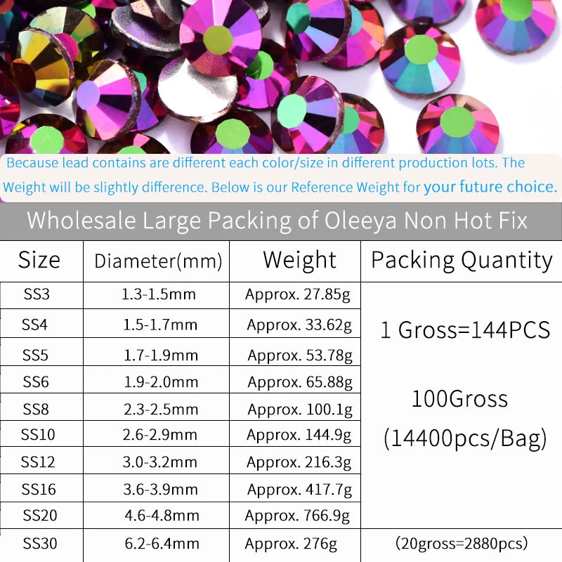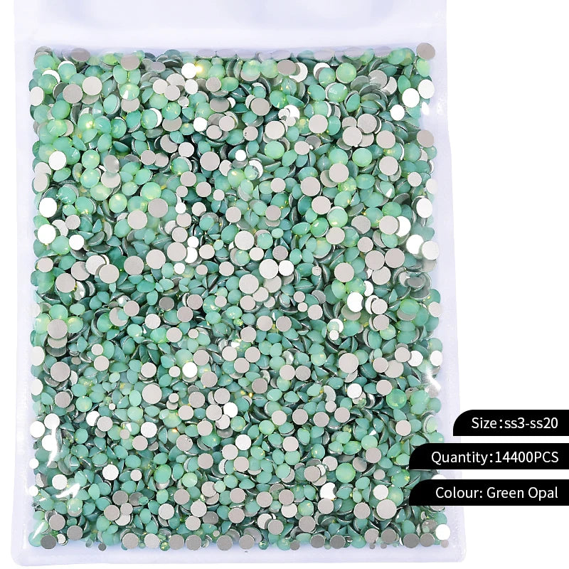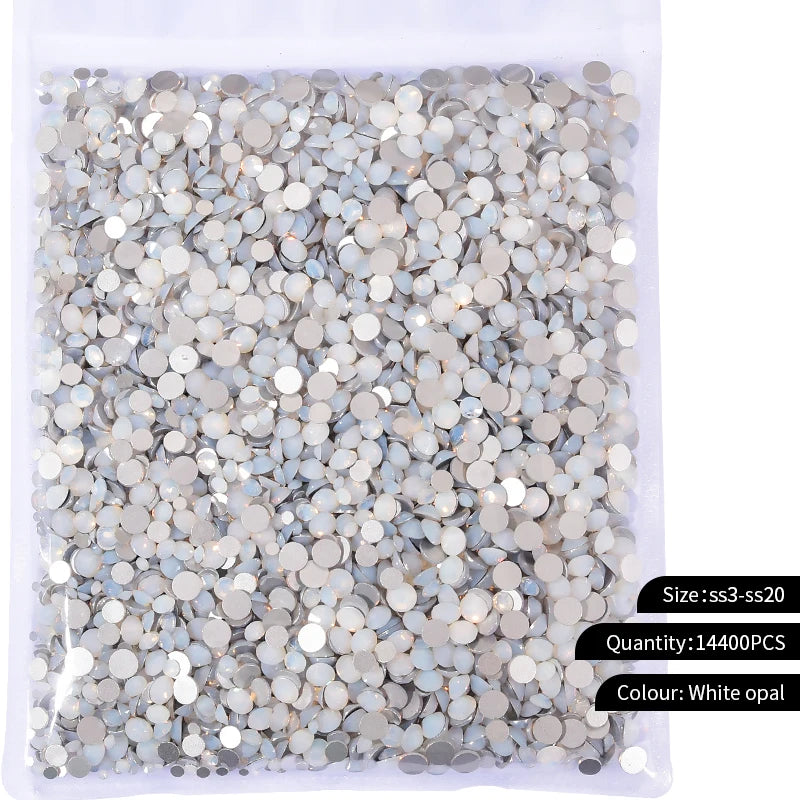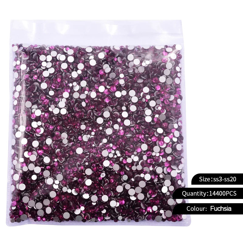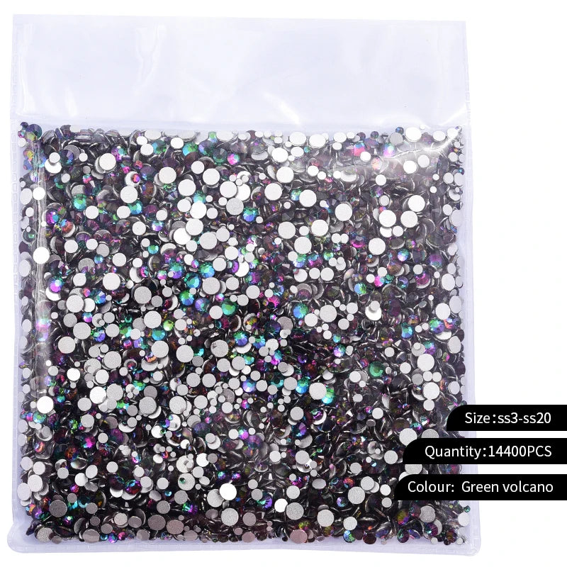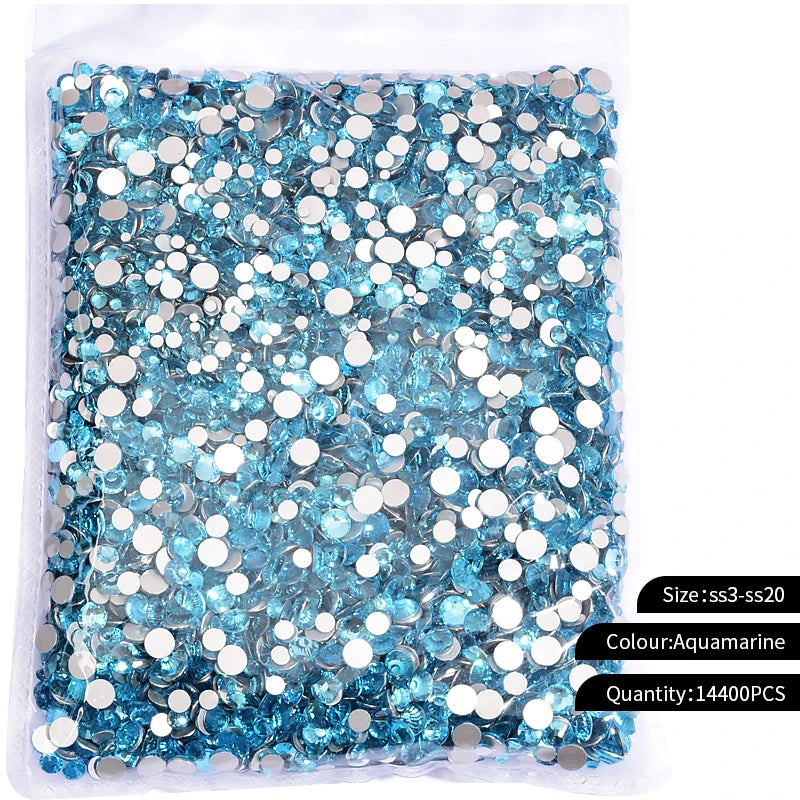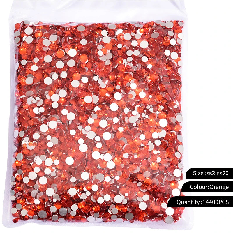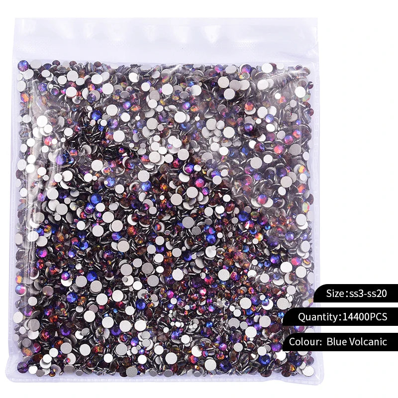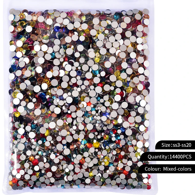 Storpack med strass stenar som har platt baksida och facetterad framsida där varje förpackning har 14400st stenar.