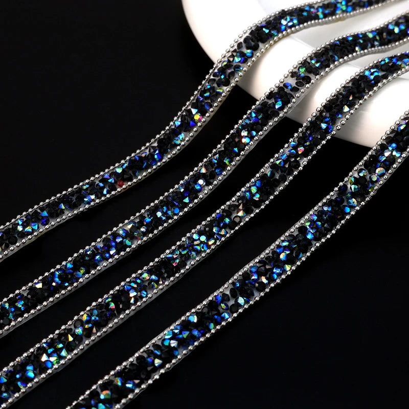 Rhinestone tape/tape that is 1cm wide and 90cm long. You can choose either Hot fix or self-adhesive, with hot fix you use an iron and iron the tape to attach it, which is the best option when using it on fabric.