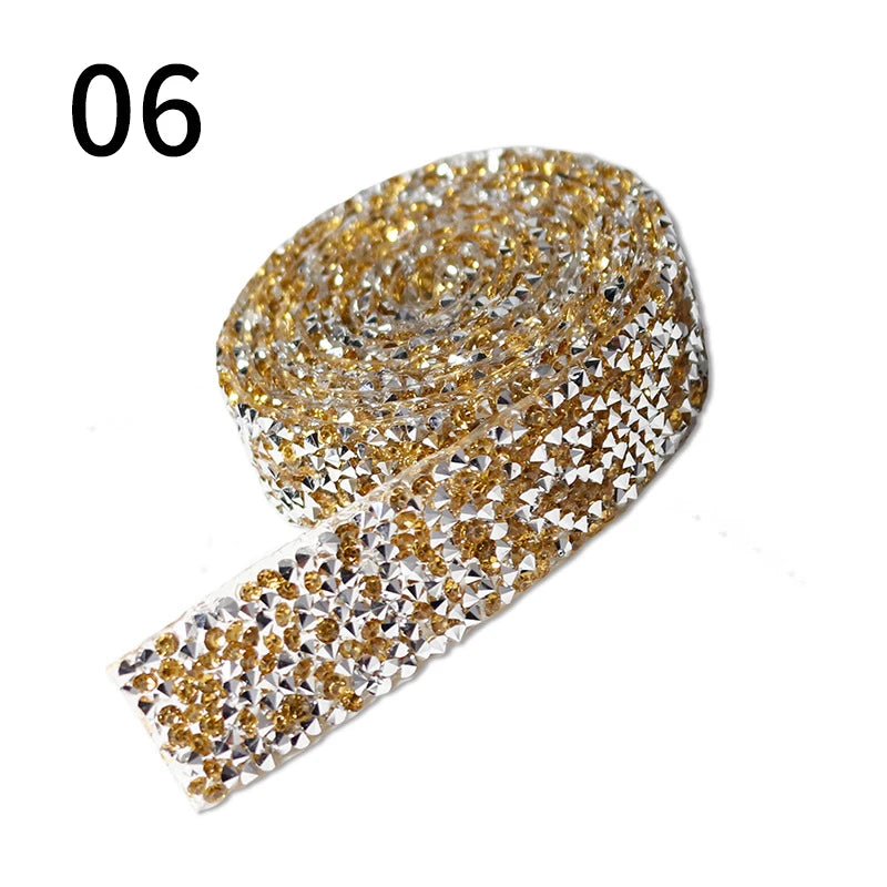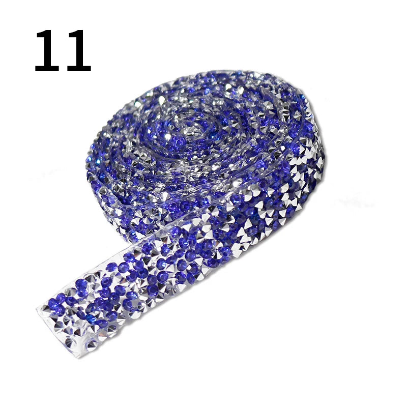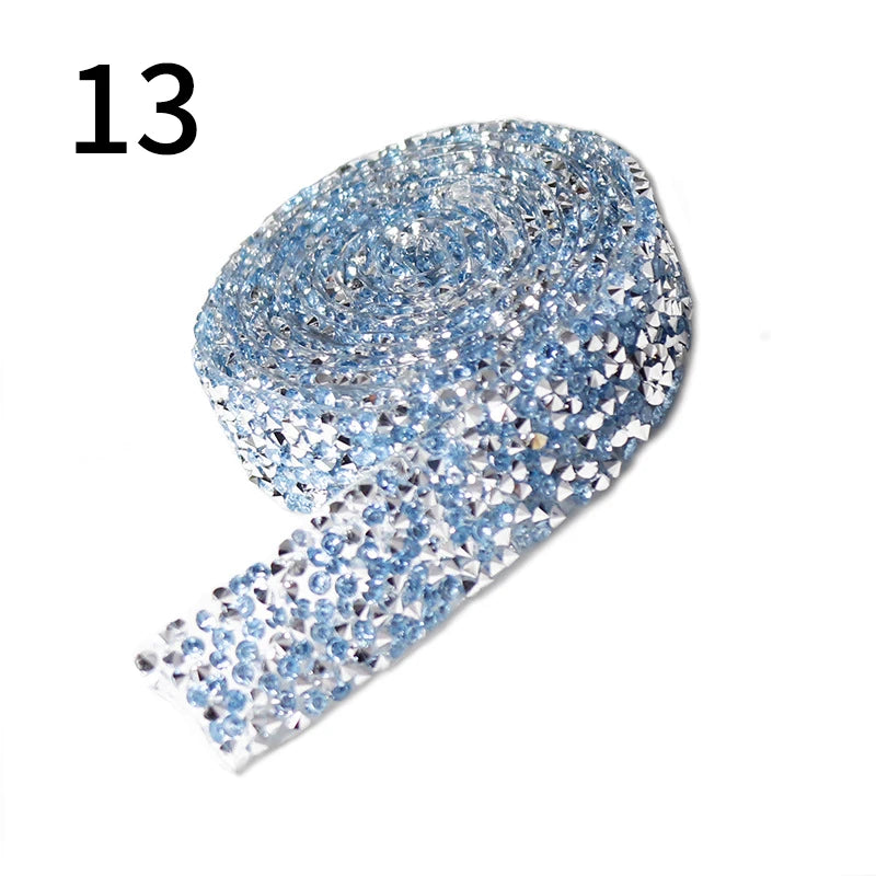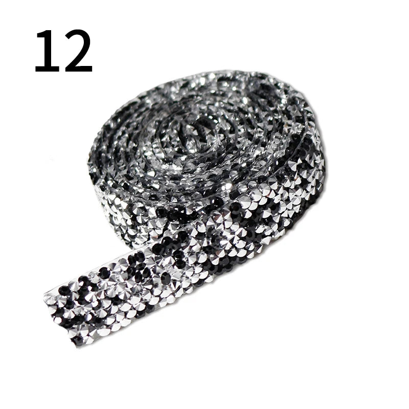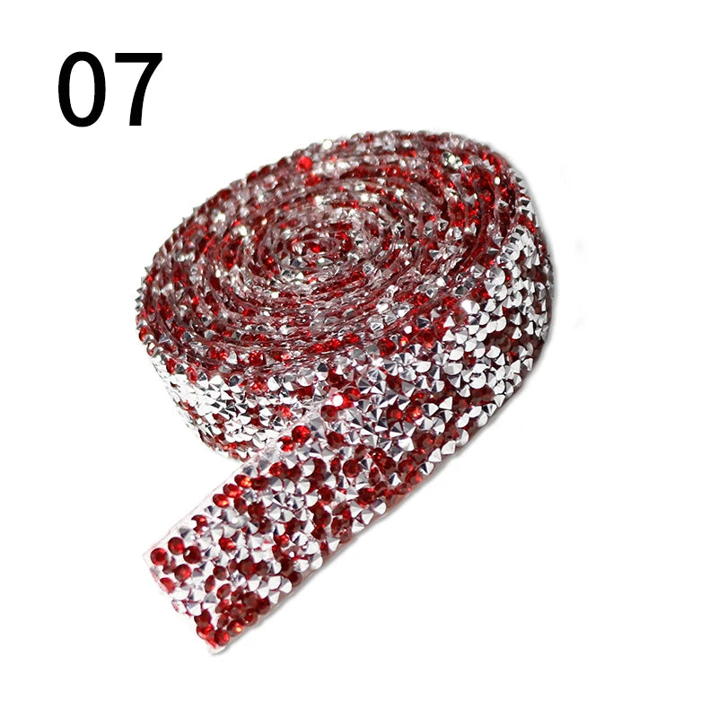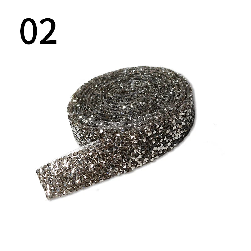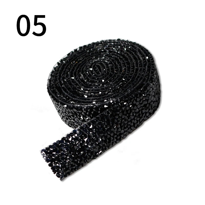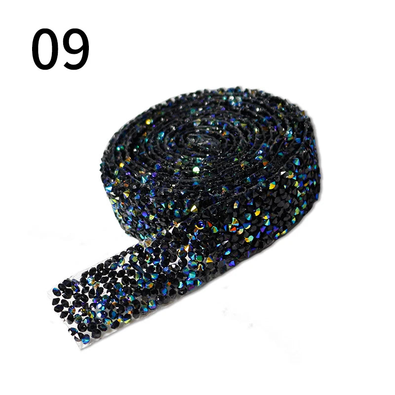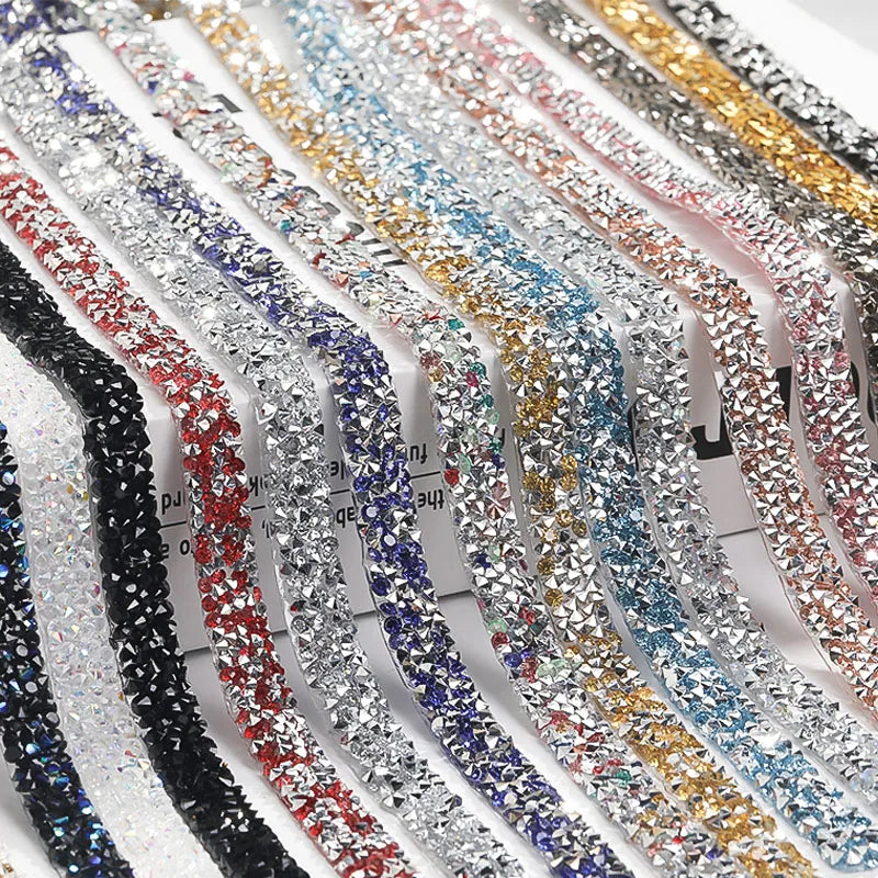 Hot fix rhinestone ribbons in different colors that you can choose widths between 0.5cm to 3cm and are 91cm long.