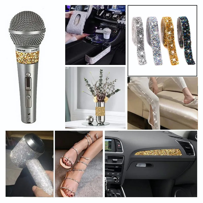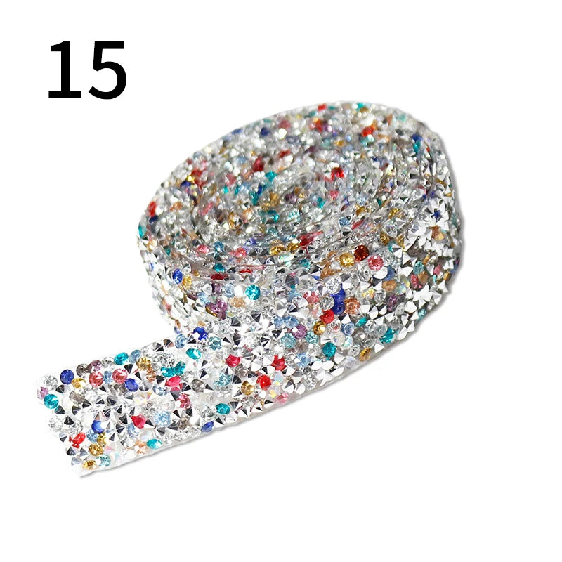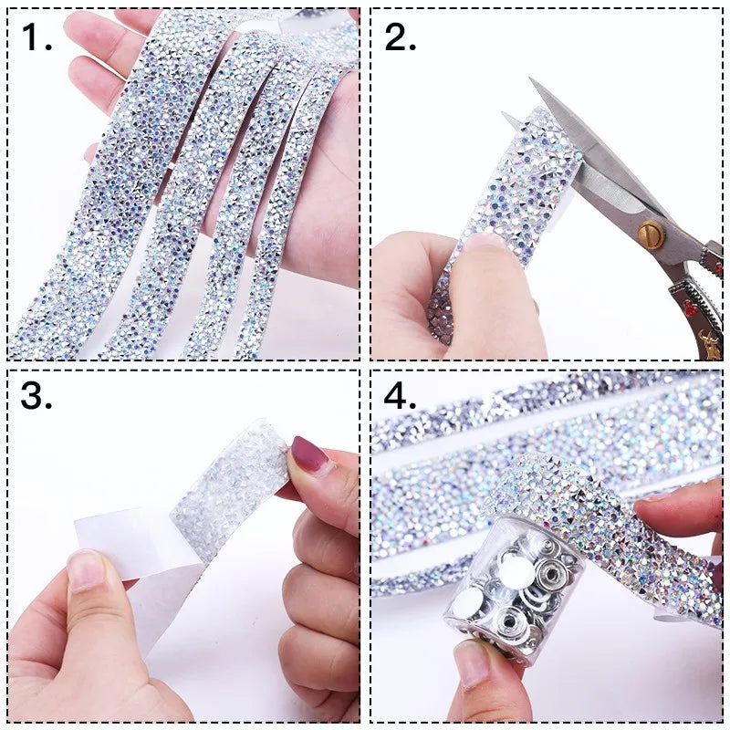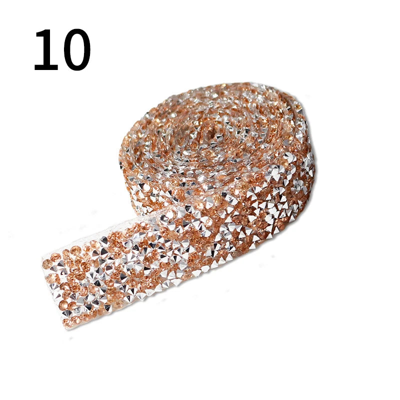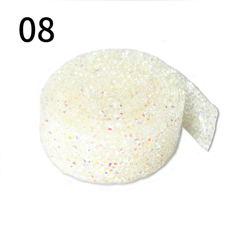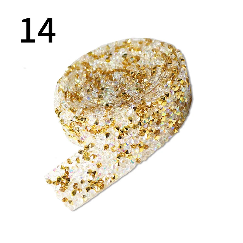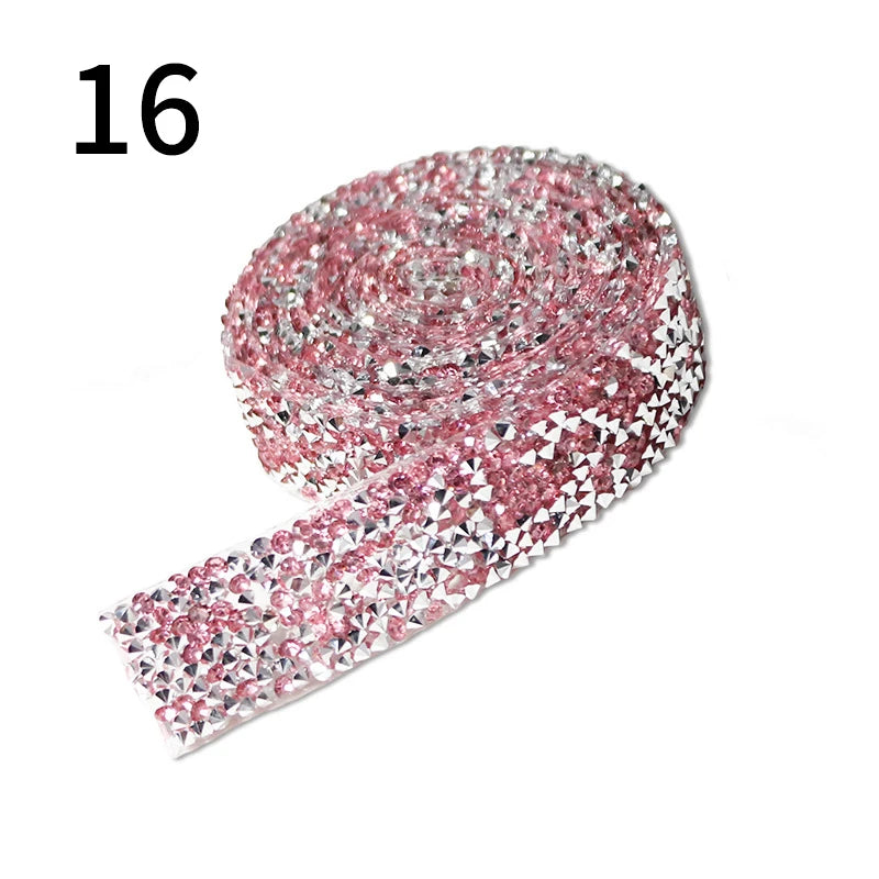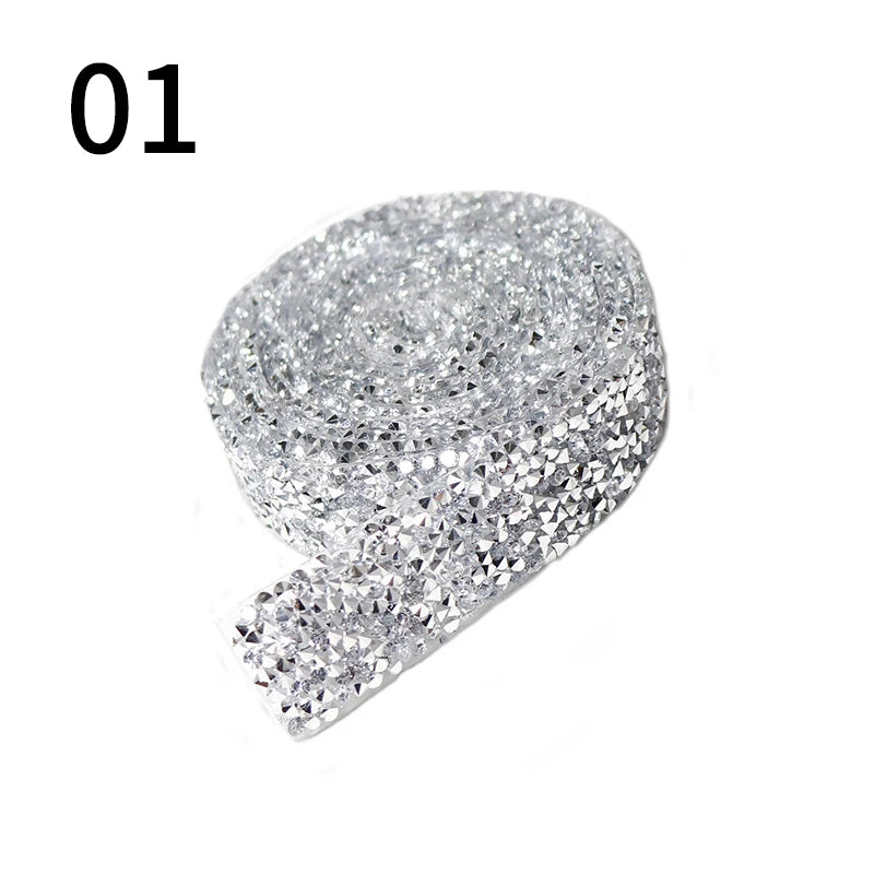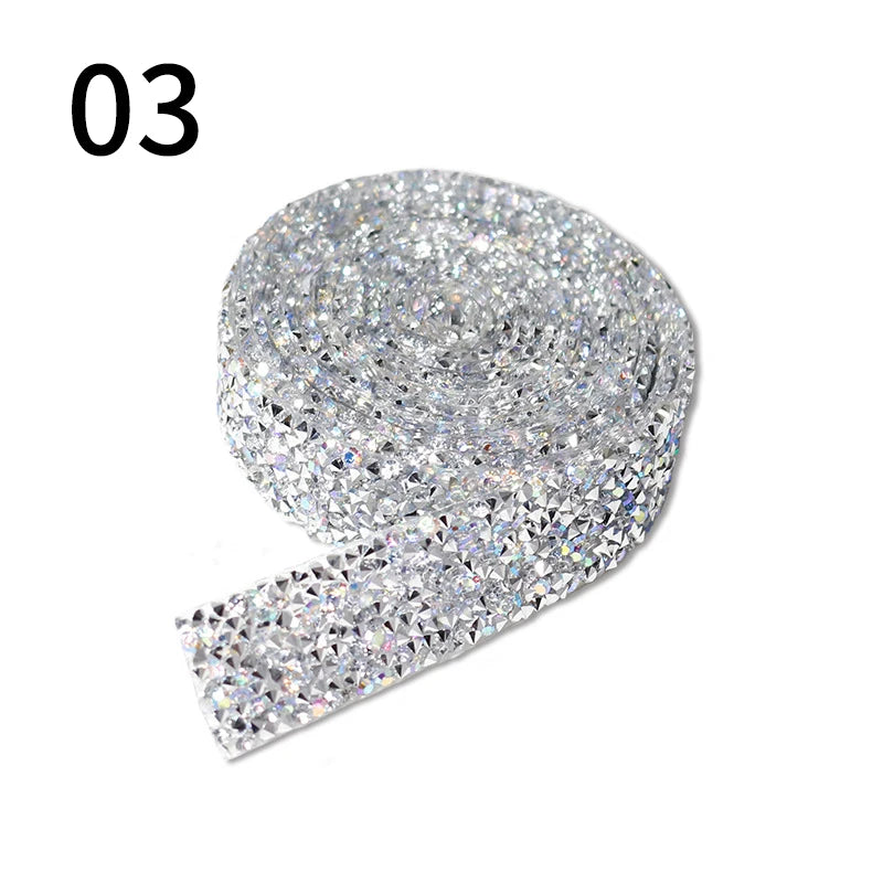 Hot fix rhinestone ribbons in different colors that you can choose widths between 0.5cm to 3cm and are 91cm long.