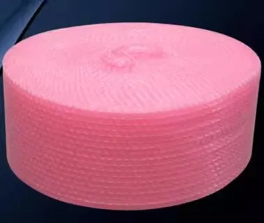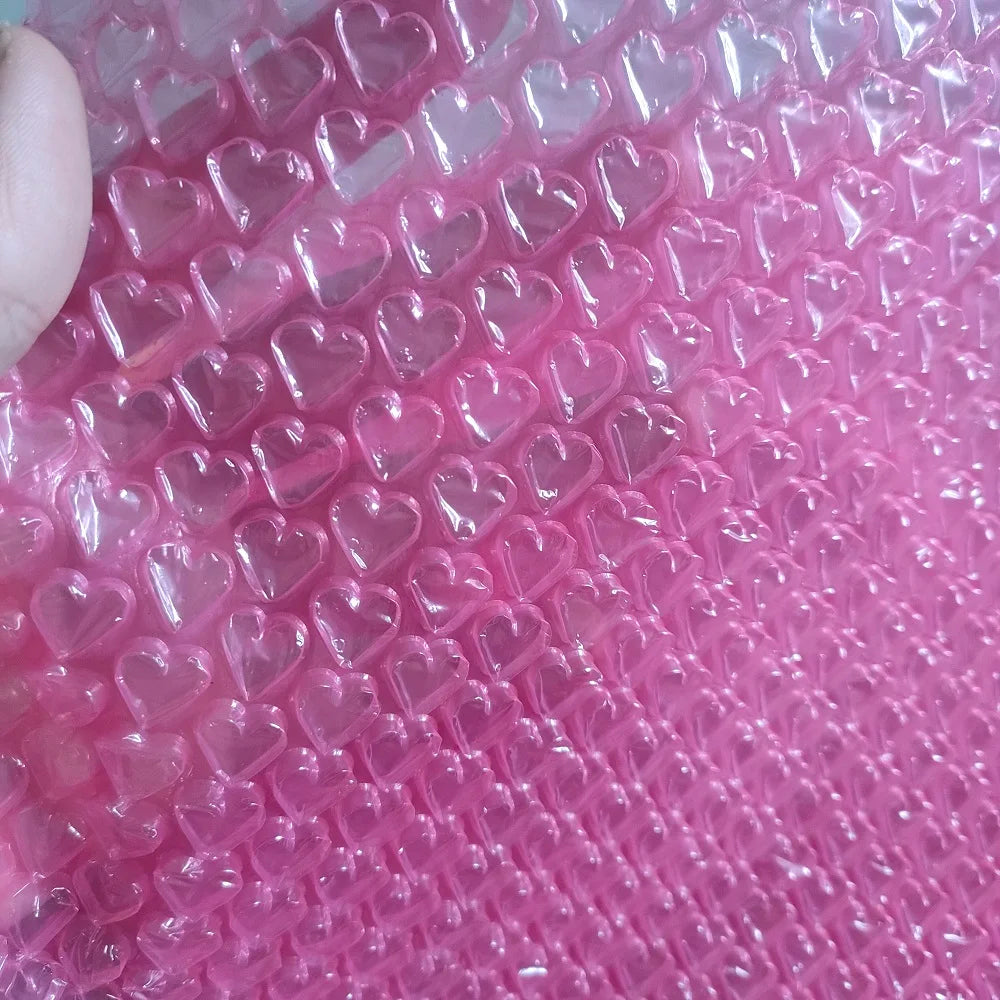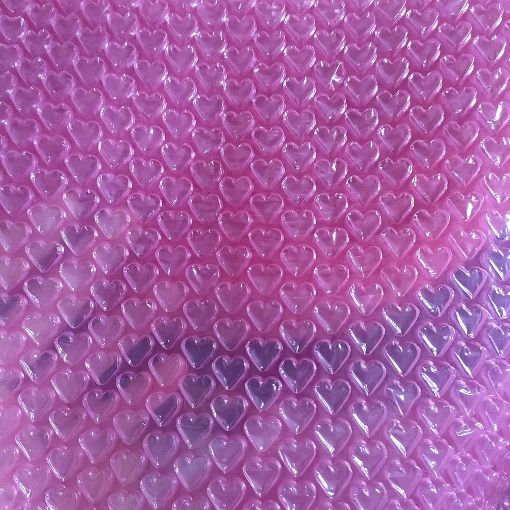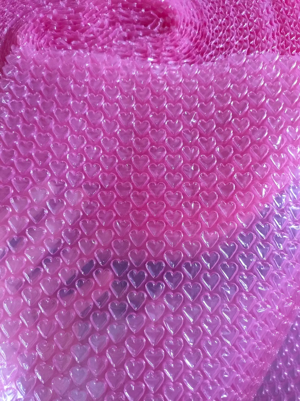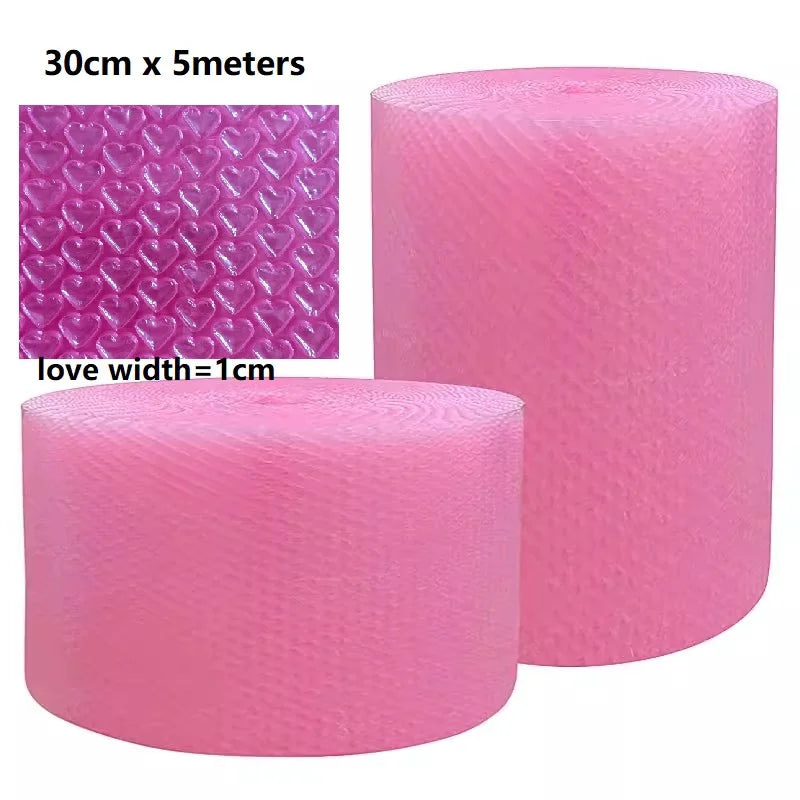 Pink bubble wrap that is 30cm wide and 5M long with heart-shaped bubbles for wrapping packages, shipping and storage.