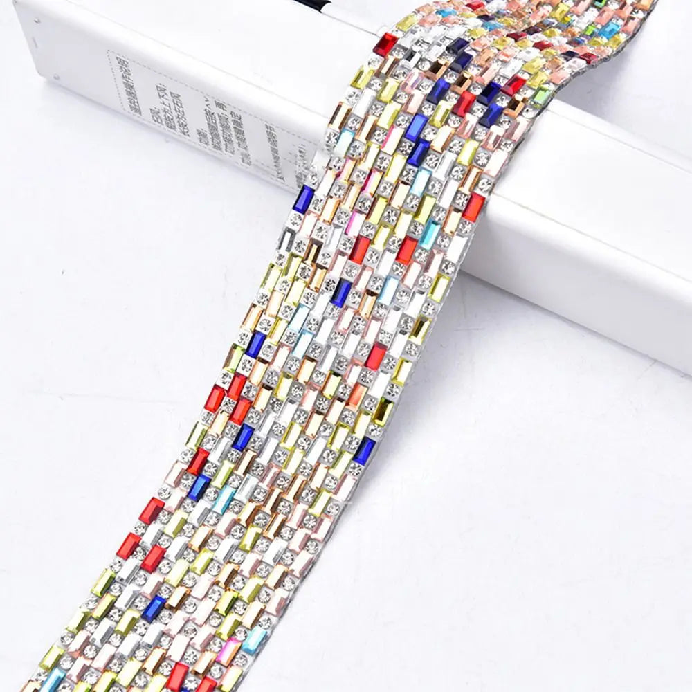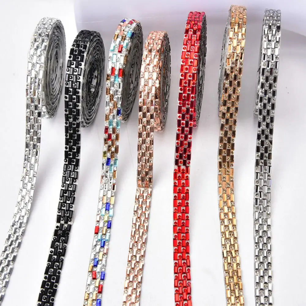 Rhinestone tape with rectangle shaped rhinestone plates interspersed with small rhinestones is available in red black multicolor champagne white and is 1cm wide and 4.5m long.