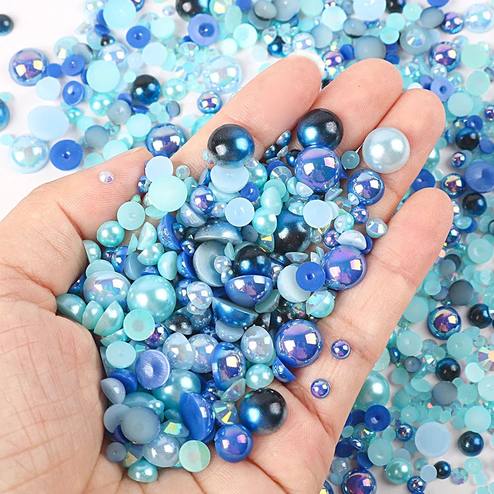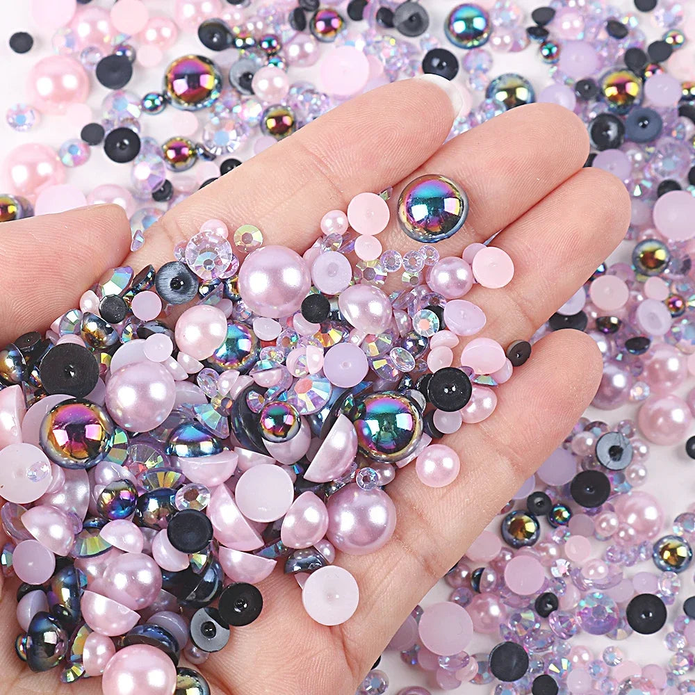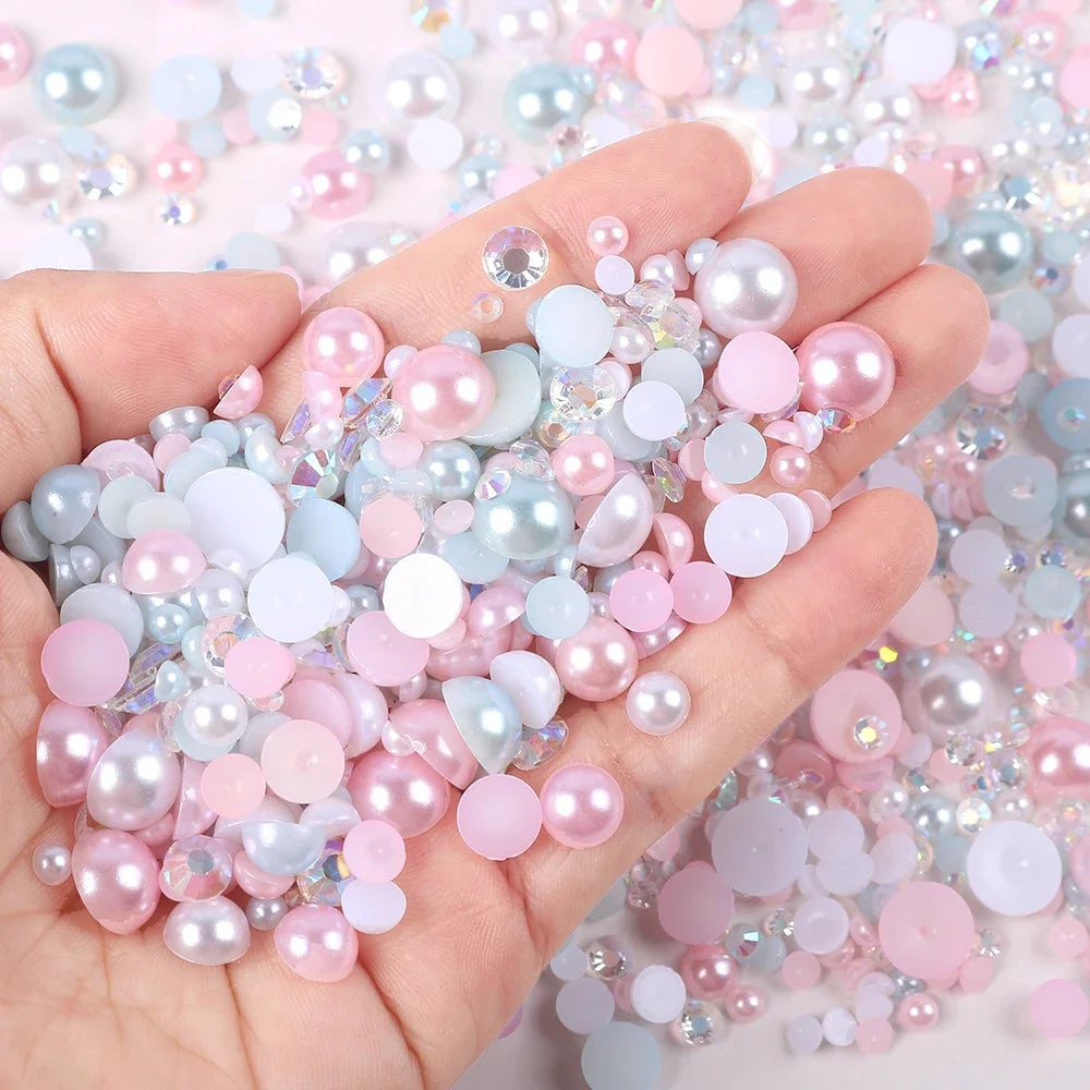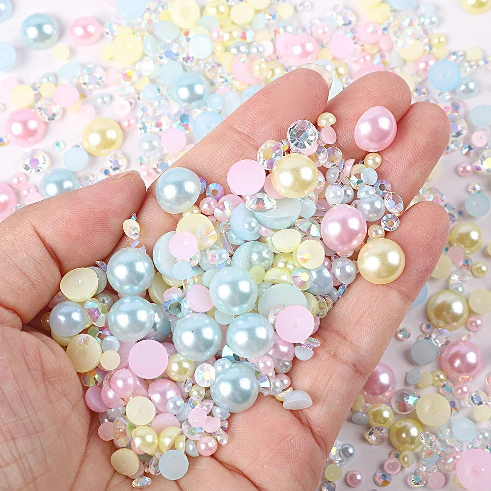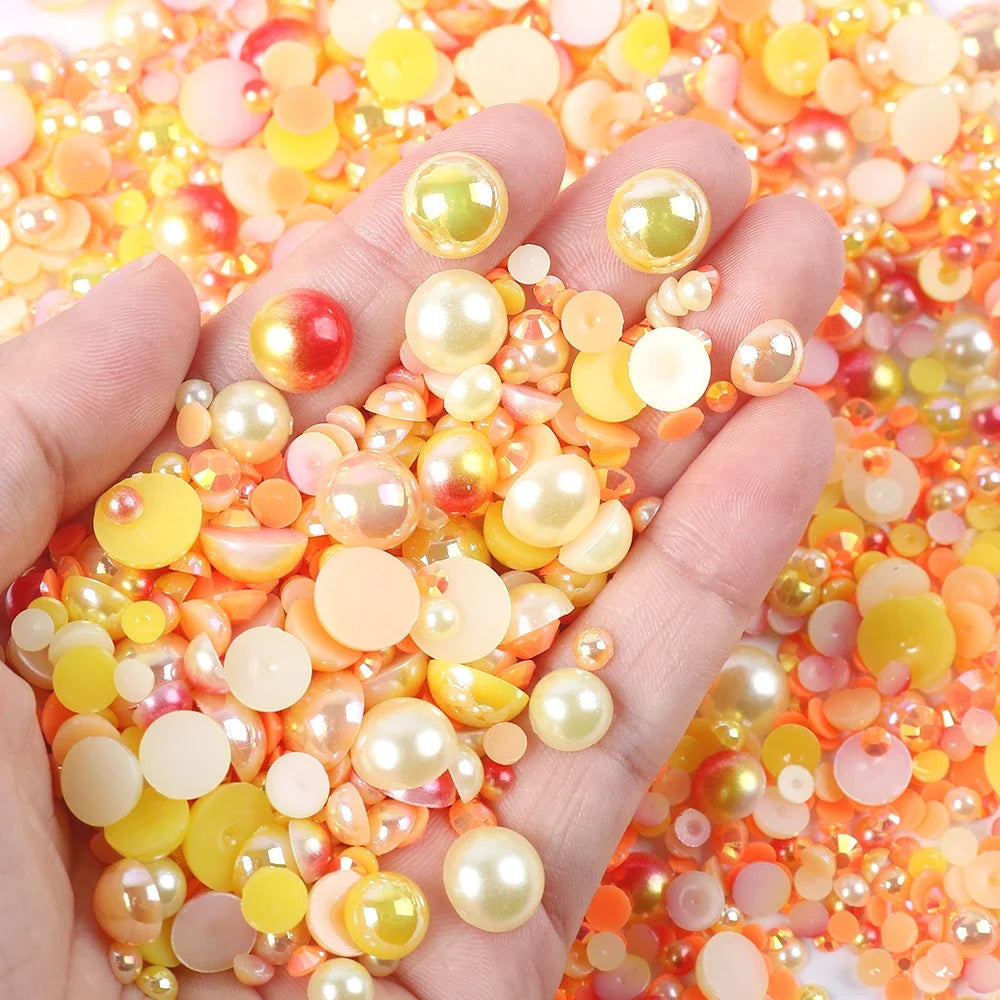 Packaging of either 30g or 150g with Flatback pearl imitation beads where the packaging is mixed in different sizes between 3-10mm. The packaging is also the colors in different shades. The beads are in acrylic and you need glue to attach them.