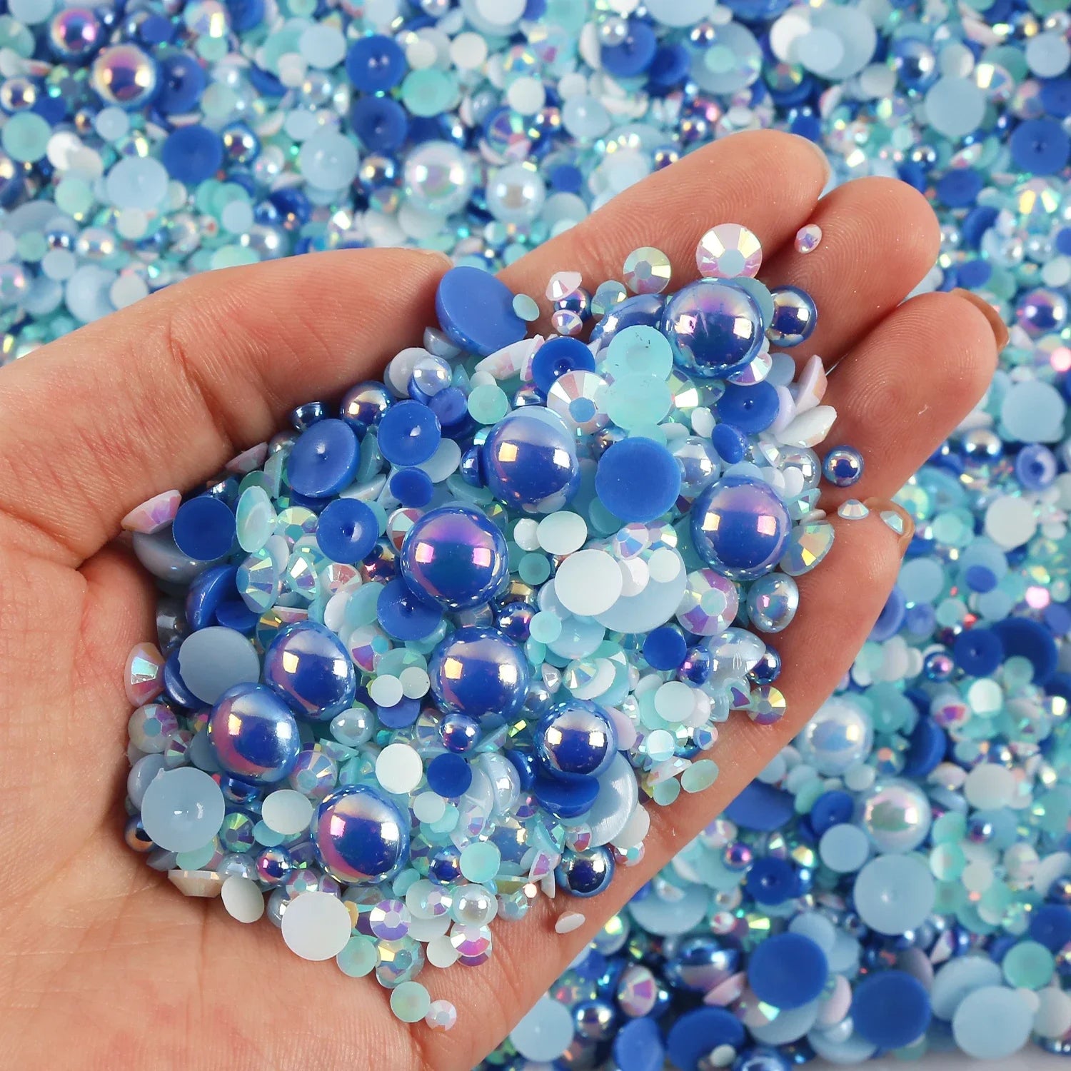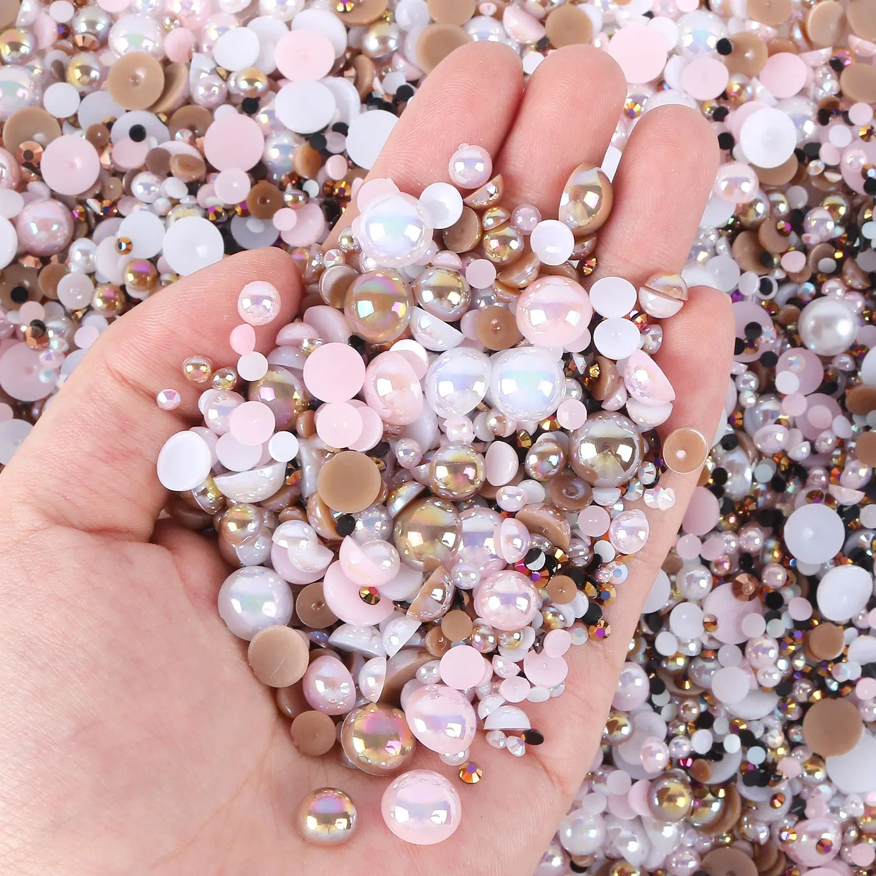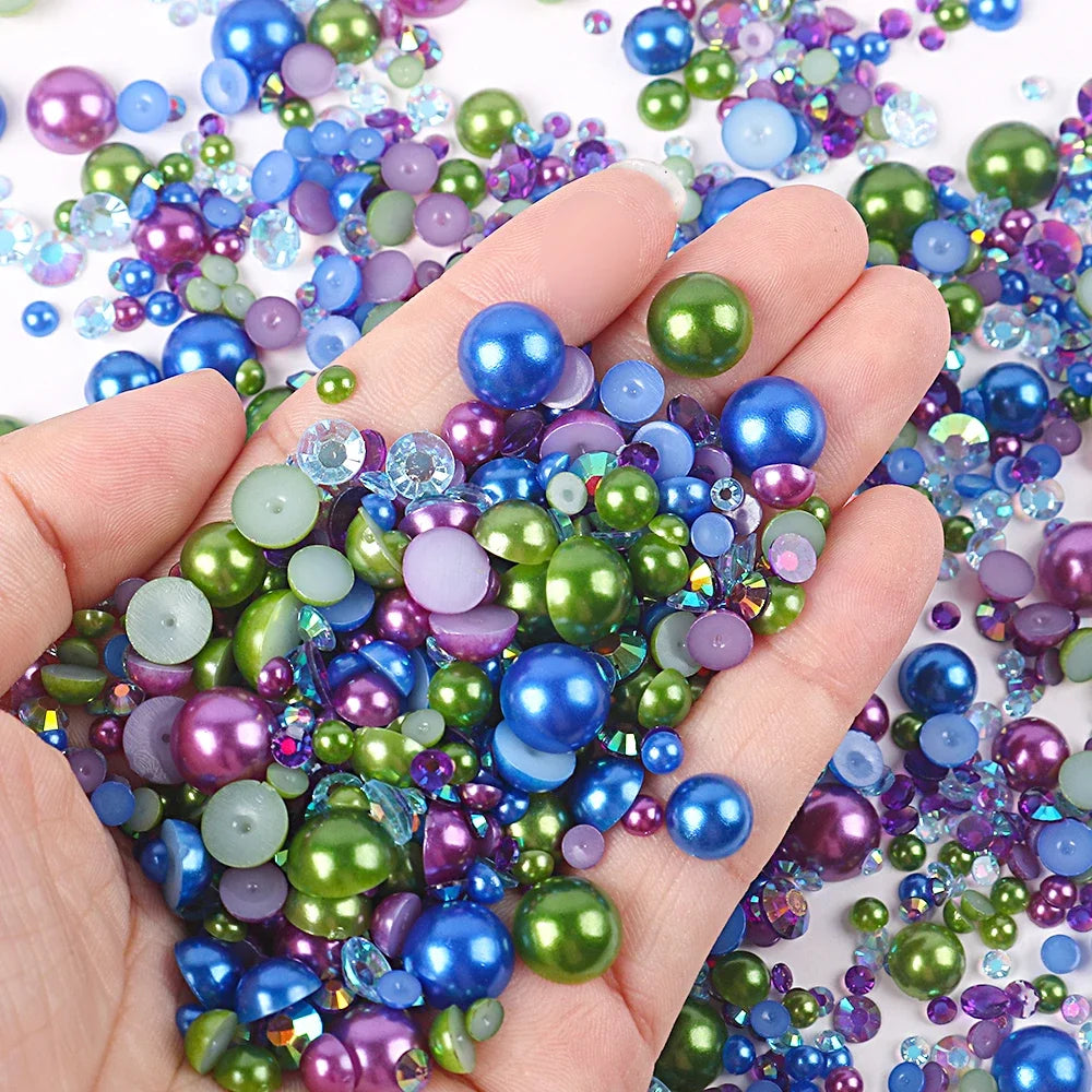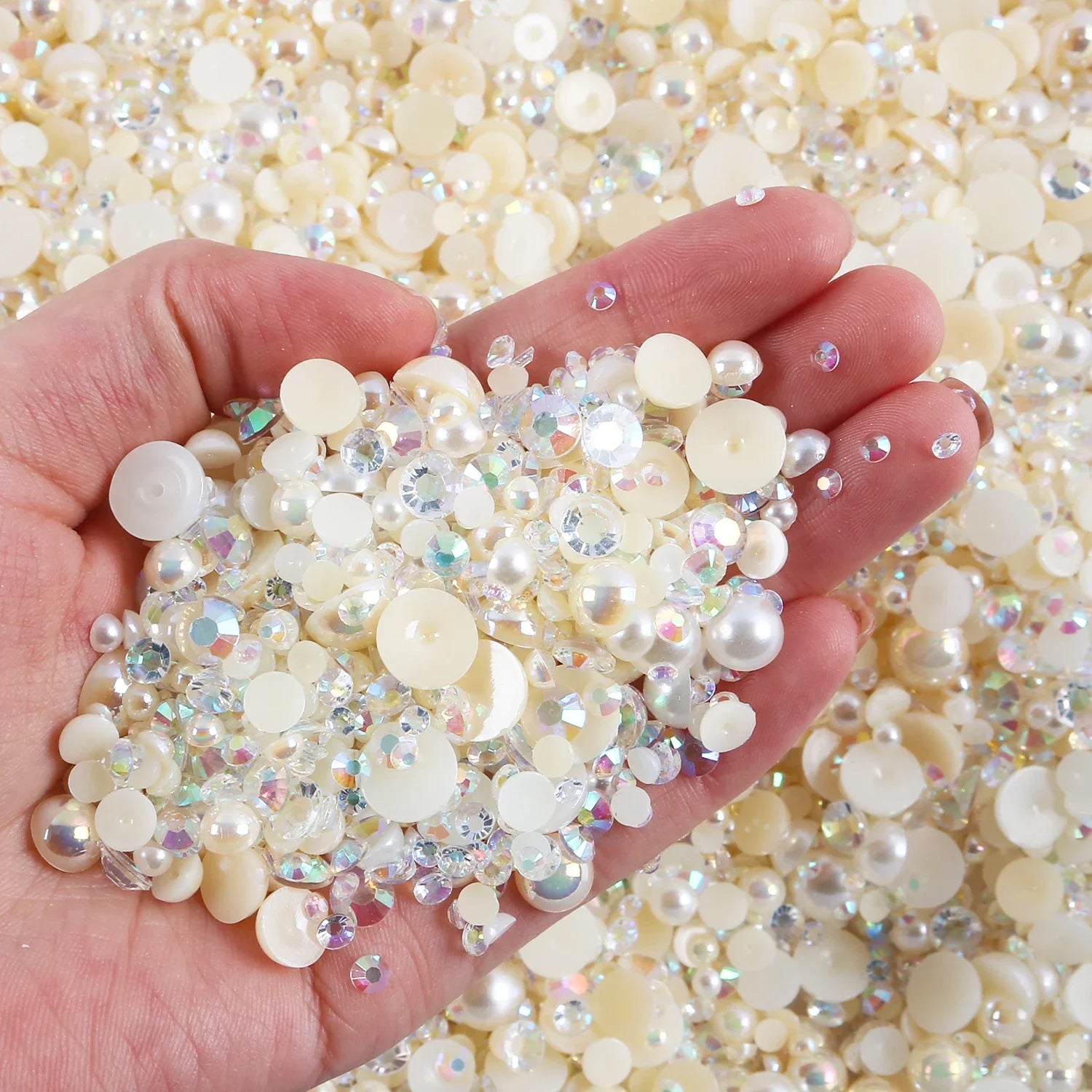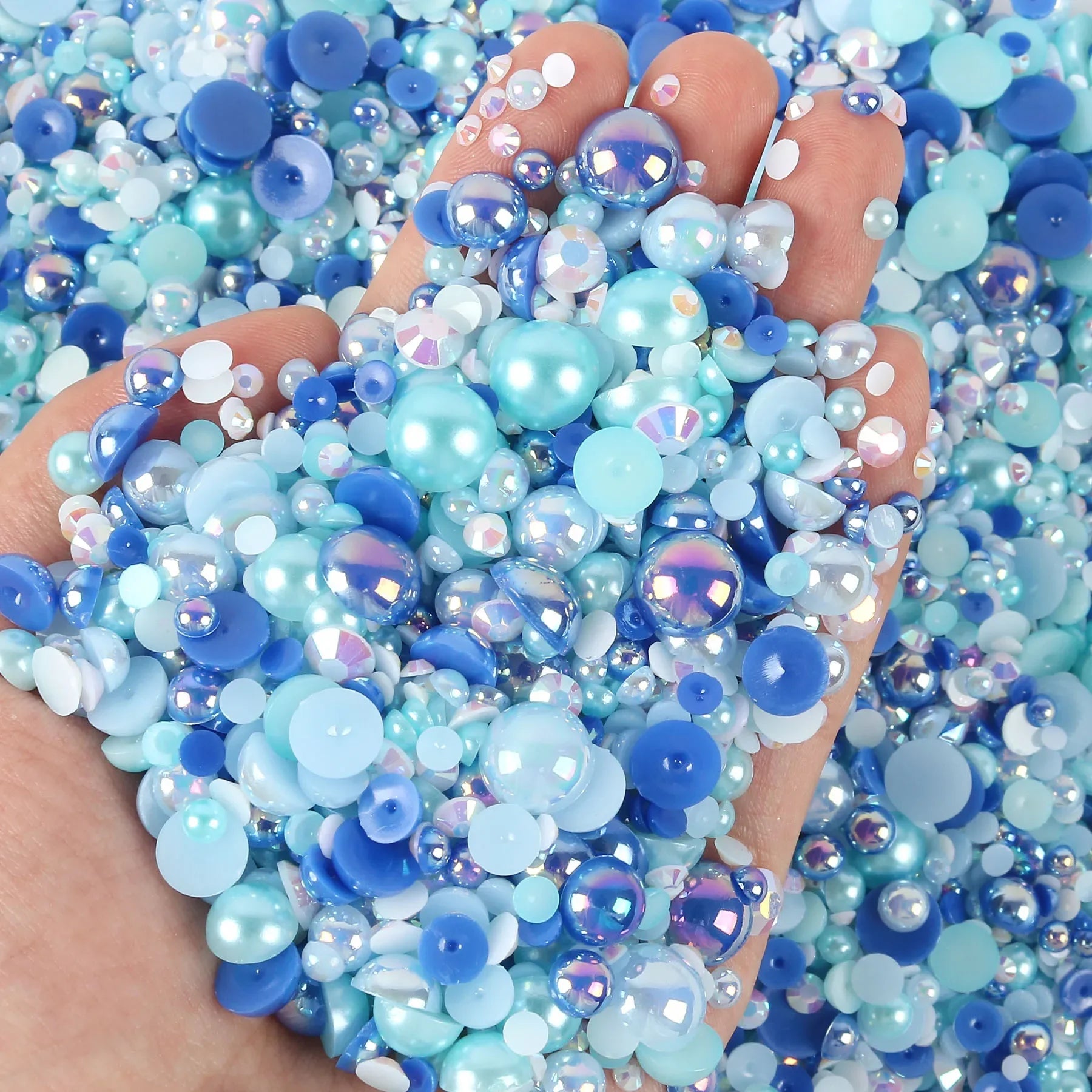 Packaging of either 30g or 150g with Flatback pearl imitation beads where the packaging is mixed in different sizes between 3-10mm. The packaging is also the colors in different shades. The beads are in acrylic and you need glue to attach them.