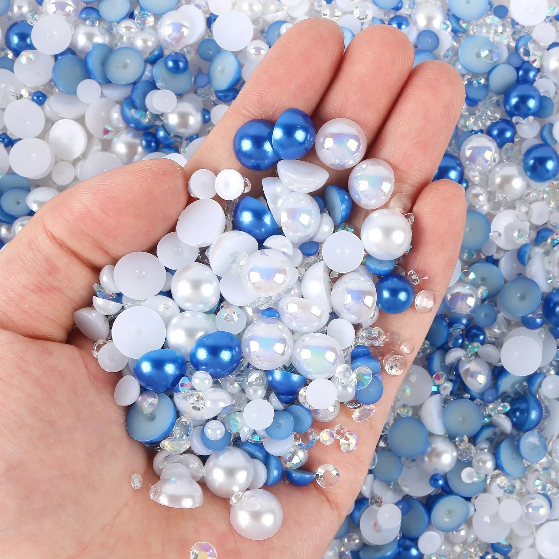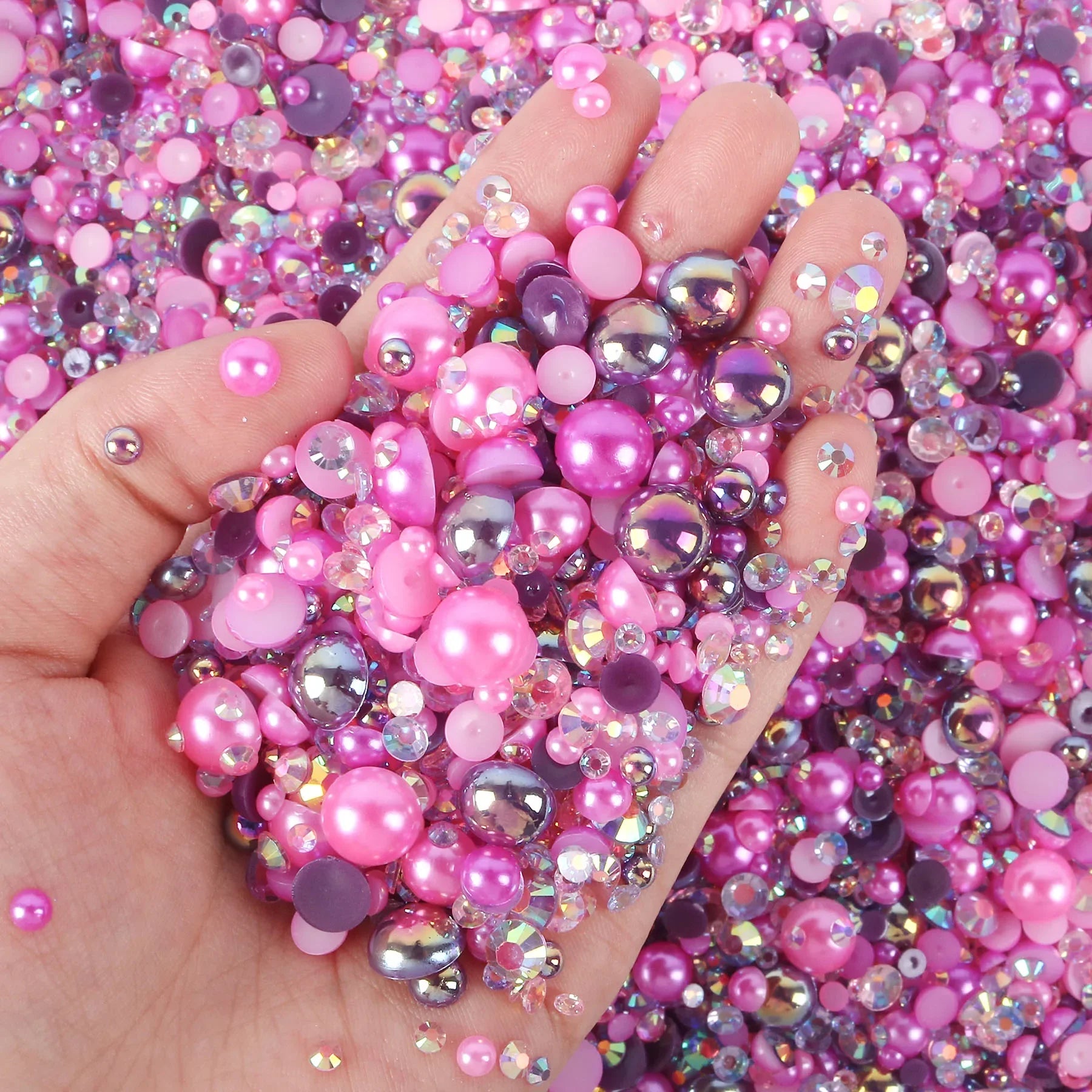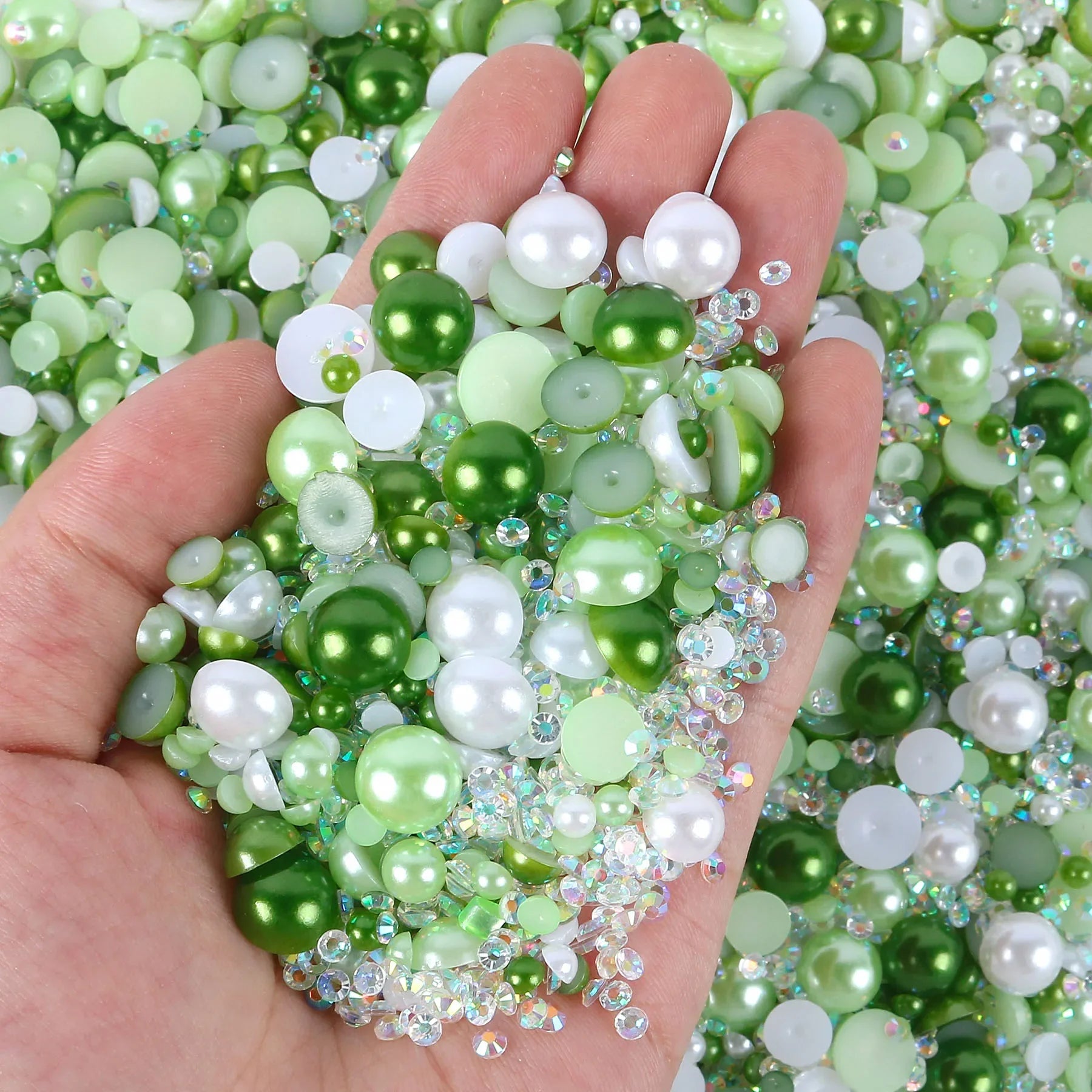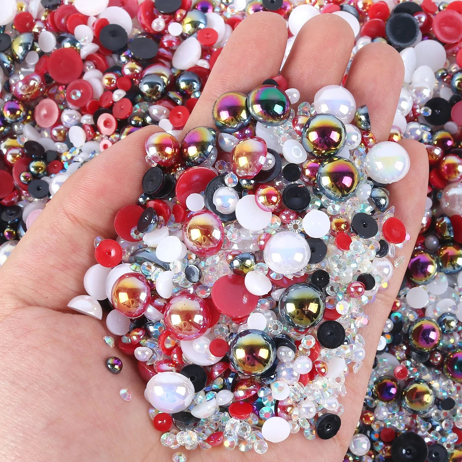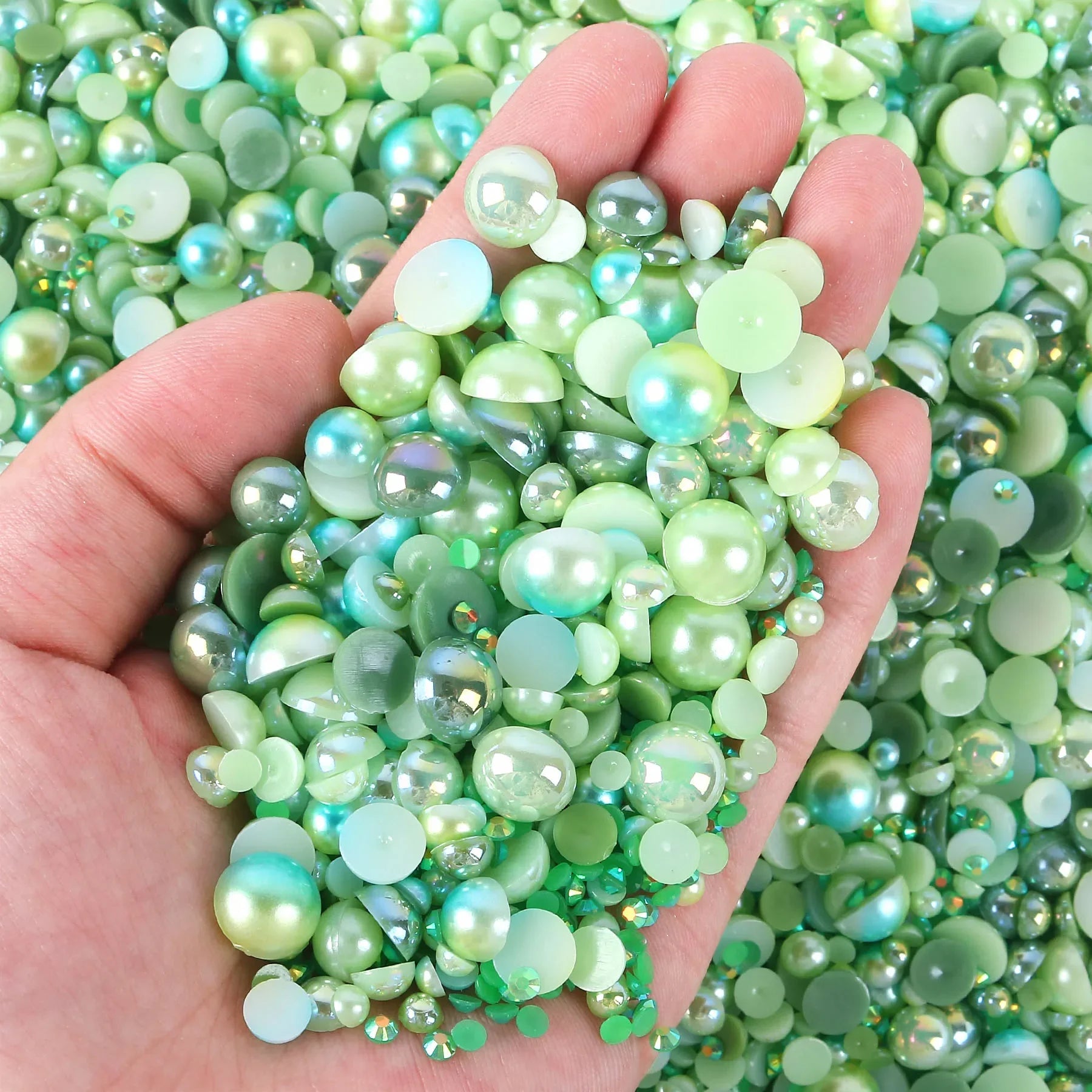 Packaging of either 30g or 150g with Flatback pearl imitation beads where the packaging is mixed in different sizes between 3-10mm. The packaging is also the colors in different shades. The beads are in acrylic and you need glue to attach them.