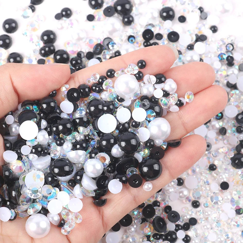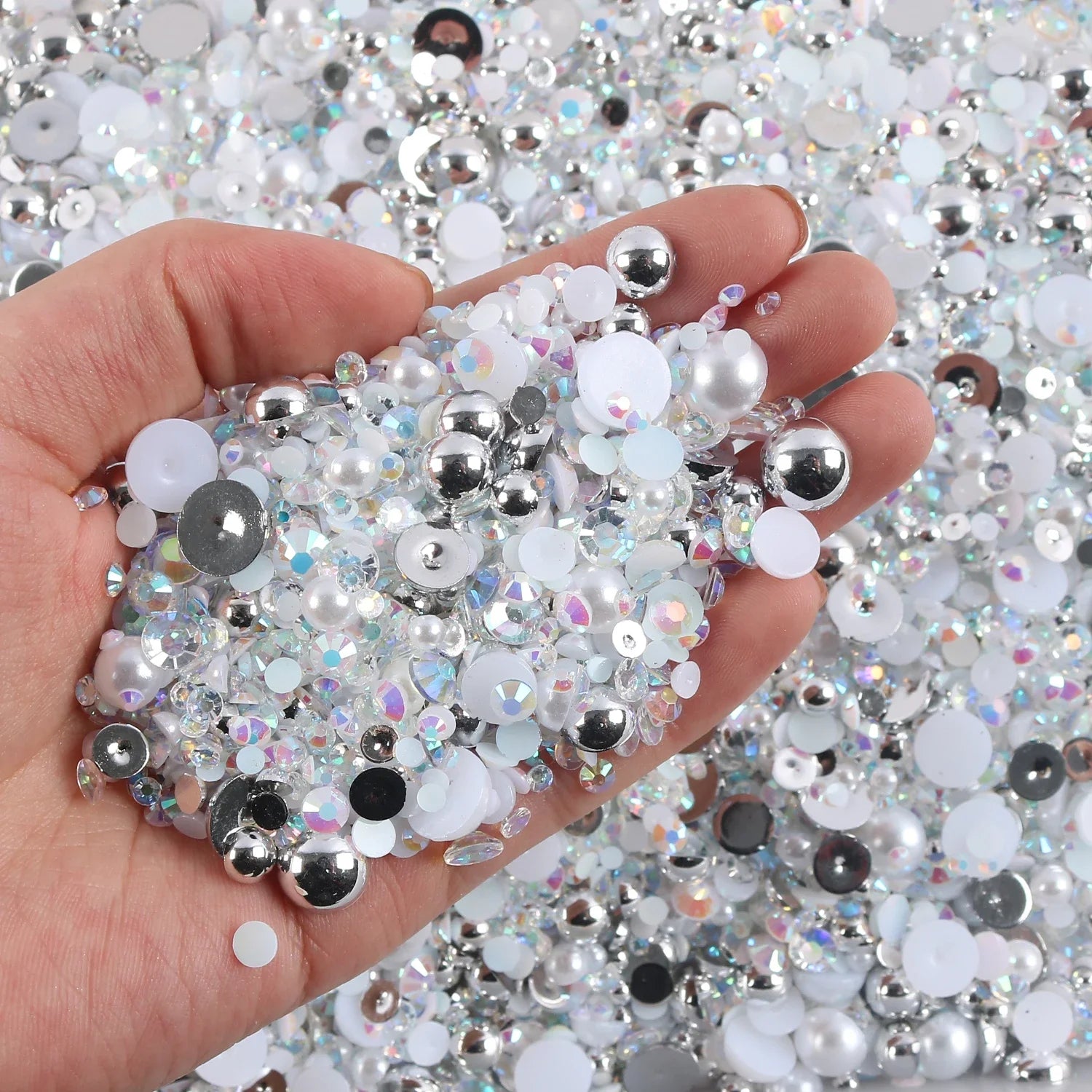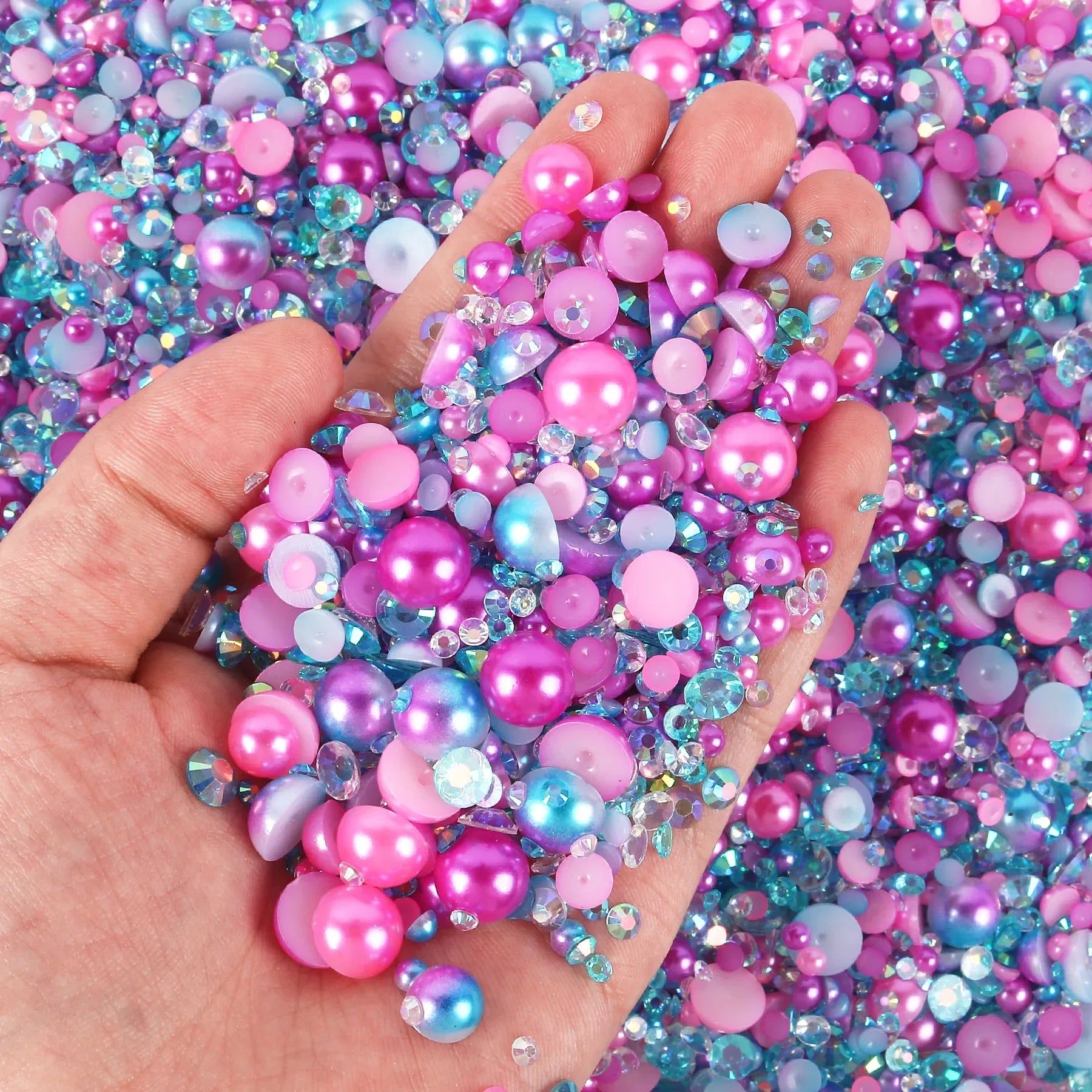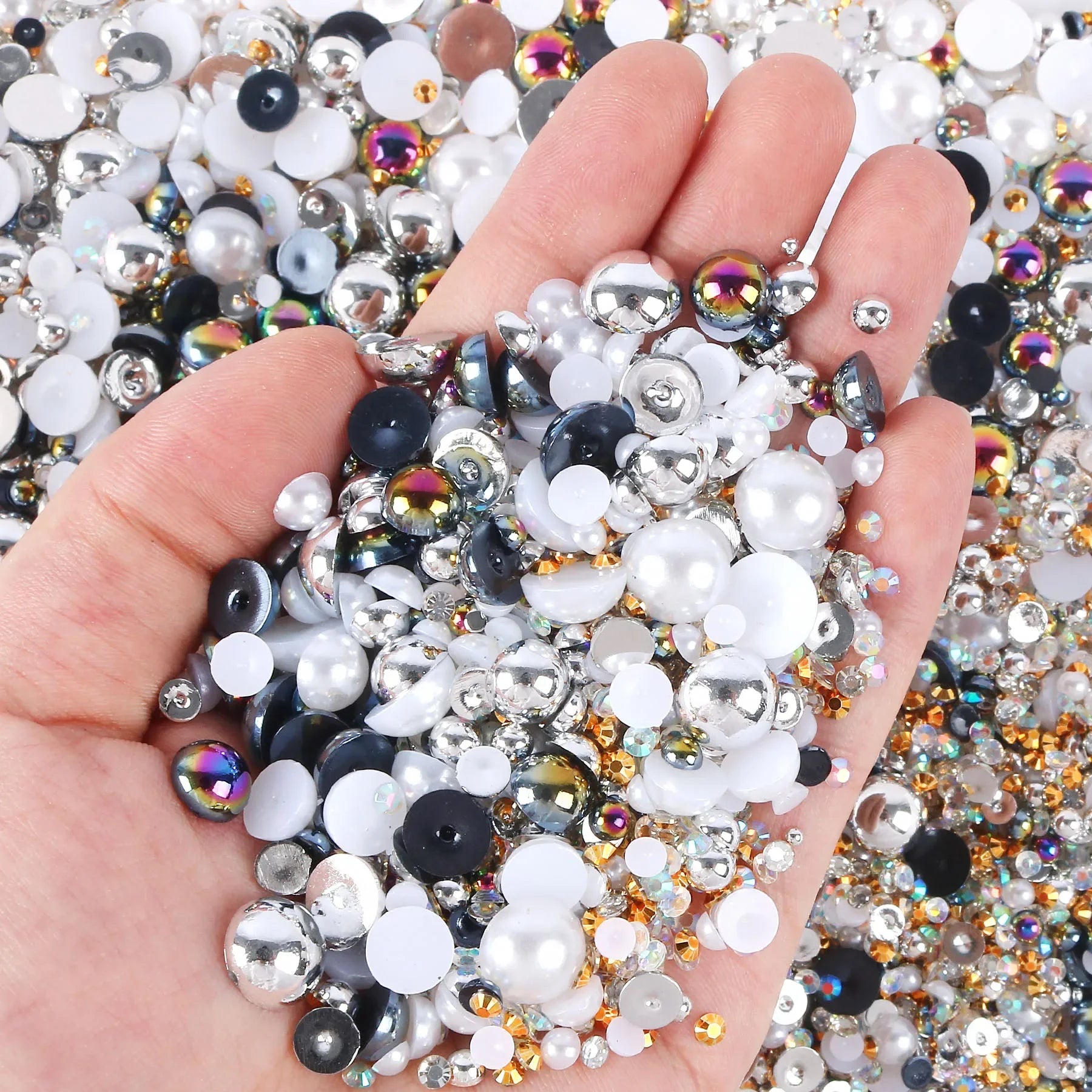 Packaging of either 30g or 150g with Flatback pearl imitation beads where the packaging is mixed in different sizes between 3-10mm. The packaging is also the colors in different shades. The beads are in acrylic and you need glue to attach them.