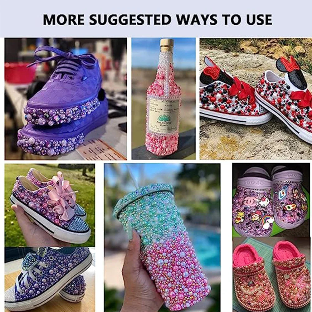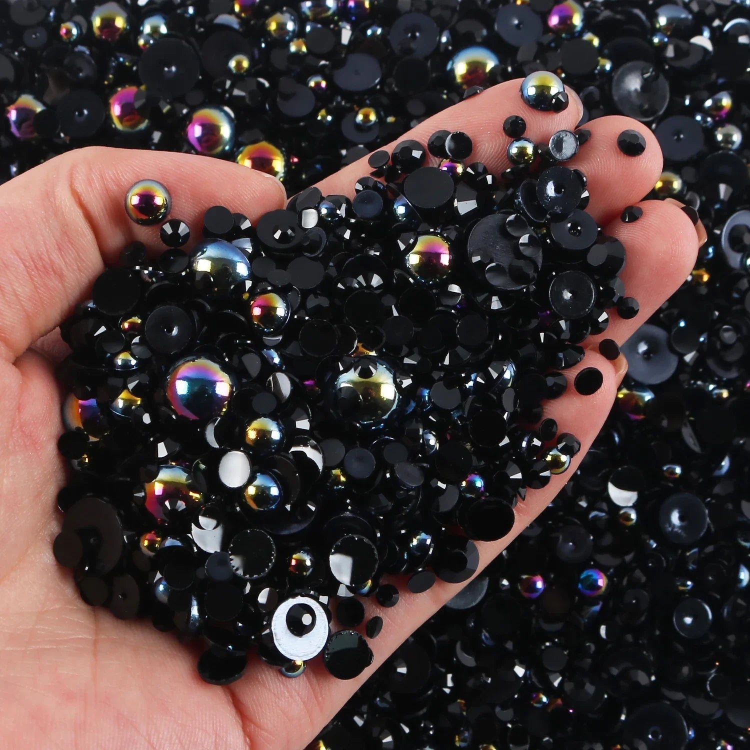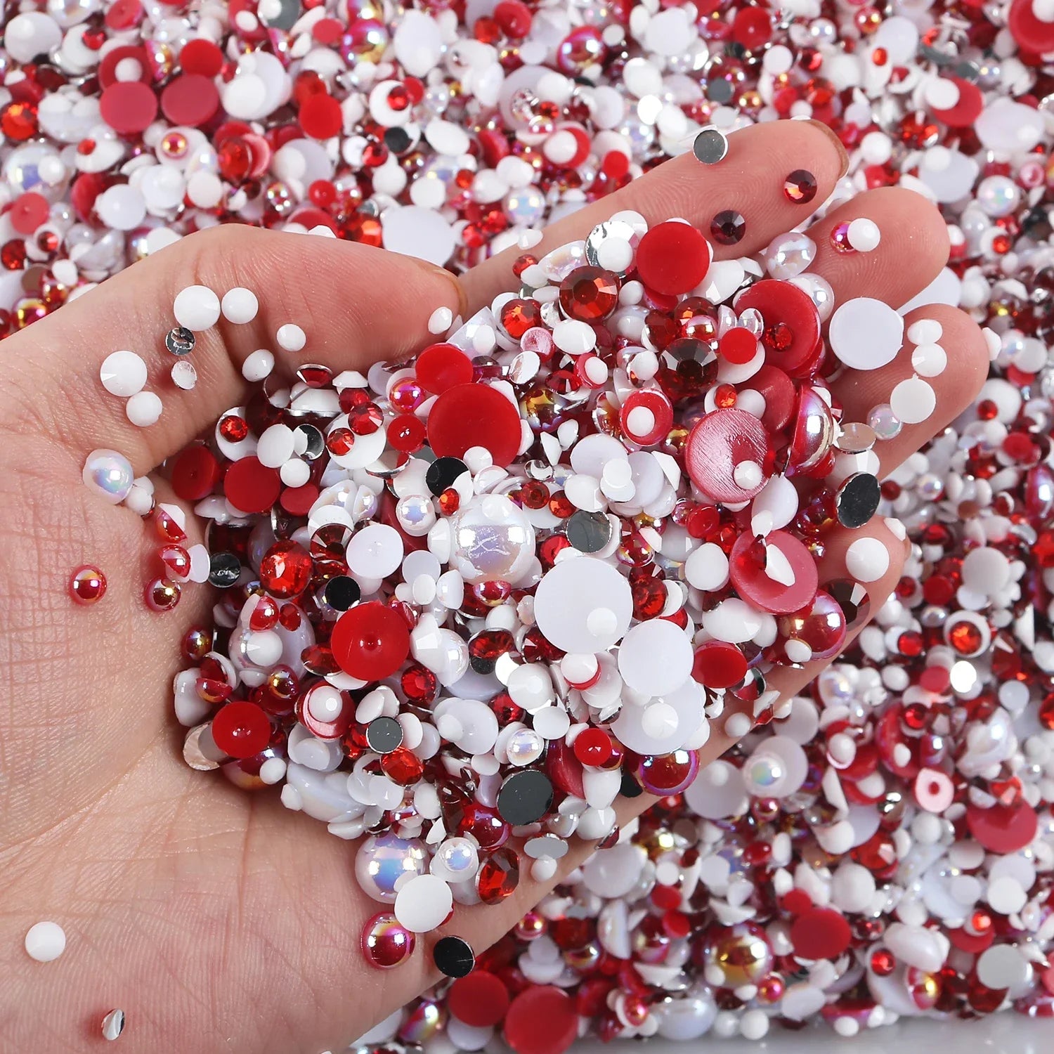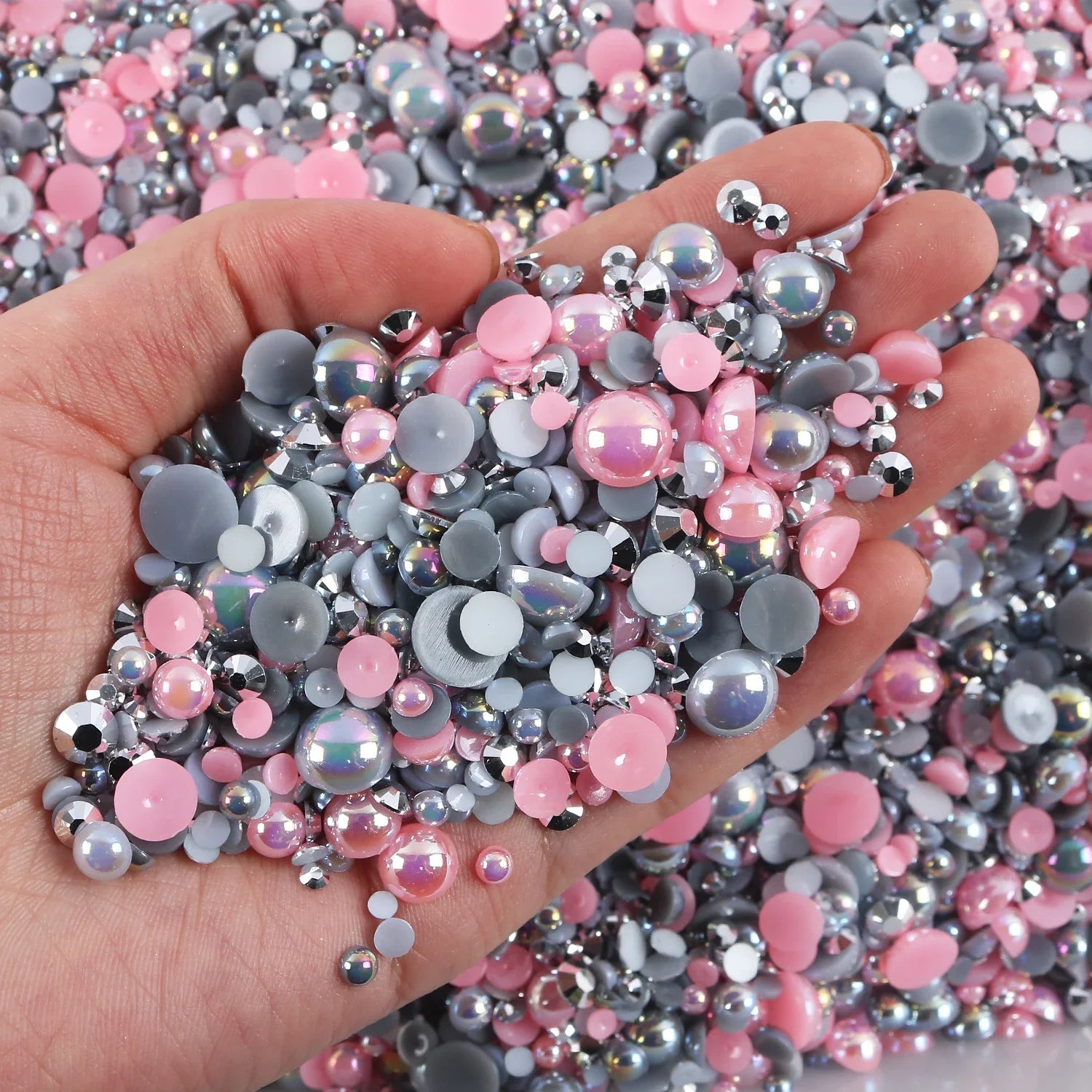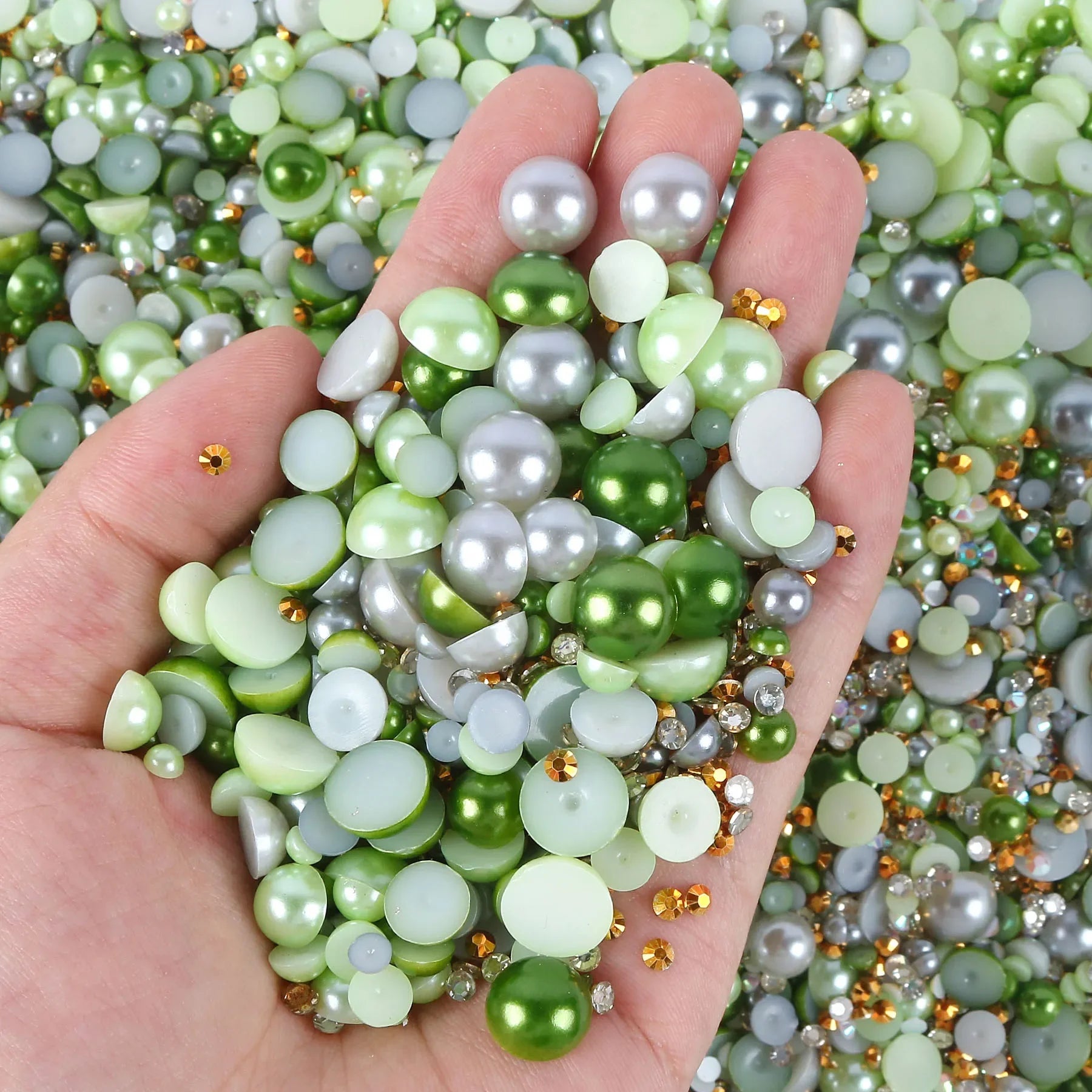 Packaging of either 30g or 150g with Flatback pearl imitation beads where the packaging is mixed in different sizes between 3-10mm. The packaging is also the colors in different shades. The beads are in acrylic and you need glue to attach them.