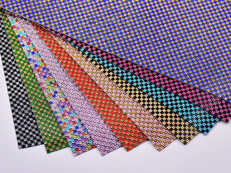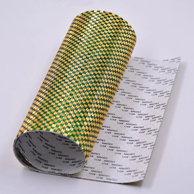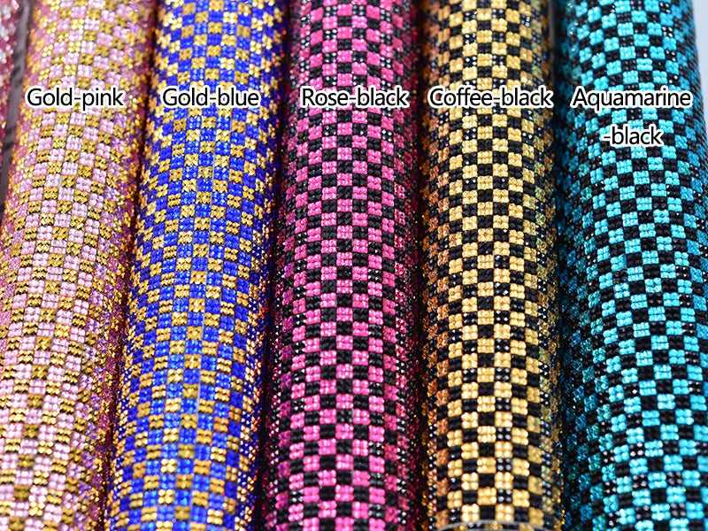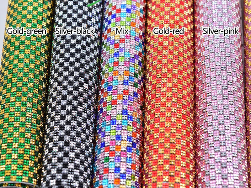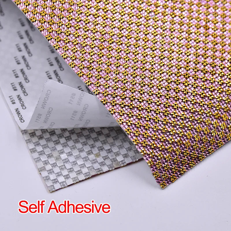 Sheets of rhinestone tape in a checkered pattern that are 24x40cm large and have a pre-glued back so you just remove the paper that sits over the adhesive and then attach them to fabric, plastic, metal, glass or cardboard. They can be cut with scissors and there are 5 different colors to choose from.