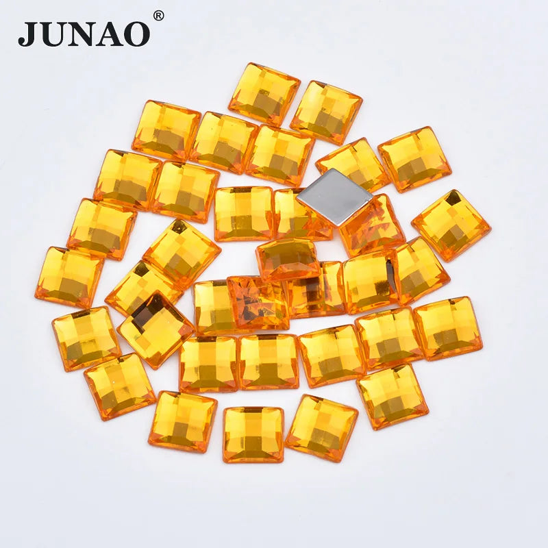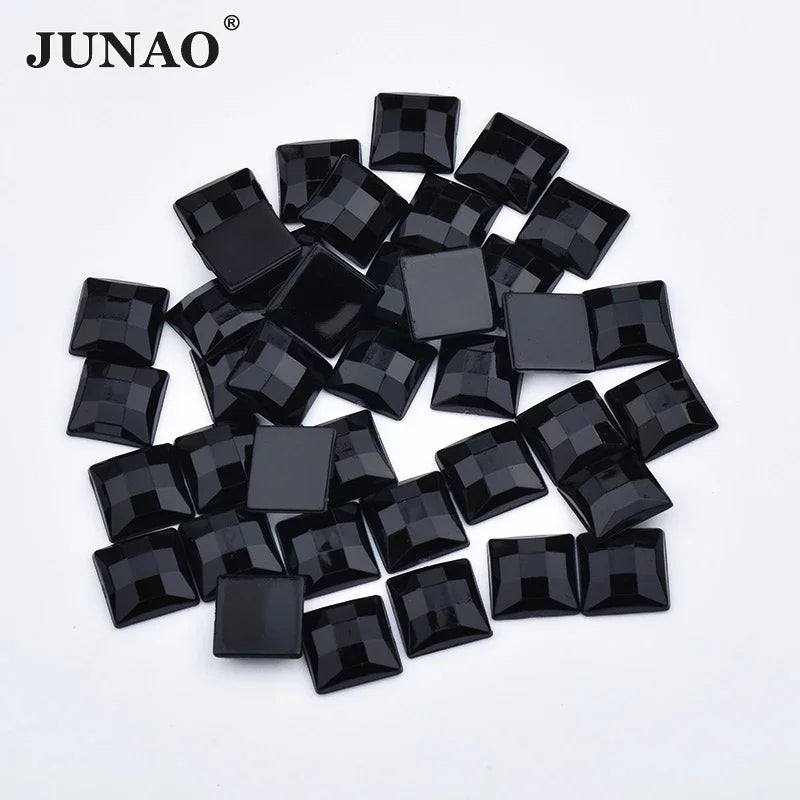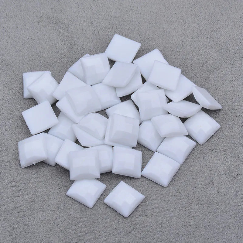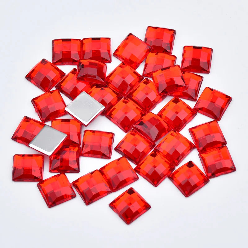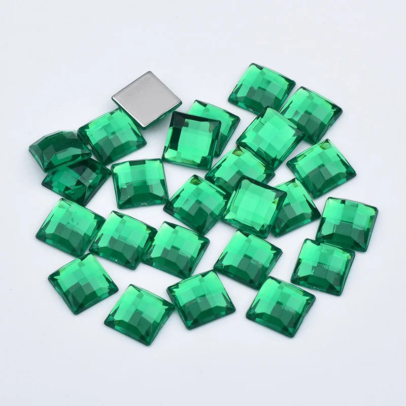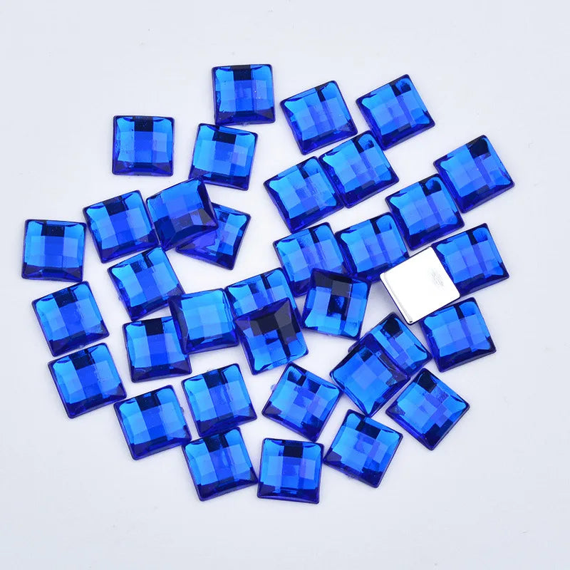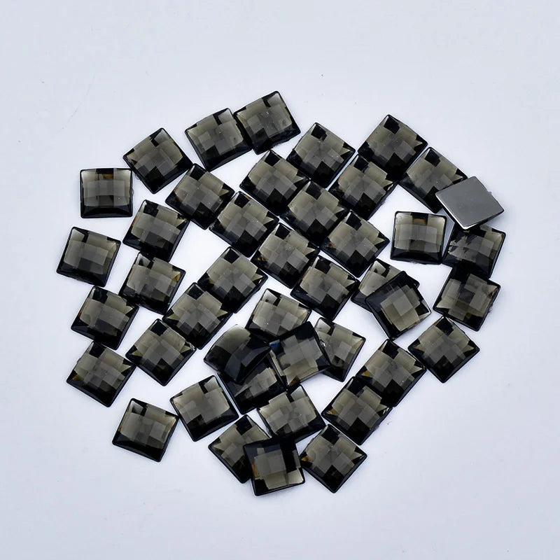Square rhinestone plates with a flat back and a faceted front in dimensions between 8-16mm.