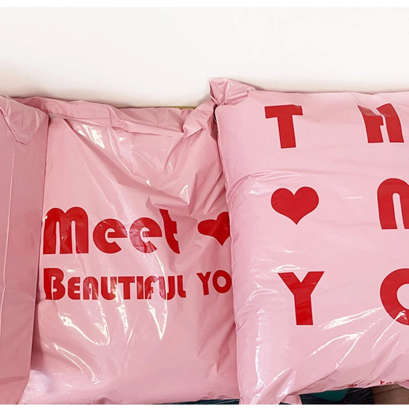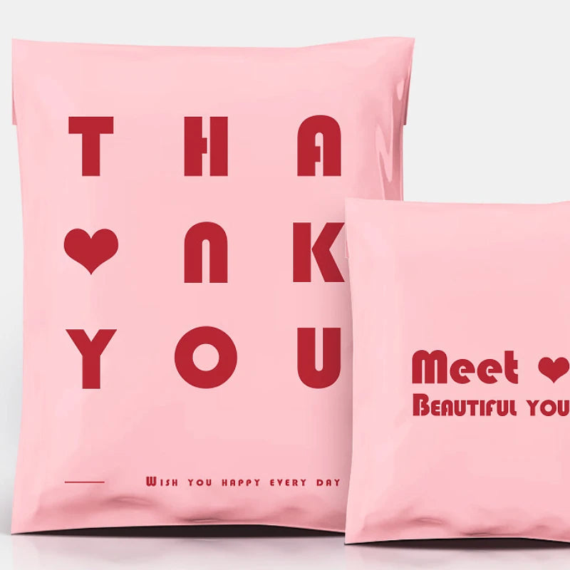 10 plastic shipping bags with adhesive at the top of the bag that you can easily remove the paper that is over the adhesive and then attach the bag. Bags that are waterproof and something you can ship things in. Pink bags with the text Thank you that can be chosen in different sizes.