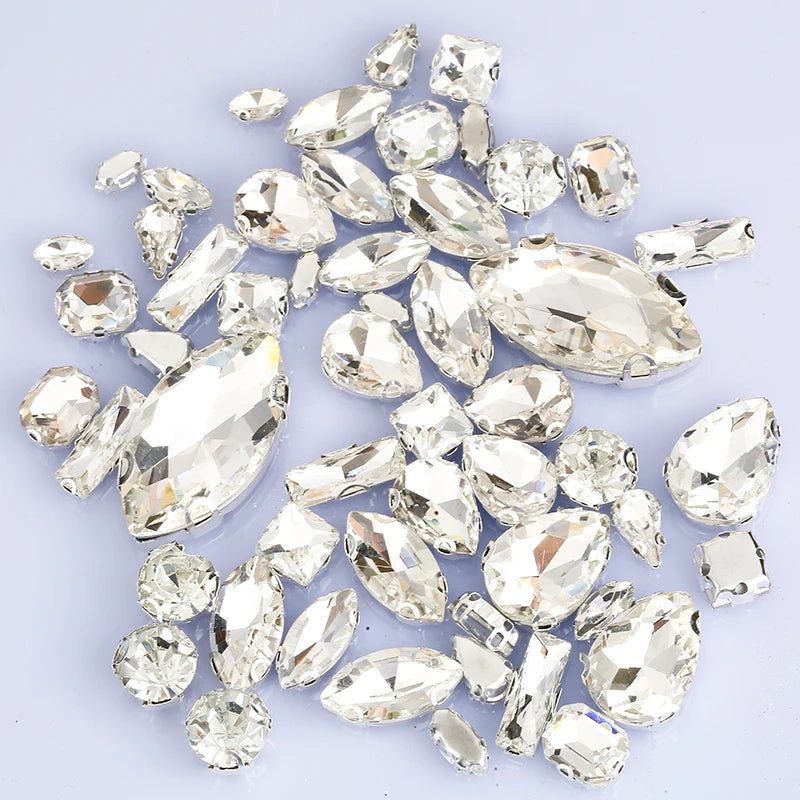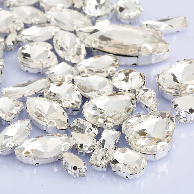 Förpackning med strass stenar i olika former som är i vit kristall liknade nyans med antingen silver eller guld färg på baksidan. Strass stenarna är i former som Hästöga runda rektangel och droppformade som även är olika stora. Dessa strass stenar syr man för att fästa dit dom på exempel kläder och skor