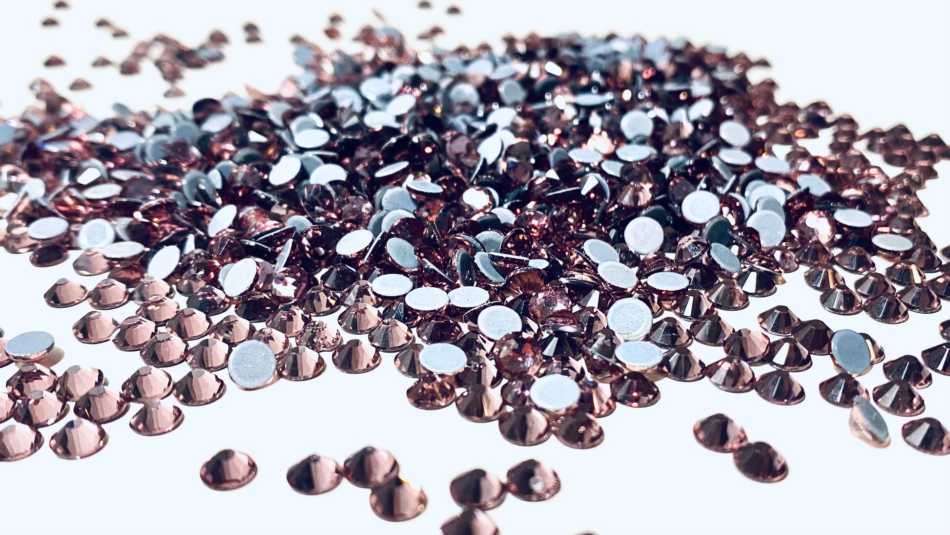 200 rhinestones with flat back and faceted front in the color Light Amethyst and are 4.6-4.8mm large and are made of glass. The stones are hot fix so to attach the stones you can use glue but also iron them with an iron