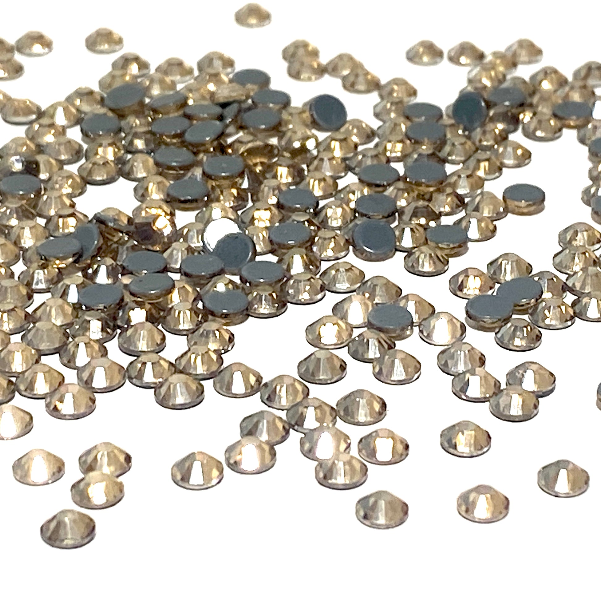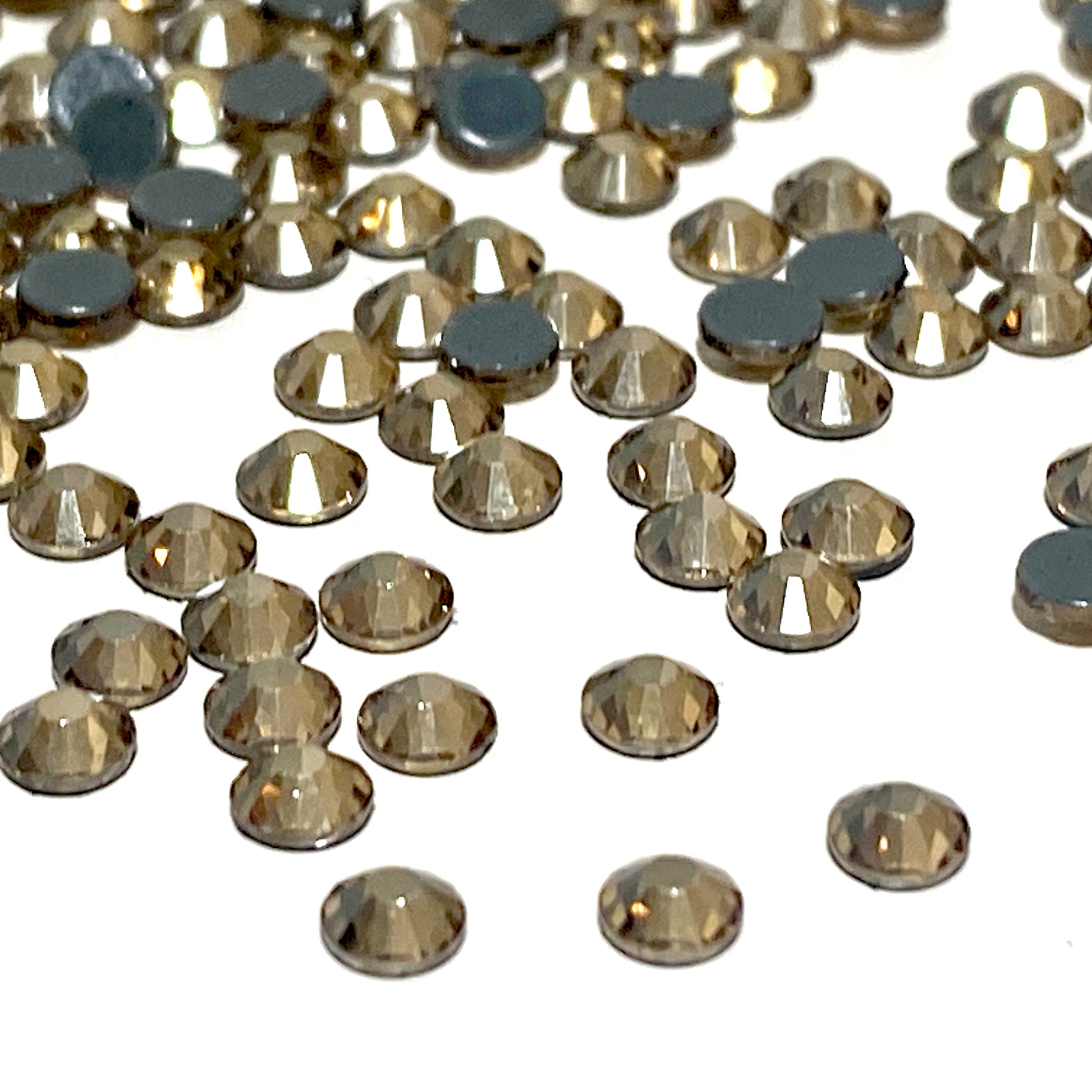 200 rhinestones with flat back and faceted front in the color Golden shadow which are 3.8-4.0mm in size. The stones are hot fix so in addition to using glue to attach the stones, you can also use an iron