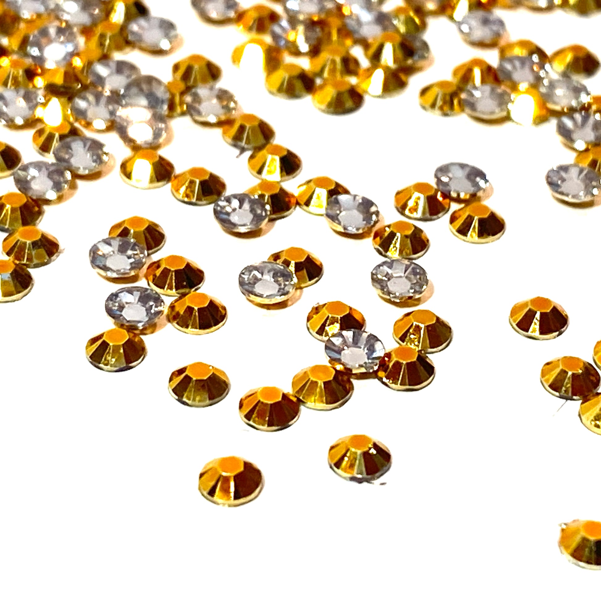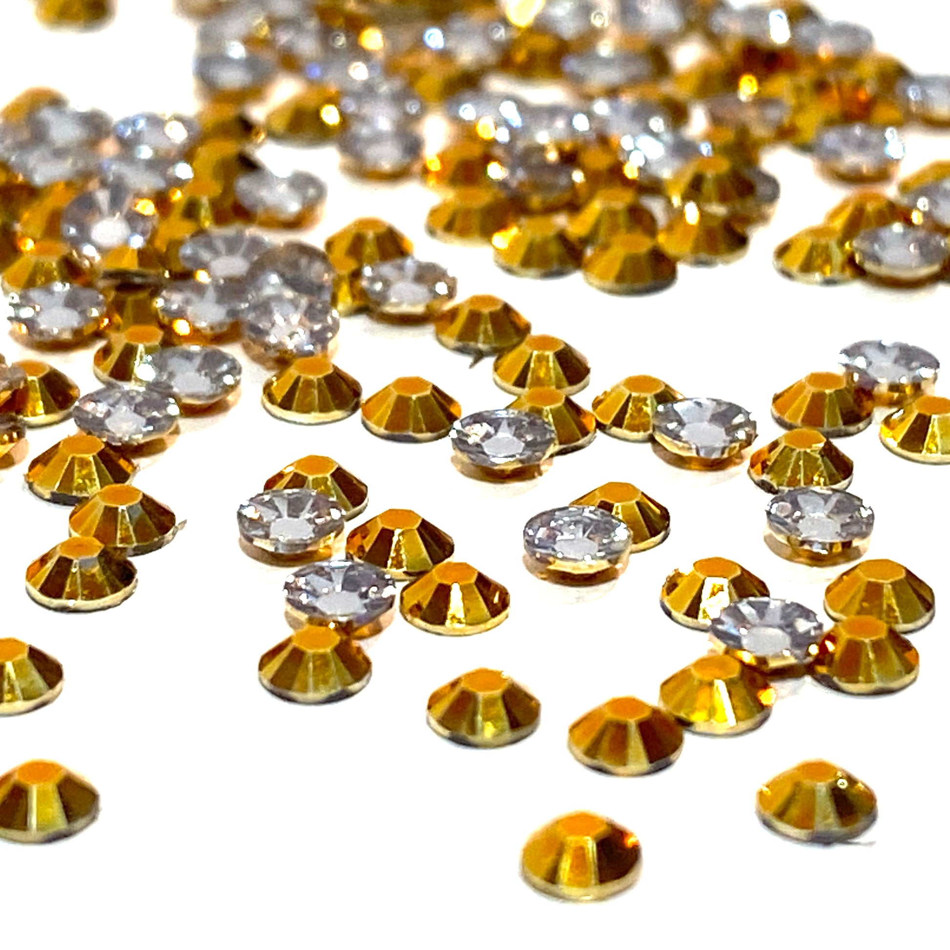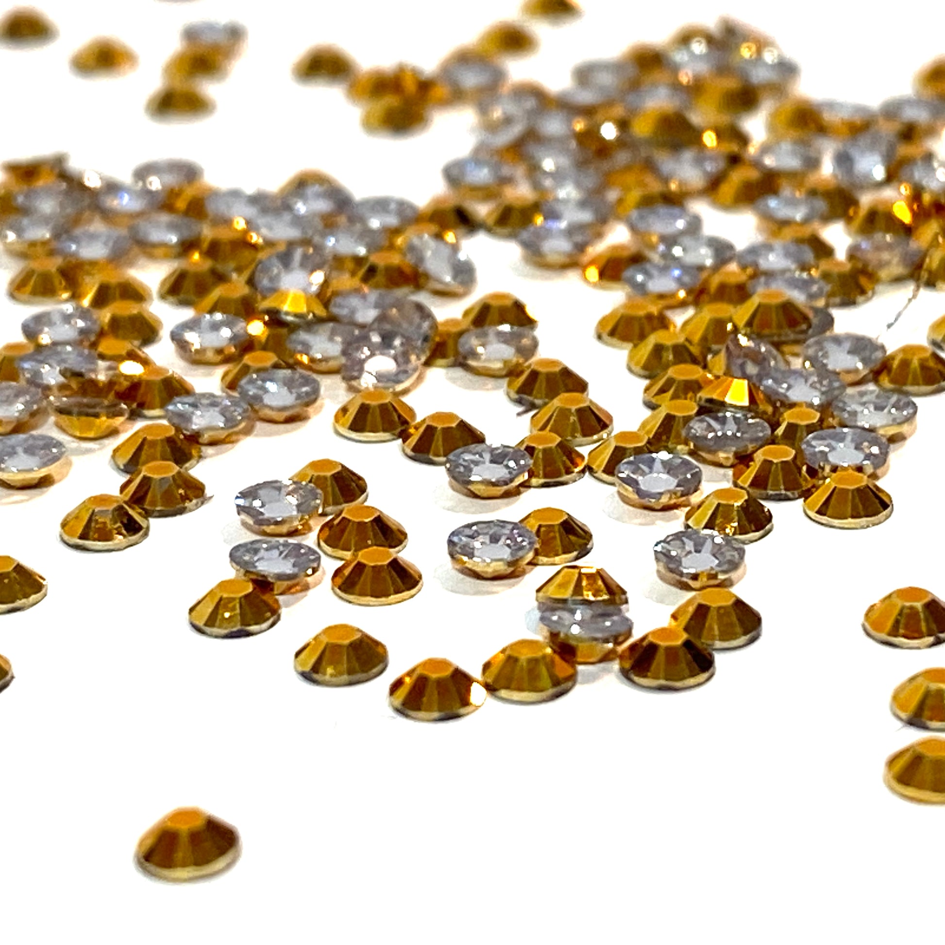 1000st strass stenar som är 3mm stora och har platt baksida med facetterad framsida i en guld färgad nyans och är gjord av resin så man måste använda lim för att fästa dit dom.