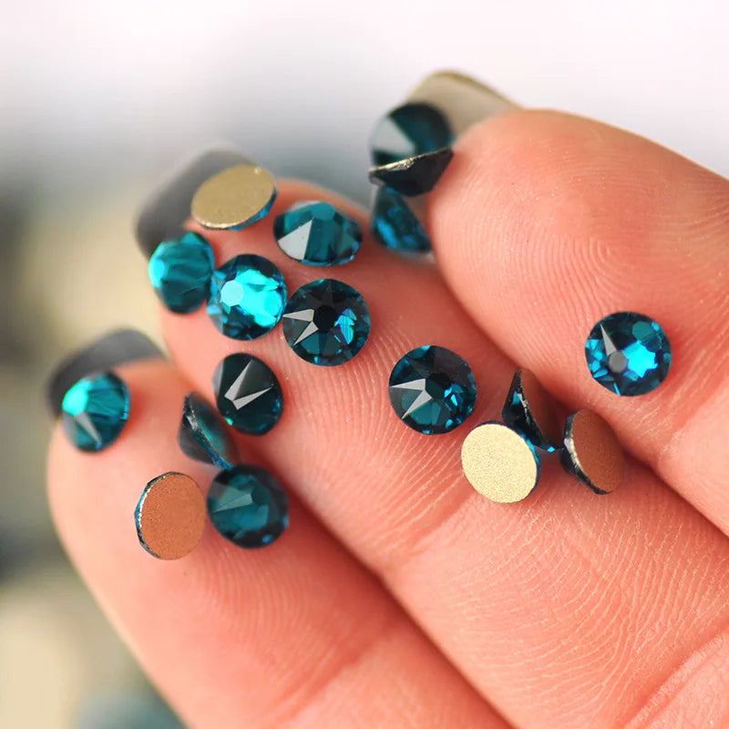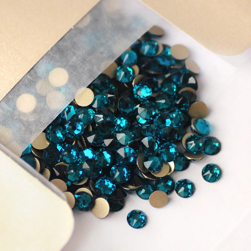 rhinestones Blue Zircon which are not hot fix which means that you have to use glue to attach the stones. The packages come in quantities of 288 or 1440 depending on which size you choose, the number in the package is after the choice of dimensions. There is a picture on the table to easily see how big the different dimensions are. They are rhinestones in high quality.