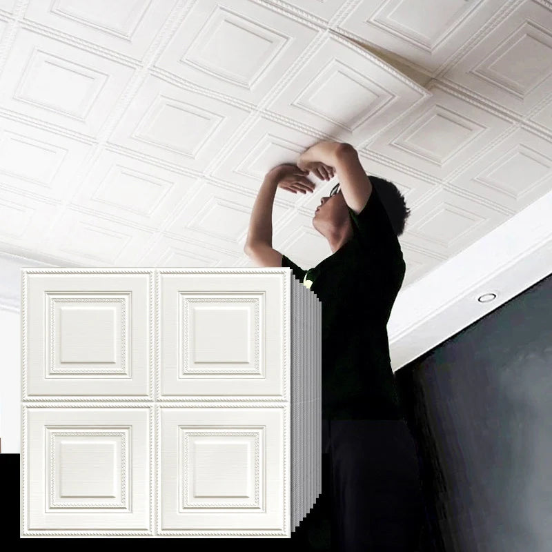 Självhäftande dekor plattor som är 70x70cm stora och har ett fyrkantigt mönster och är i vit färg. Dekor plattor du kan sätta på väggar eller tak som har en färdig klistrad baksida så du enkelt kan fästa dit dom utan att behöva limma innan. Torka bara av vägg och tak så de inte finns mycket damm och annat som kan första klistret på plattorna. För mer information se under specifikationer