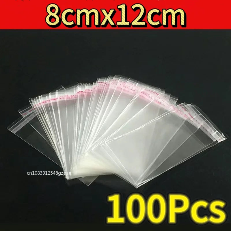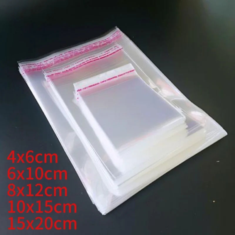100-pack cellofan påsar i olika storlekar. Transparenta påsar med färdig klistrad kant att frakta och förvara med.