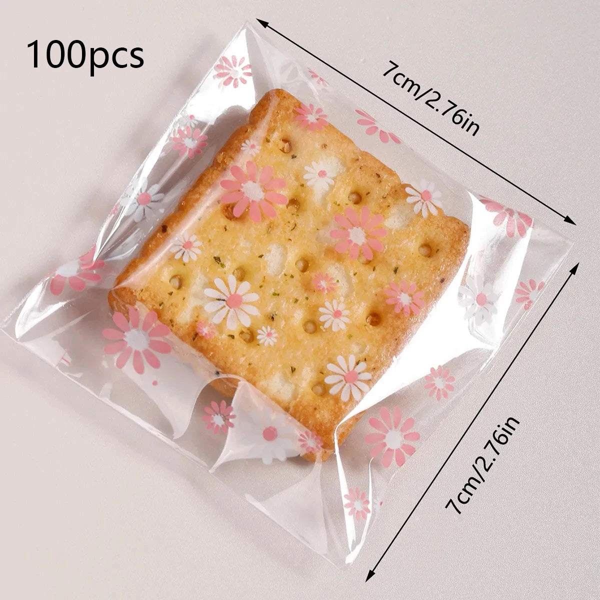 Förpackning med 100st fina cellofan påsar som är genomskinliga med rosa och vita blommor på. Påsarna har klister längst så man kan enkelt vika ner och förslutna påsarna. Påsarna är 7x7cm stora.