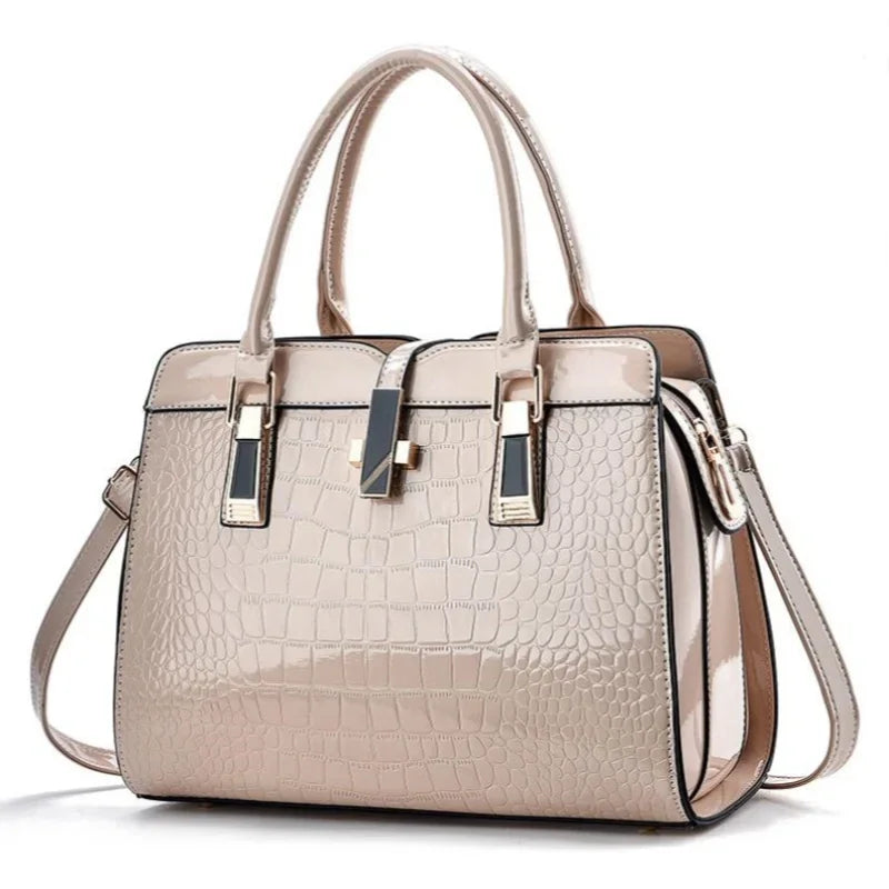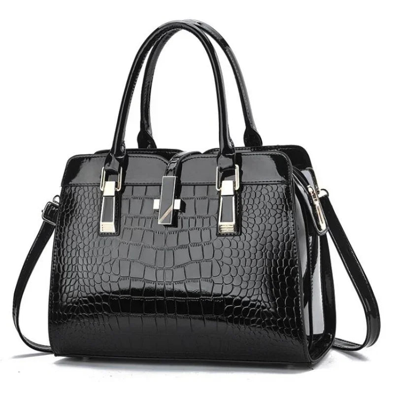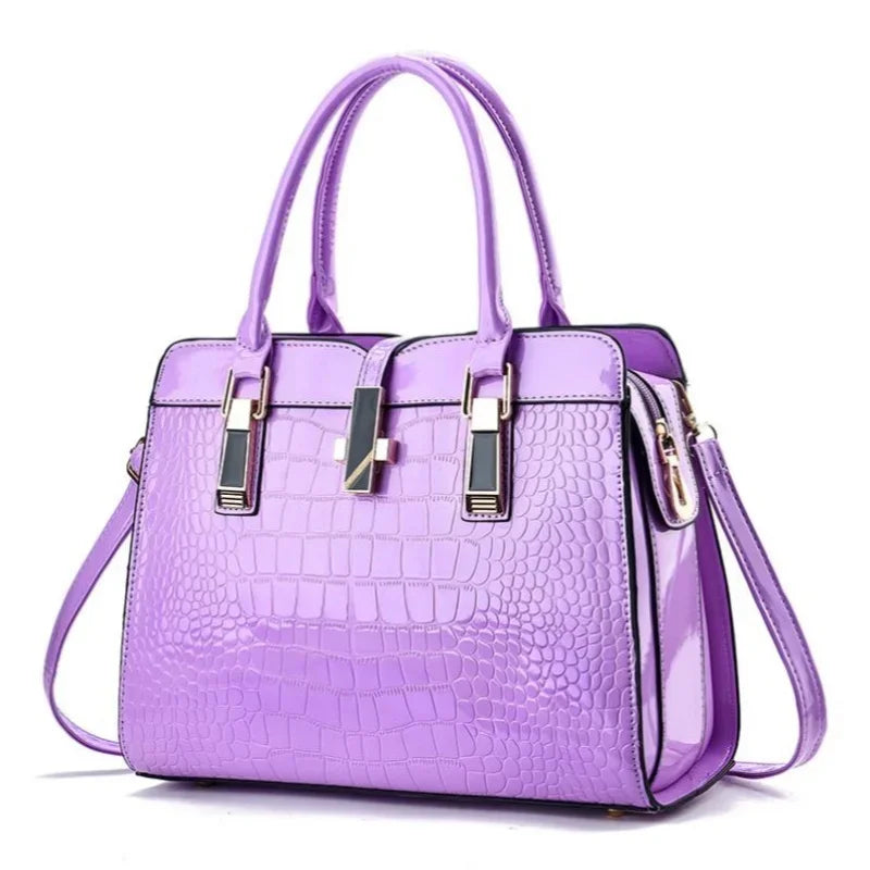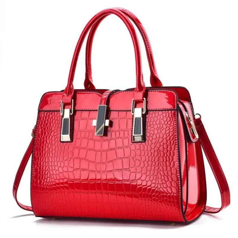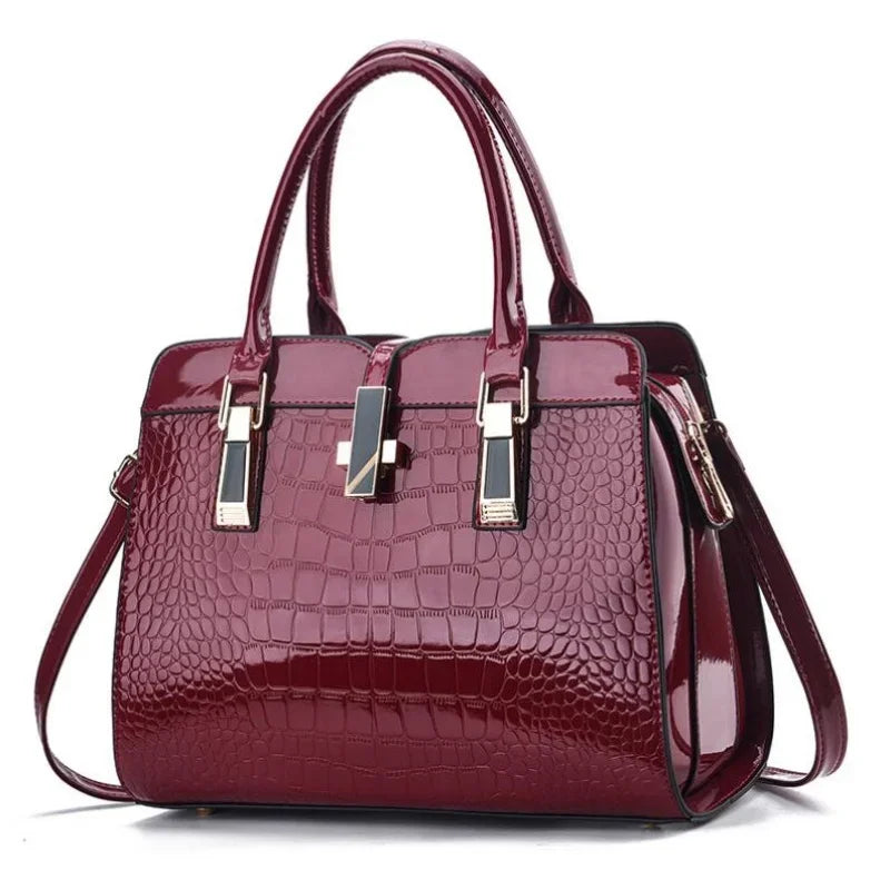 Elegant handväska i fast form med blank yta med krokodil mönster i snygga färger som Svart Khaki Grön Lila Röd Vinröd RoseRöd Vit. Väska med metall spänne i handtagen och över öppningen. Har dragkedja med linning i polyester och har flera fack för förvaring inuti.