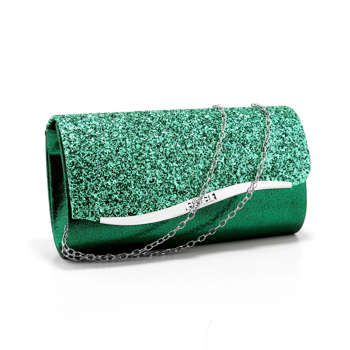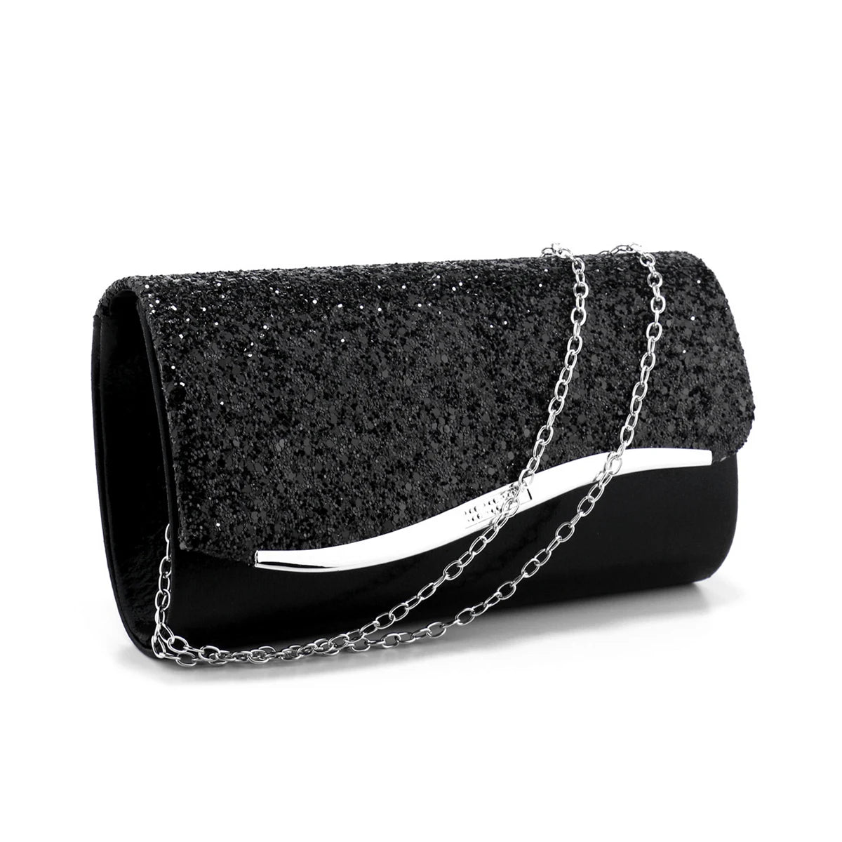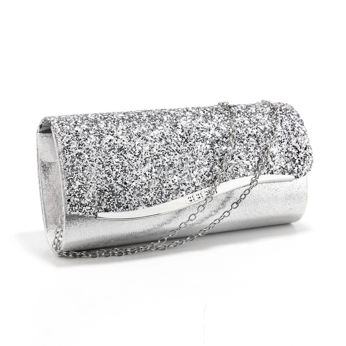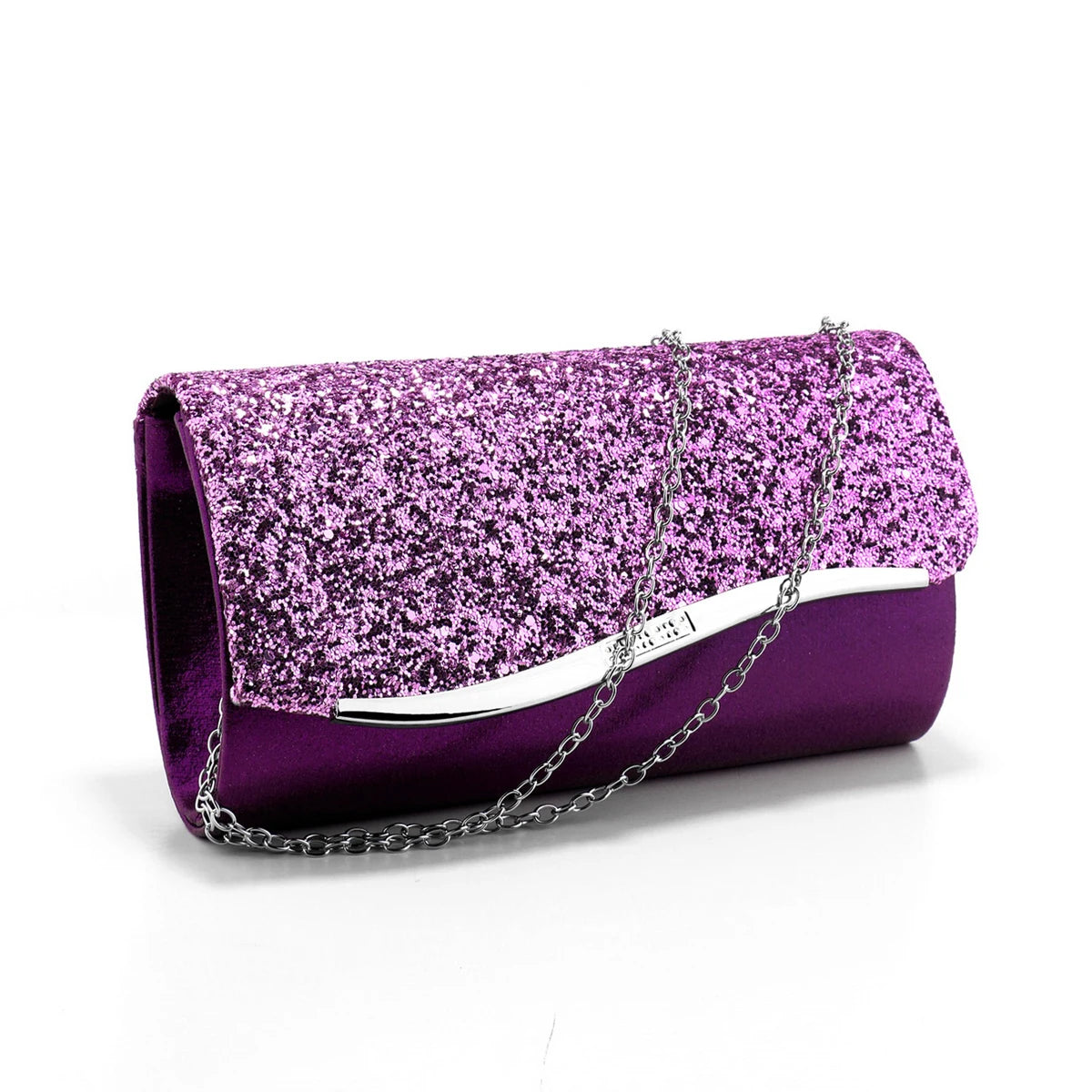 Handväska med slät glittrande tyg och en Ljusguld metall ram och ovanför täckt med små glitter stenar.