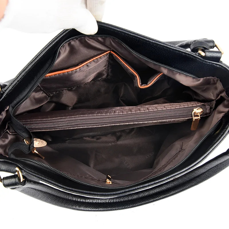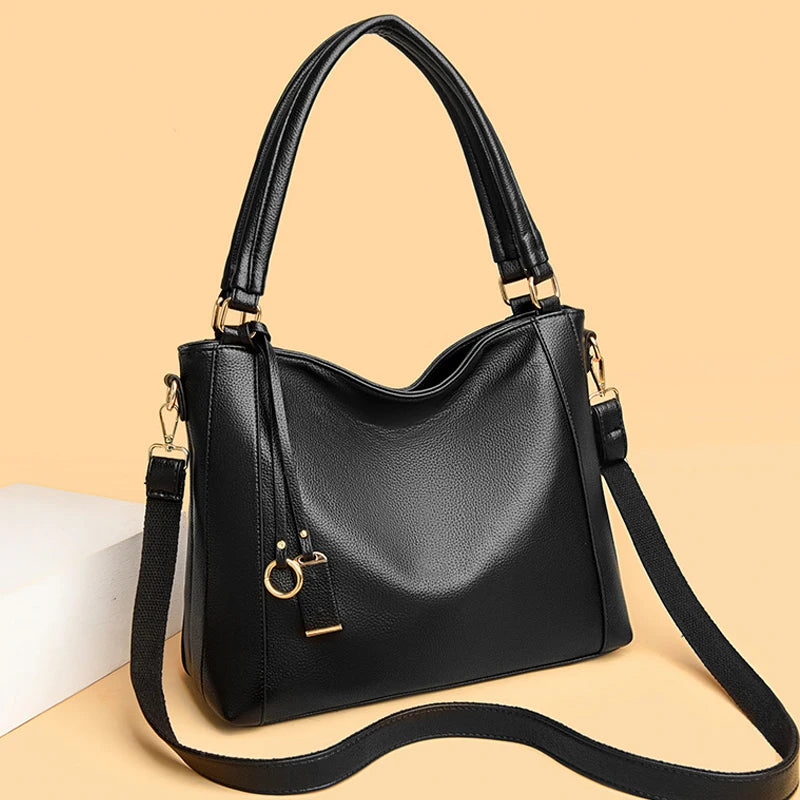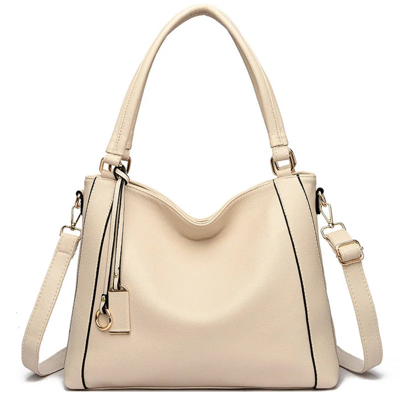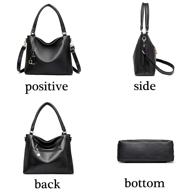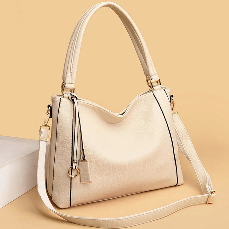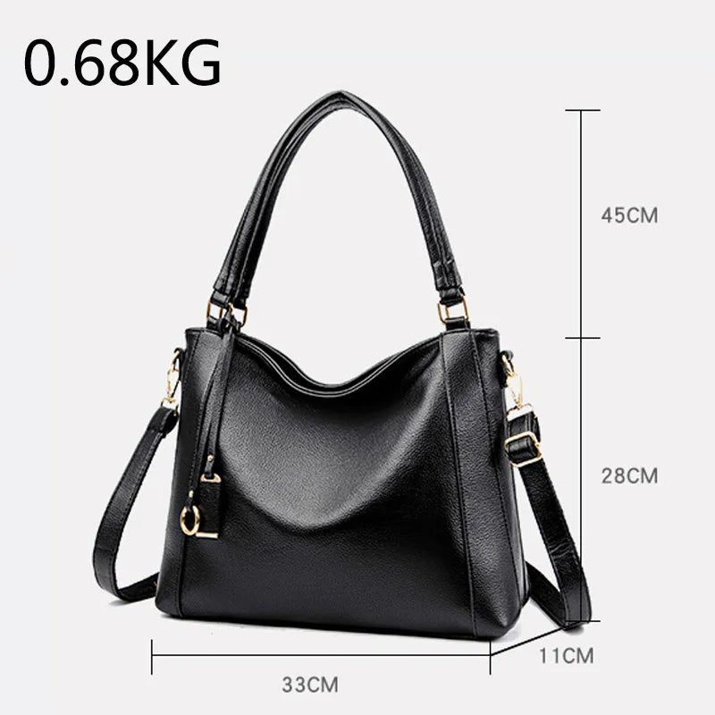 Mode design väska av hög kvalite i läder med linning i polyester , axelband och handtag, drag kedja . Kan välja i svart khaki Ljusbrun vit och blå . 33cm längd 28cm höjd .