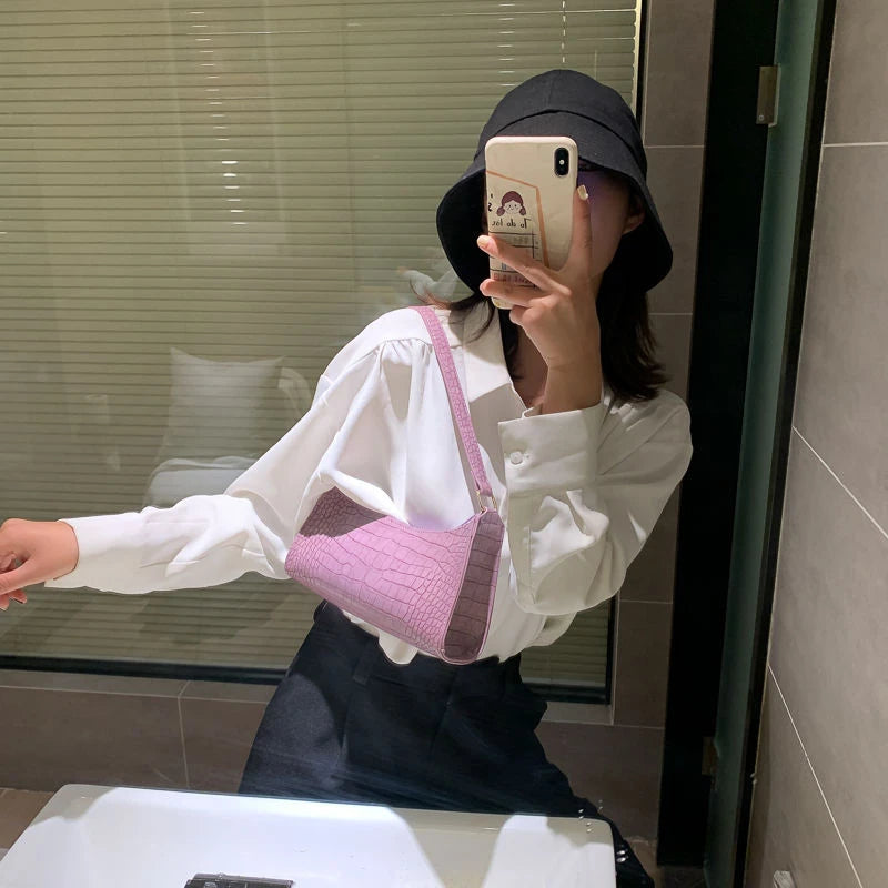 Liten handväska i Pu läder med krokodil liknande mönster som du kan välja i färgerna Vit Lila Svart . väskan är 24cm lång och 15cm hög . Väskan har dragkedja och materialet i linningen är gjort av polyester.