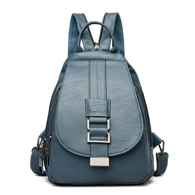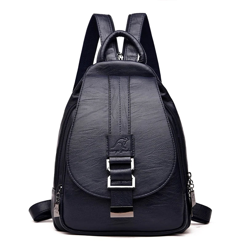 Snygg ryggsäck i äkta Läder med 2 dragkedjor och metall spänne på framsidan. Linningen i fint material med läckert mönster och har många olika fack.