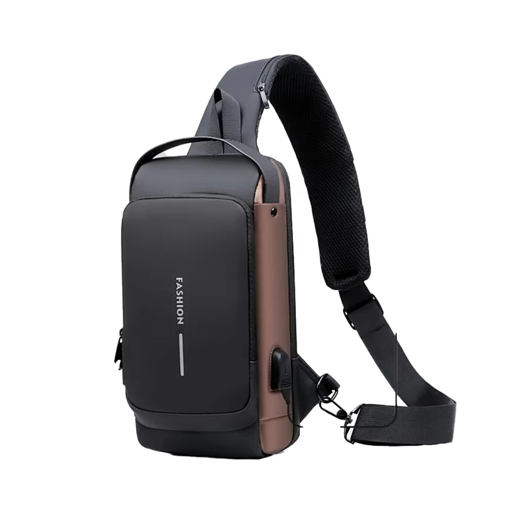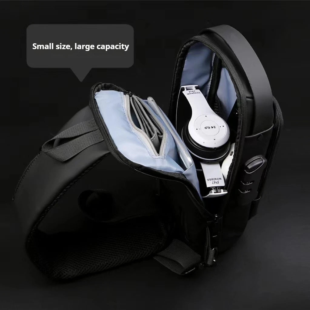 KoAxelväska med lås och USB uttag samt utgång genom väskan för hörlurar. Liten väska för mindre packning som passar till både män och kvinnor. En perfekt smidig väska att bära när du går ,cyklar och behöver mindre packning som telefon nycklar och pengar.