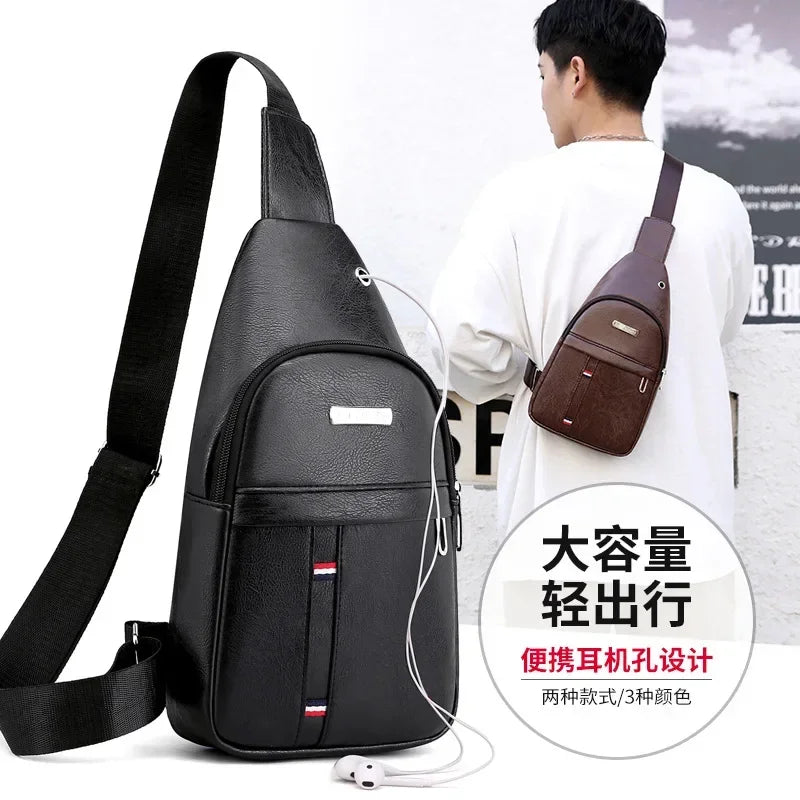 Multifunktionell väska med USB laddare och hål för att trä ut sladd för hörlurar . Väska som är vattentålig och finns i brun eller svart . Man sätter väskan över ena axeln och under armen på andra sidan.