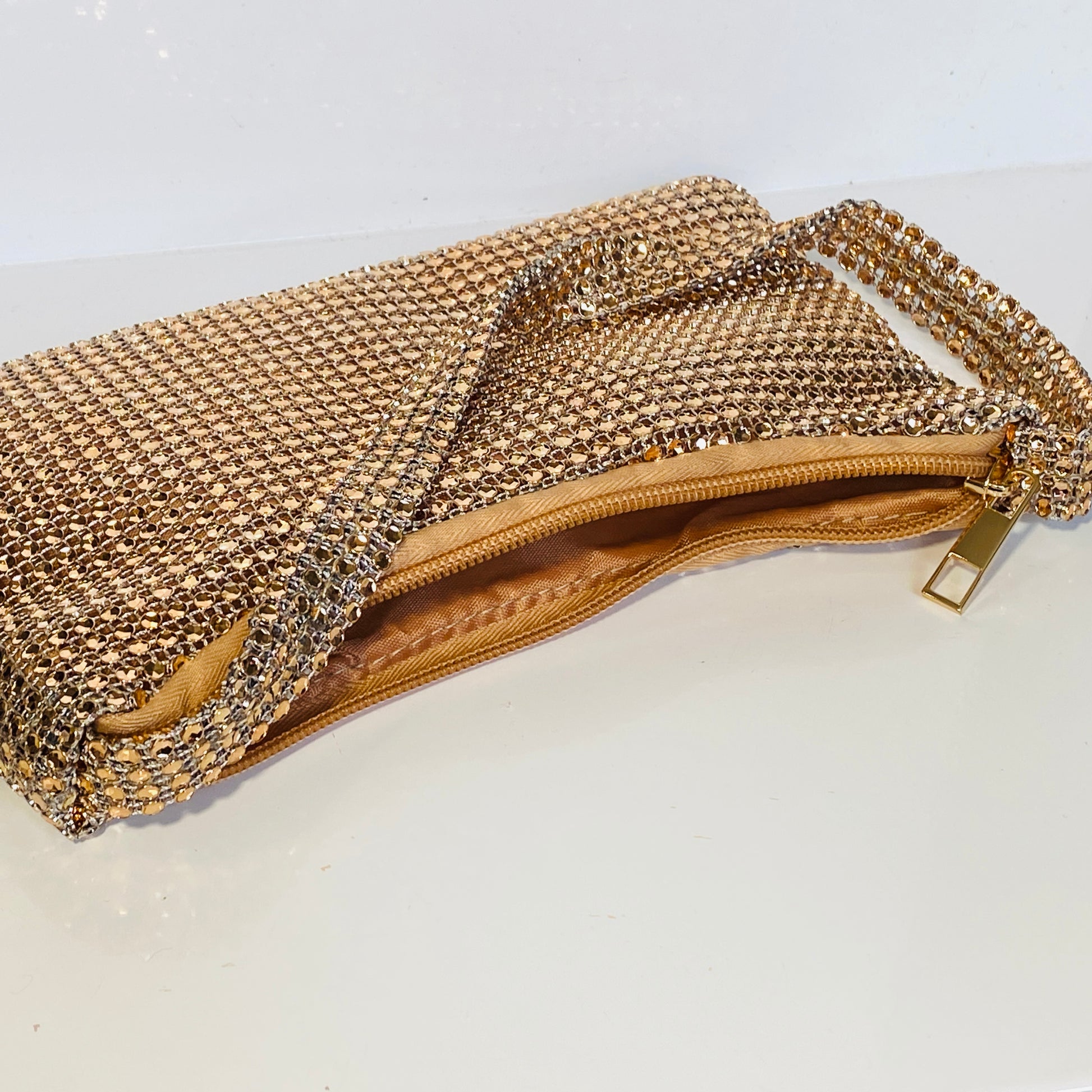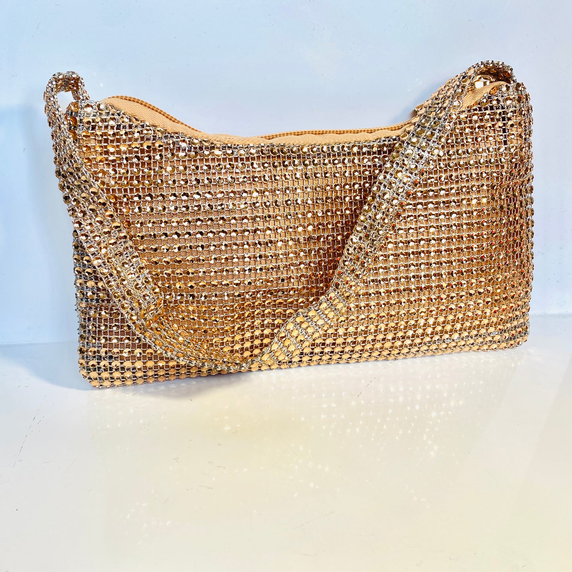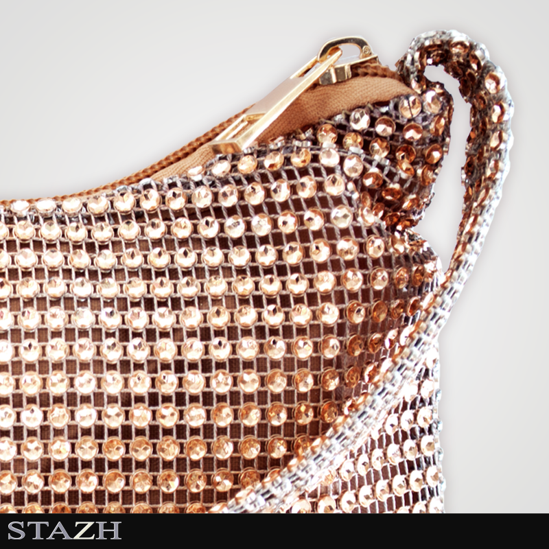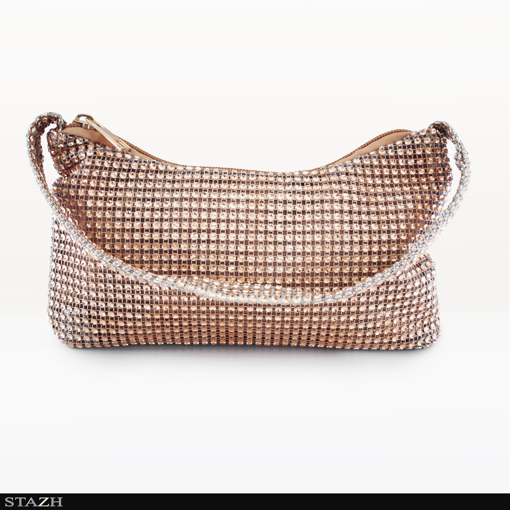 Utforska denna eleganta handväska som är smyckad med strass stenar i en vacker champagnefärg. Väskan är perfekt för kvällsaktiviteter och har en praktisk dragkedja för säker förvaring.