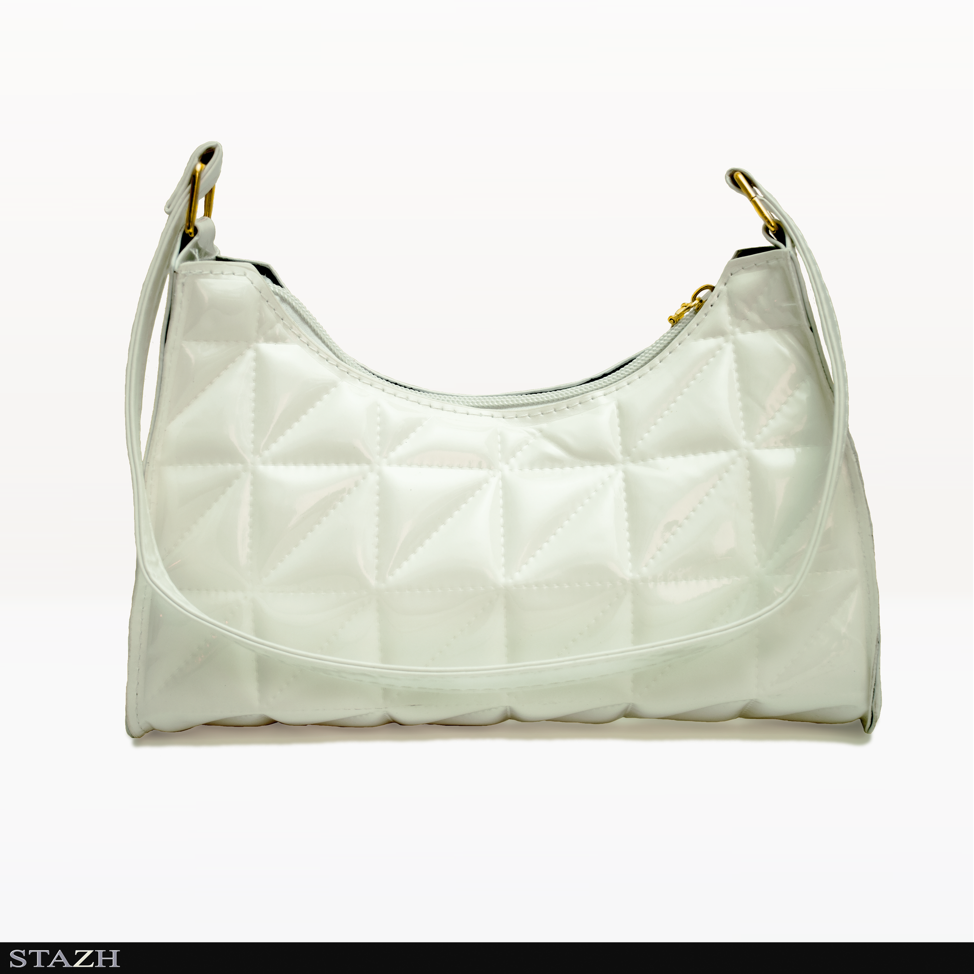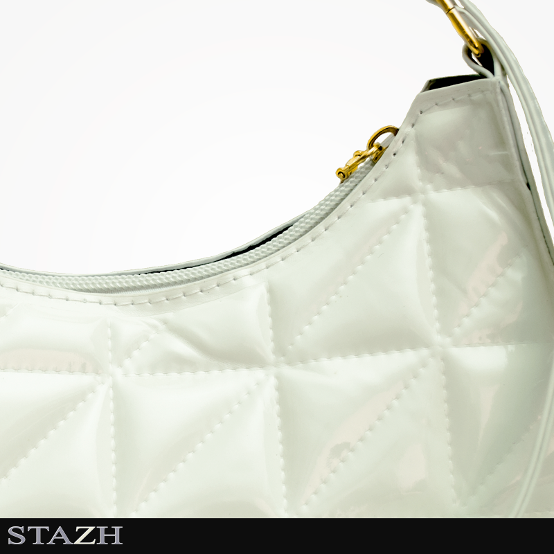 Utforska vår kollektion av eleganta handväskor med denna vadderade, blanka och sömmade vita design. Handväskan har kortare handtag och en praktisk dragkedja för säker förvaring.